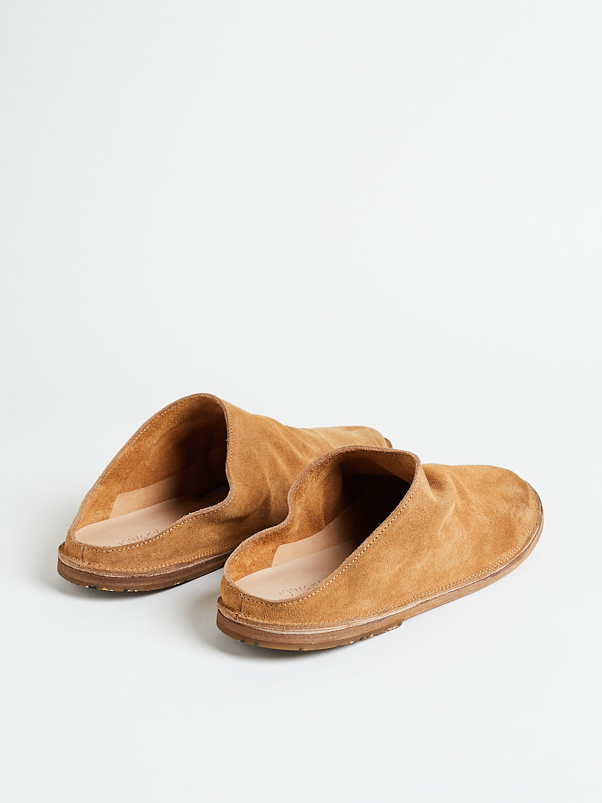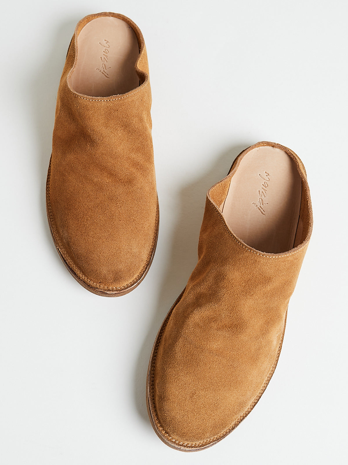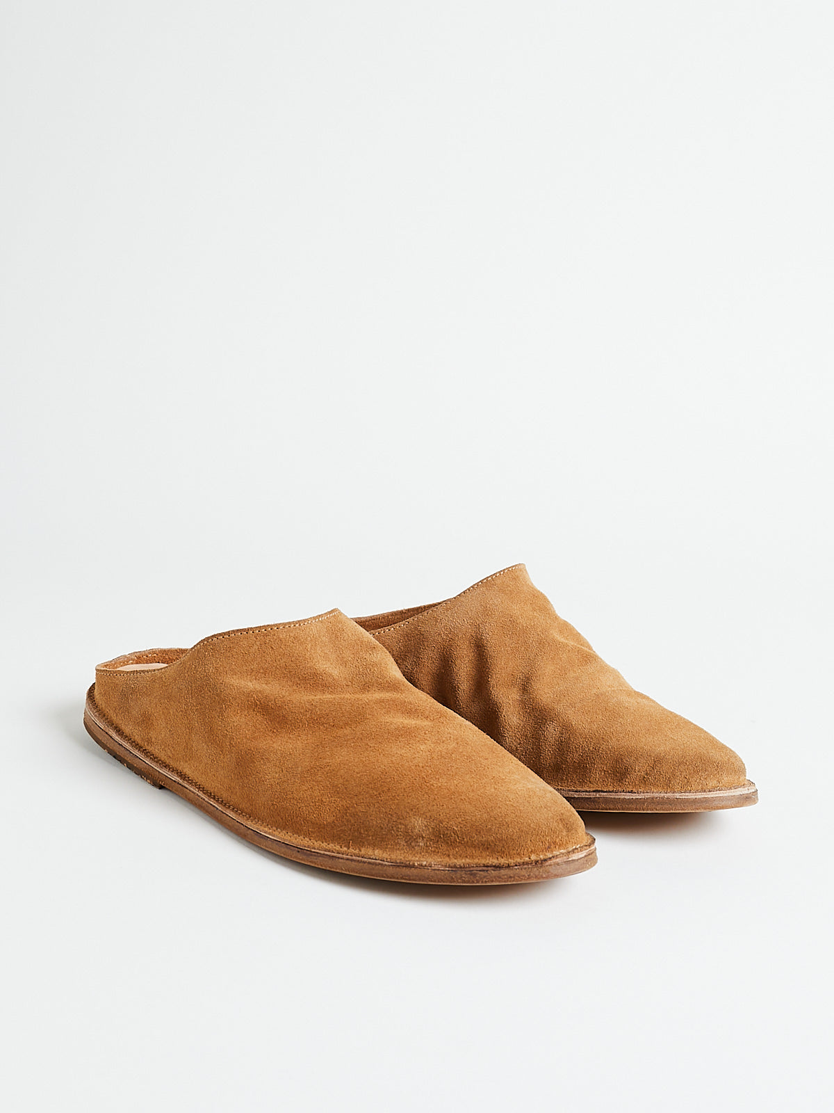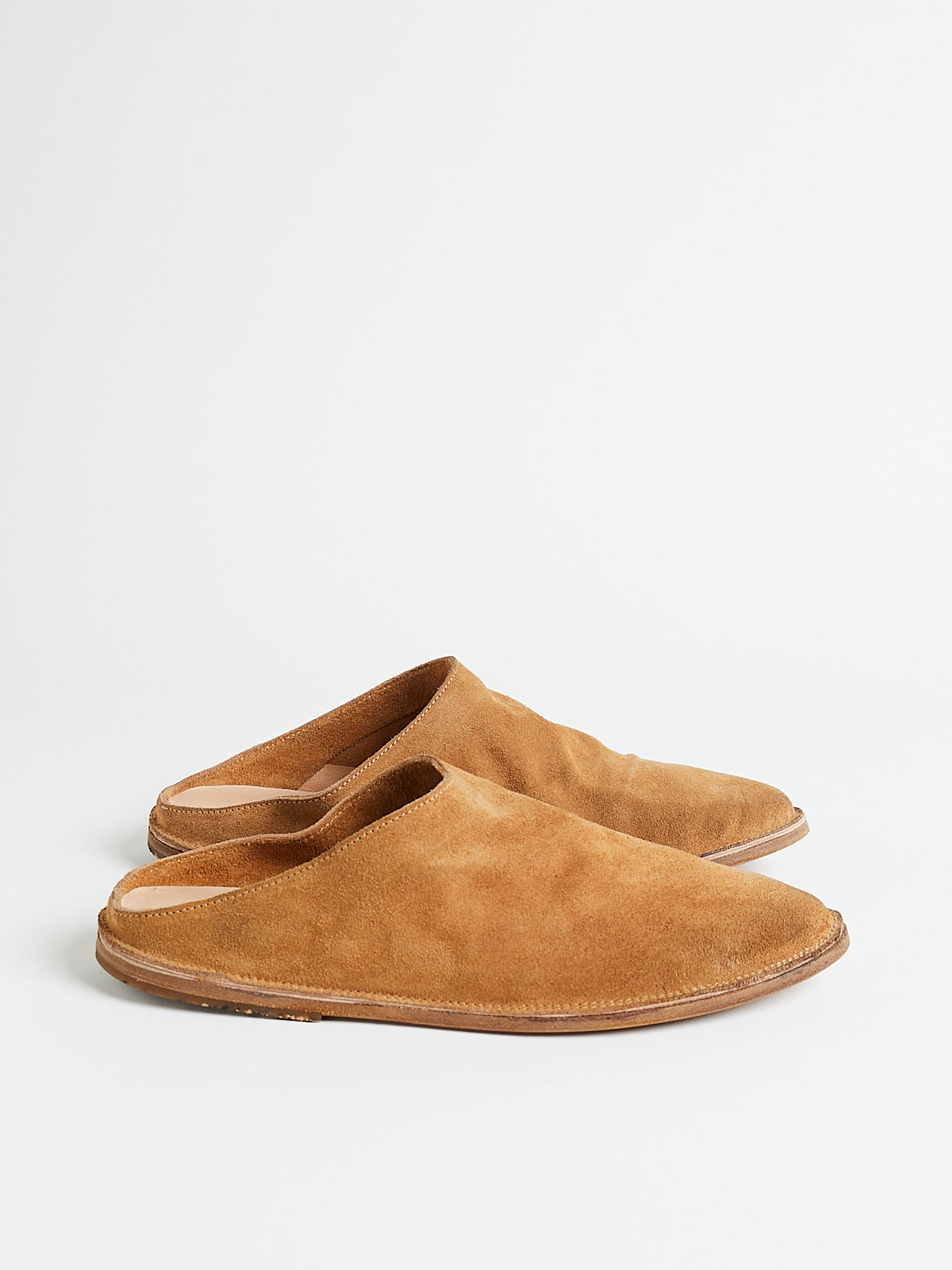 Mule clog in tan brown suede calf leather. This shoe was produced using the unique Sacchetto Esterno construction, in which the pouch-like structure created by the insole is visible on the outside of the shoe. Features a thin outsole made with hand-coloured natural leather with recycled rubber on the heel.