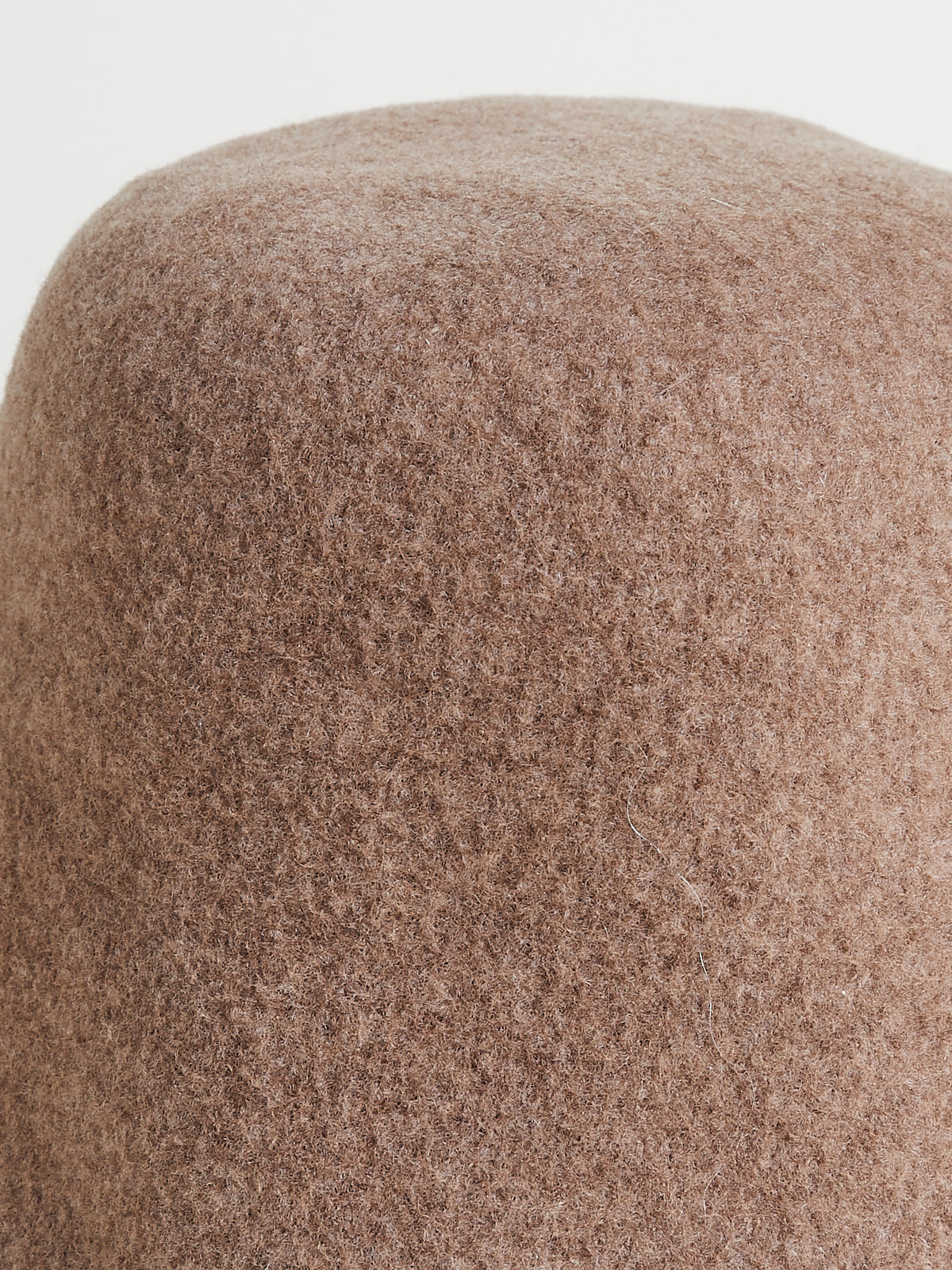 Knitted bell hat in light brown soft felted lambswool/cashmere. Brim can be worn up or down. This hat can be folded.