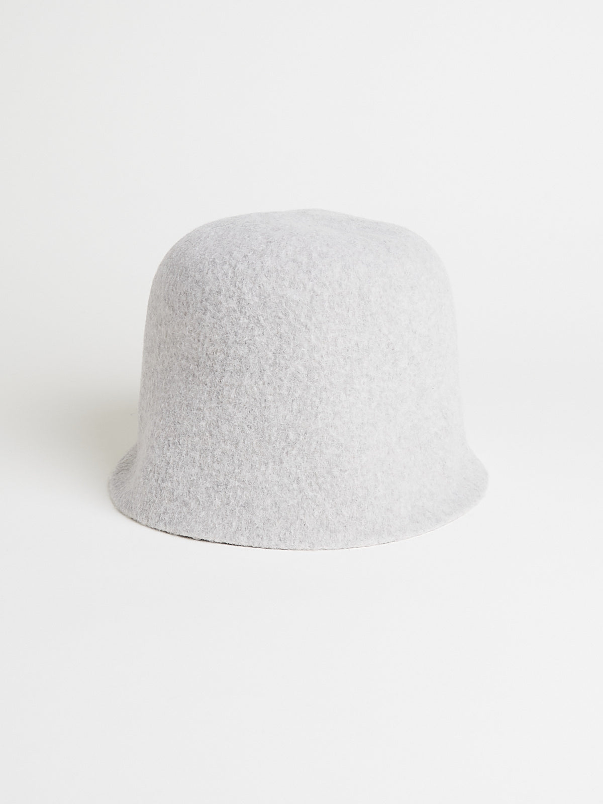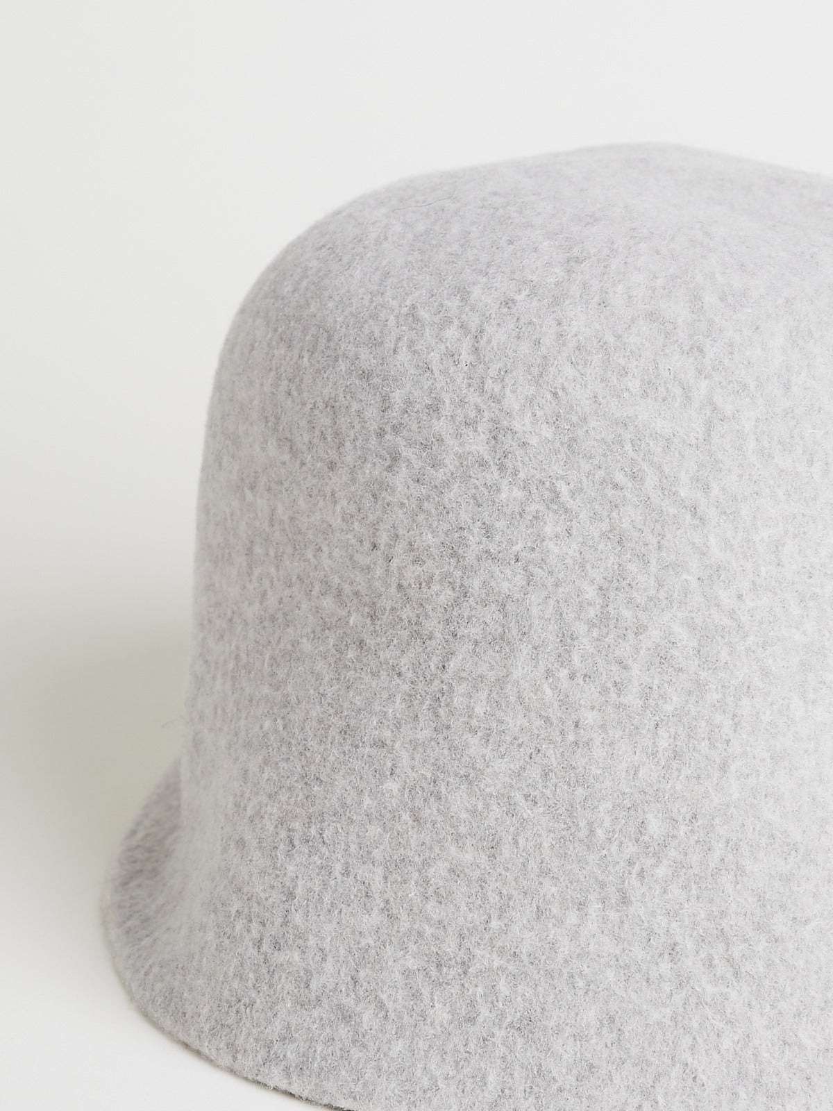 Knitted bell hat in light grey soft felted lambswool/cashmere. Brim can be worn up or down. This hat can be folded.