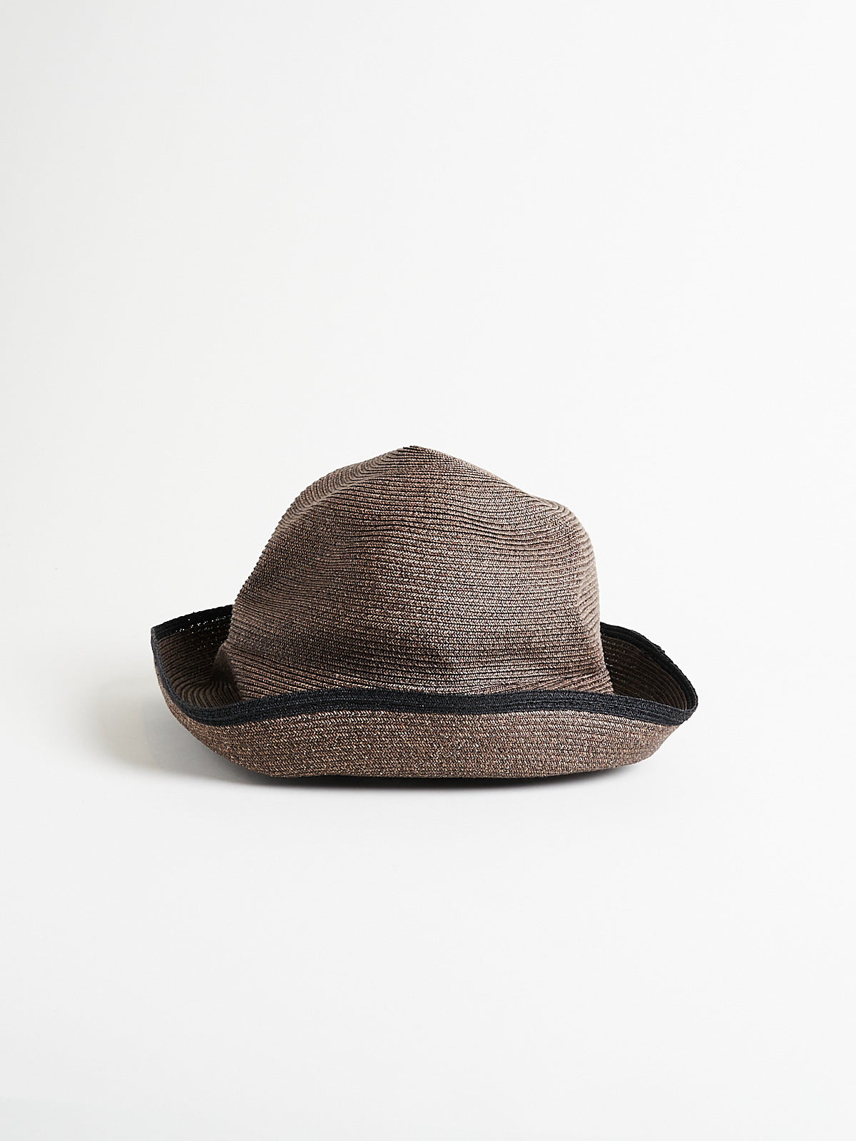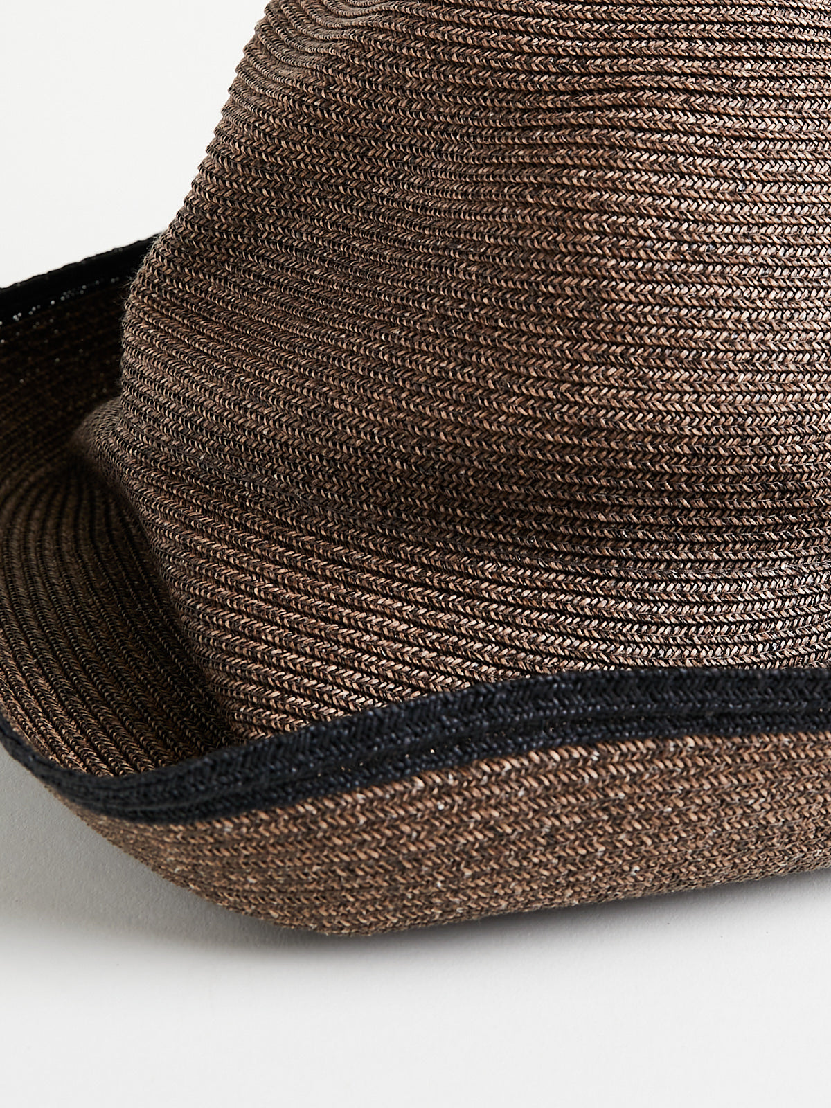 A foldable and packable hat made from a dark brown paper blend. Features a 11cm brim and a thin black edge detail around the brim. A perfect hat to travel with.