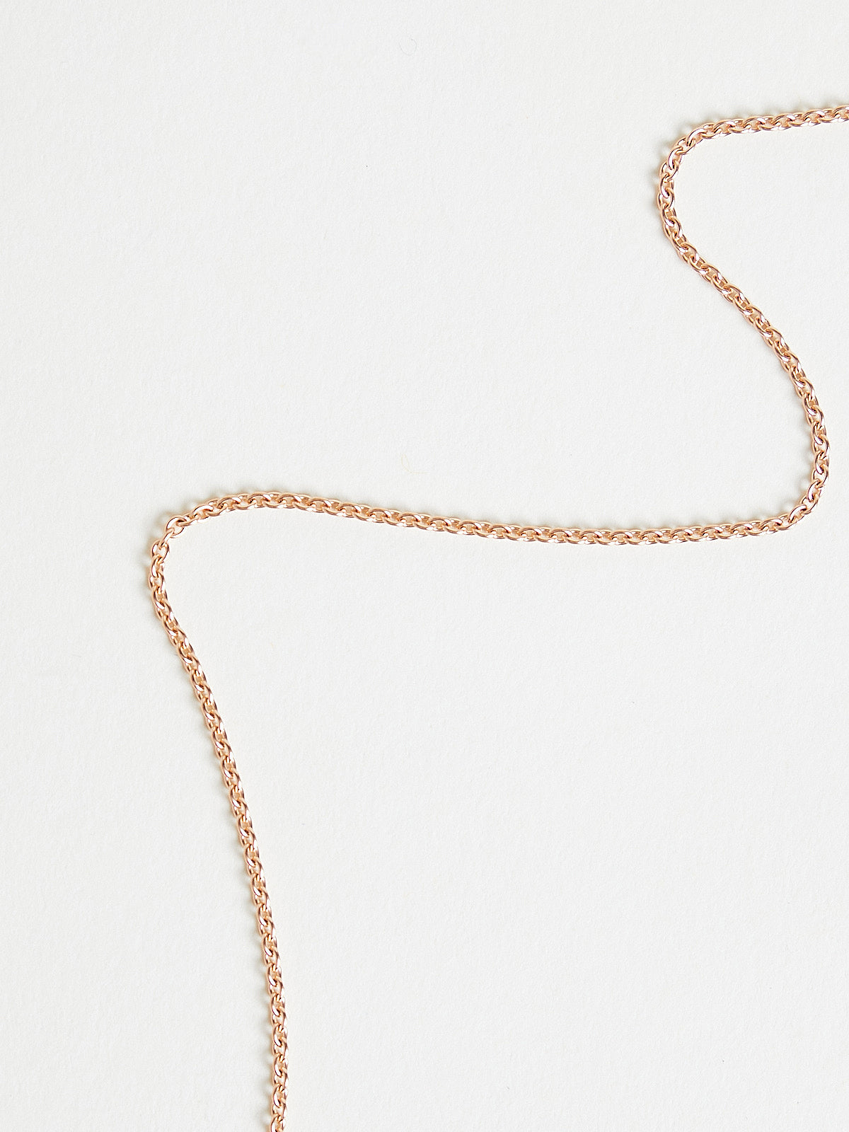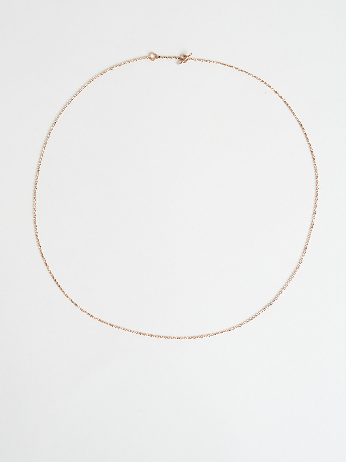 Handcrafted chain necklace in 18k rose gold. The organic texture of the two rings and the toggle clasp echoes the veins in the oak bark.