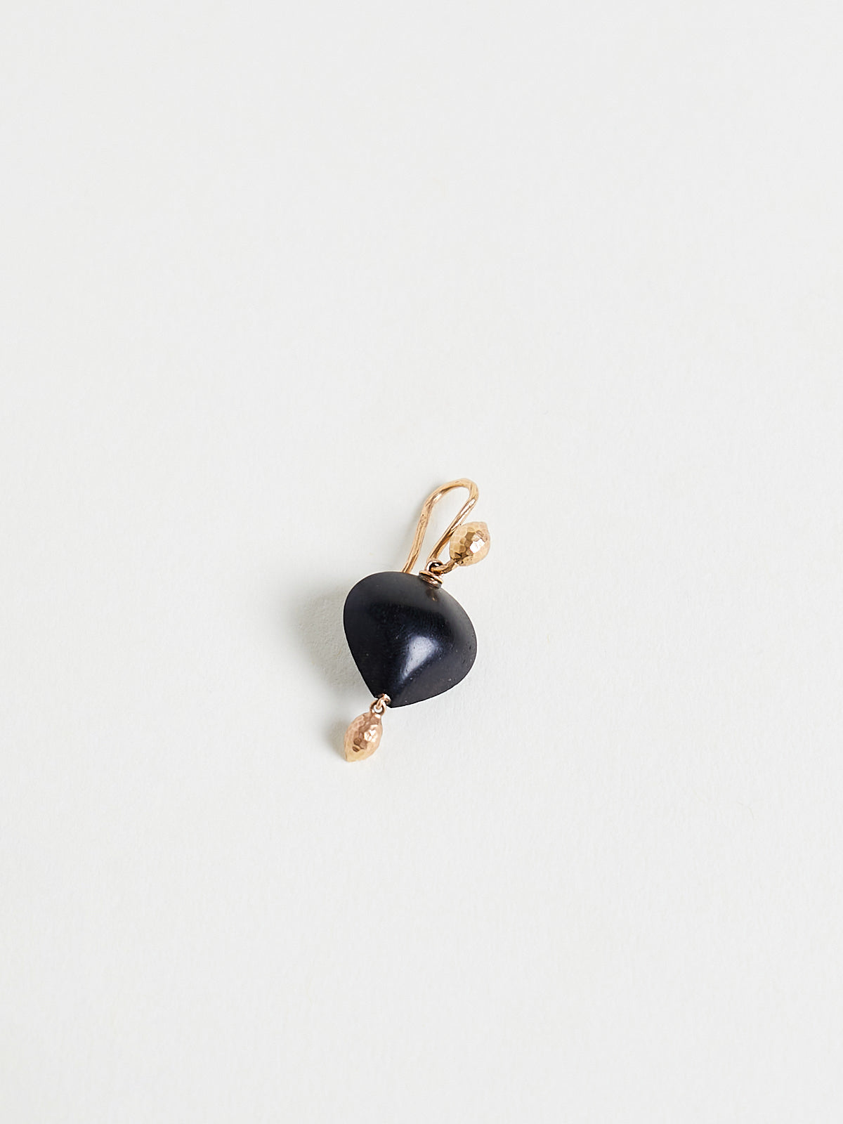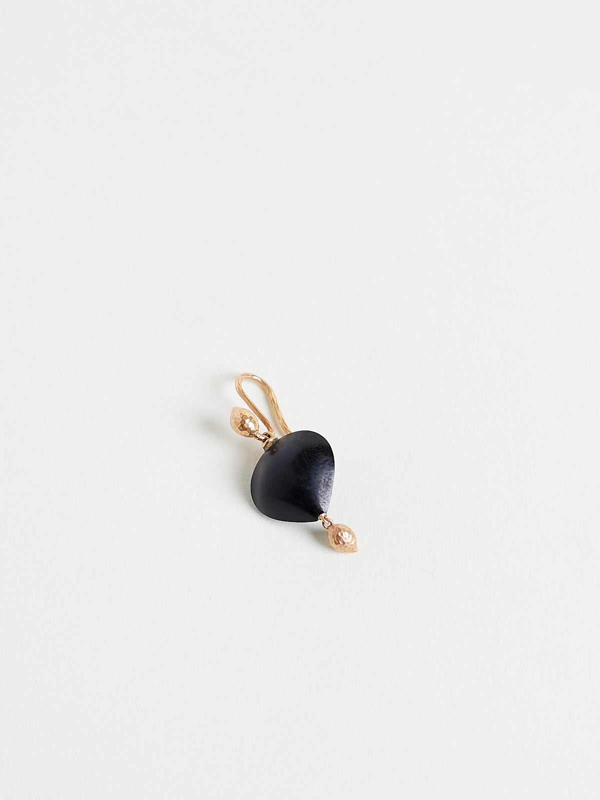 Earrings in 18k rose gold with sea kale seeds and pear-shaped ebony drops. Features a strong and flexible ear wire backing. To keep the earrings in place, press gently to close them or use the silicone backs.