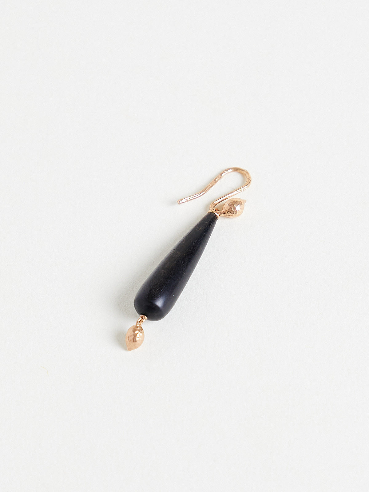 Handcrafted earrings in 18k rose gold with beads in the shape of sea kale seeds and long ebony drop pendants. Features a strong and flexible ear wire backing with an oak bark texture. To keep the earrings in place, press gently to close them or use the silicone backs.