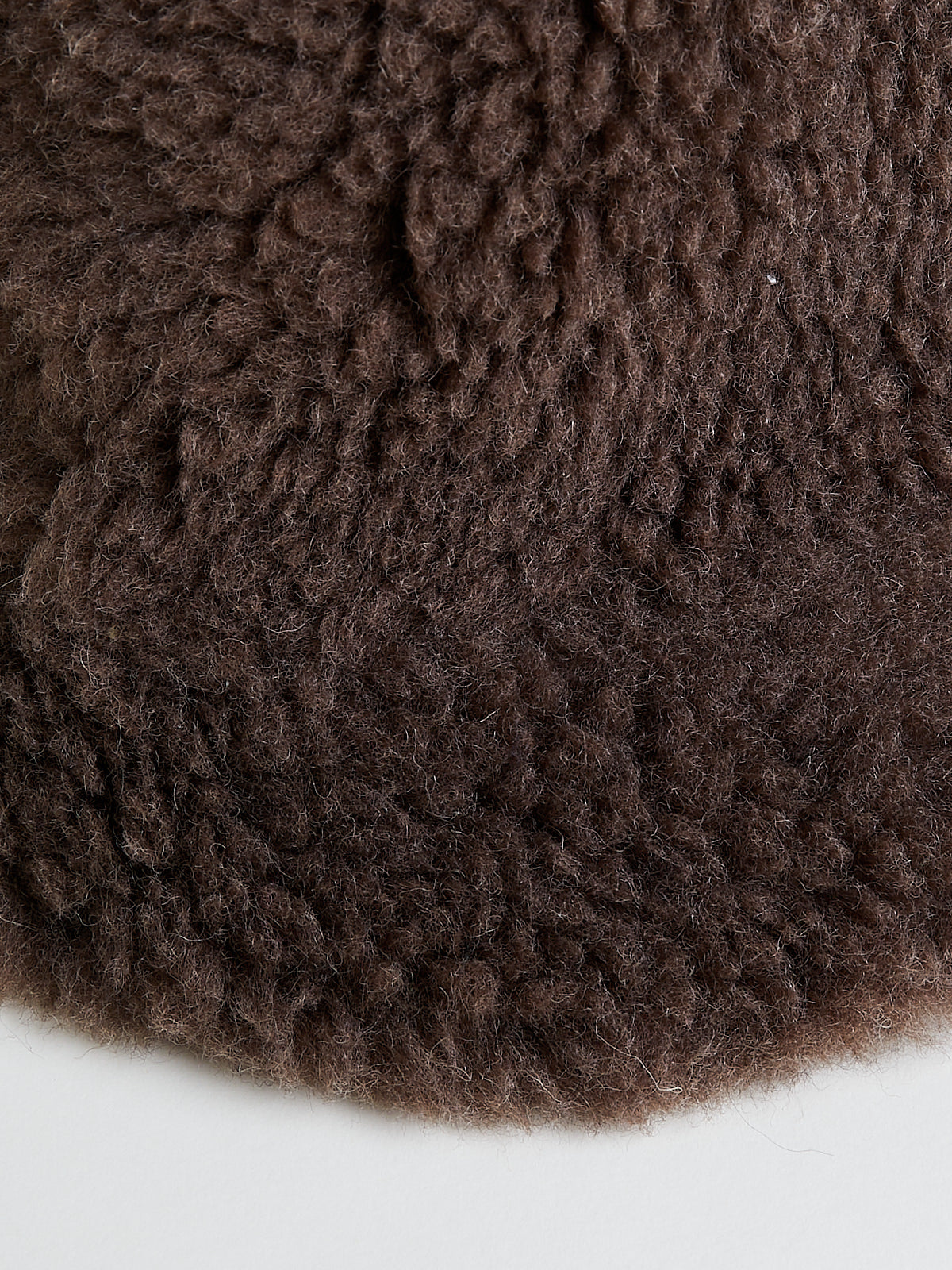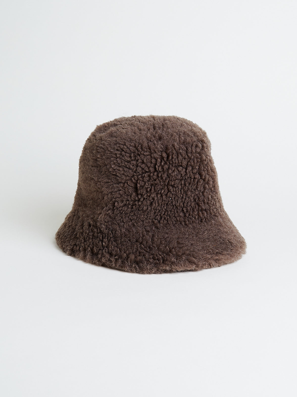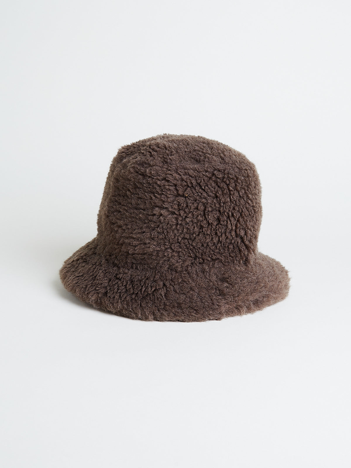 Bucket hat made from taupe recycled Sherpa wool, a soft woven woollen fur with small curls. Fully lined in the same wool. Inspired by a fisherman's hat.