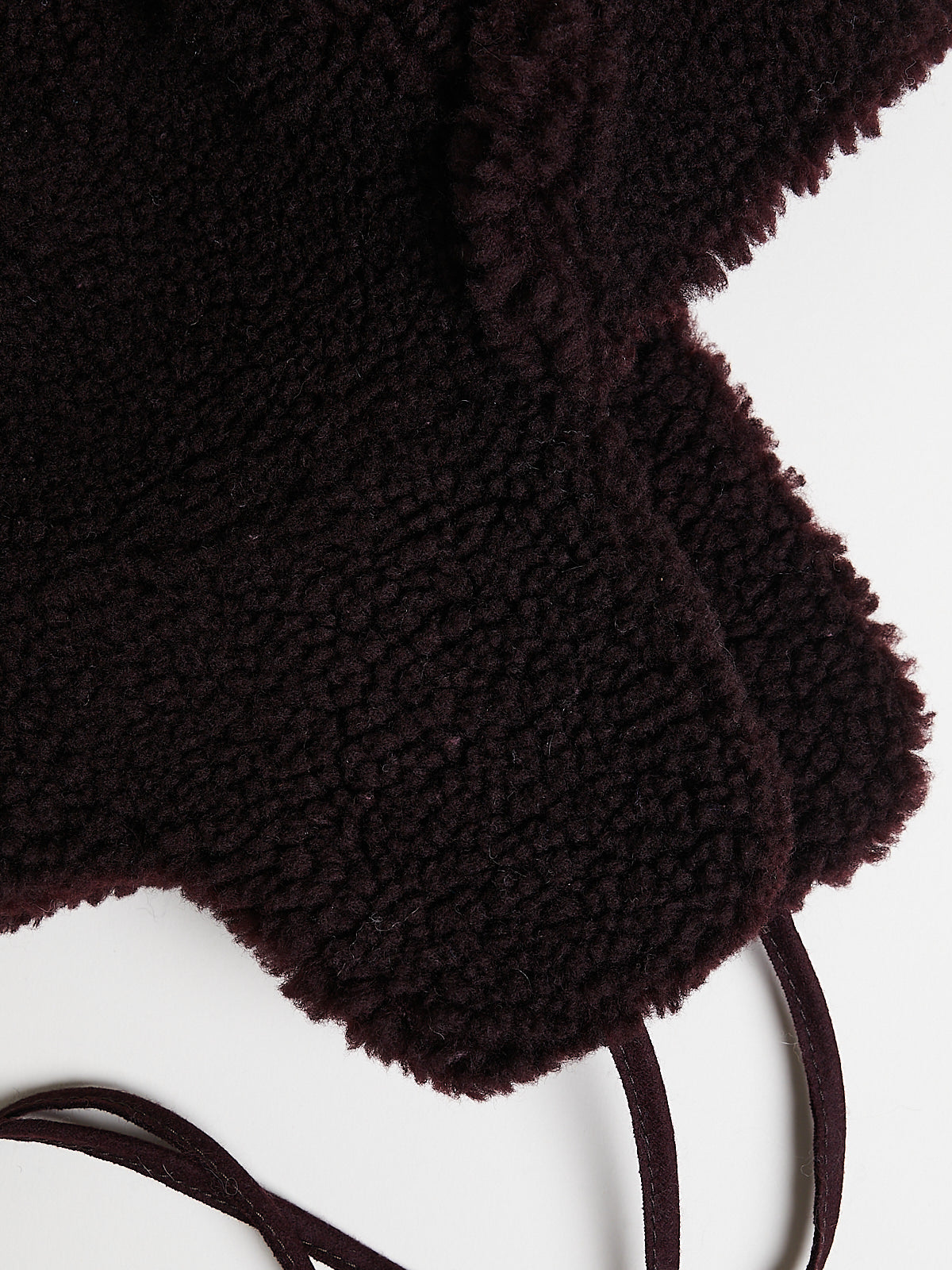 Russian hat made from burgundy Sherpa wool, a soft woven woollen fur with small curls. Fully lined in the same wool. Features ear flaps that can be tied on the crown.