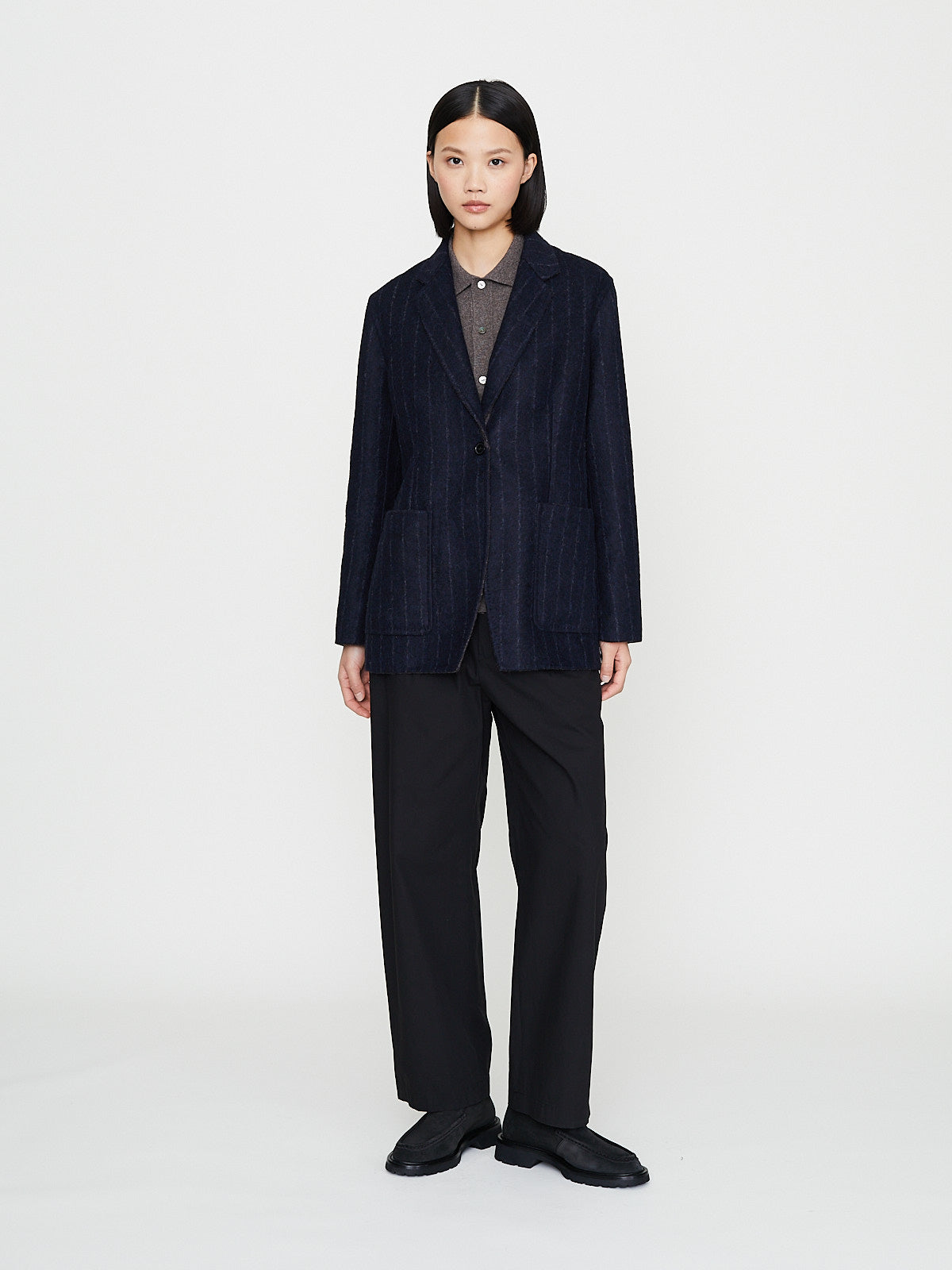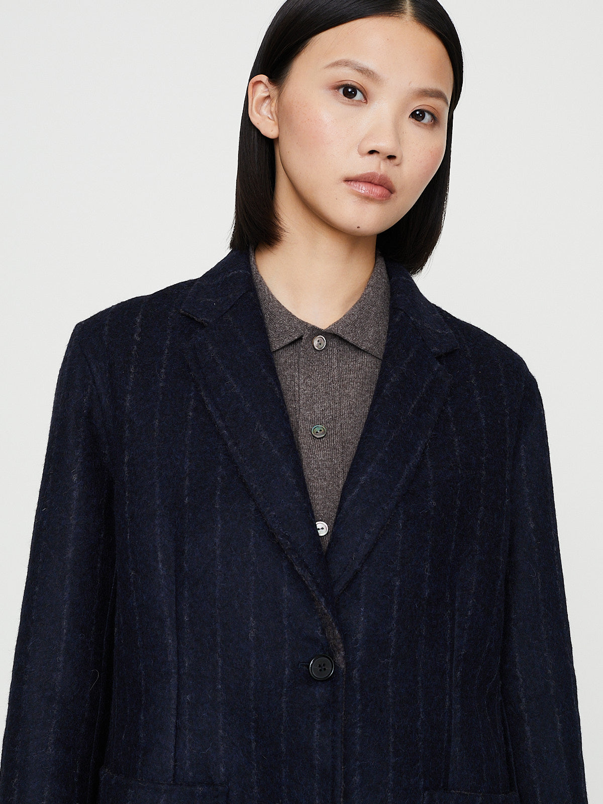Blazer in a blue pinstriped baby alpaca blend. Notched collar, front button fastening and patch pockets on the front. Lined in contrasting taupe melange. Regular fit.