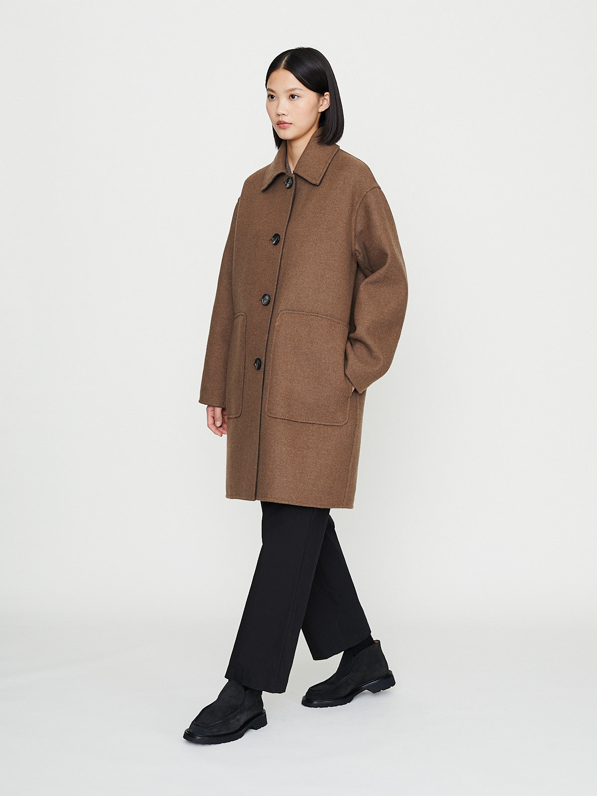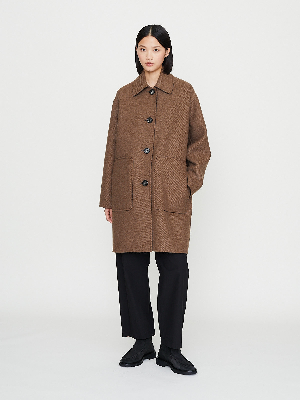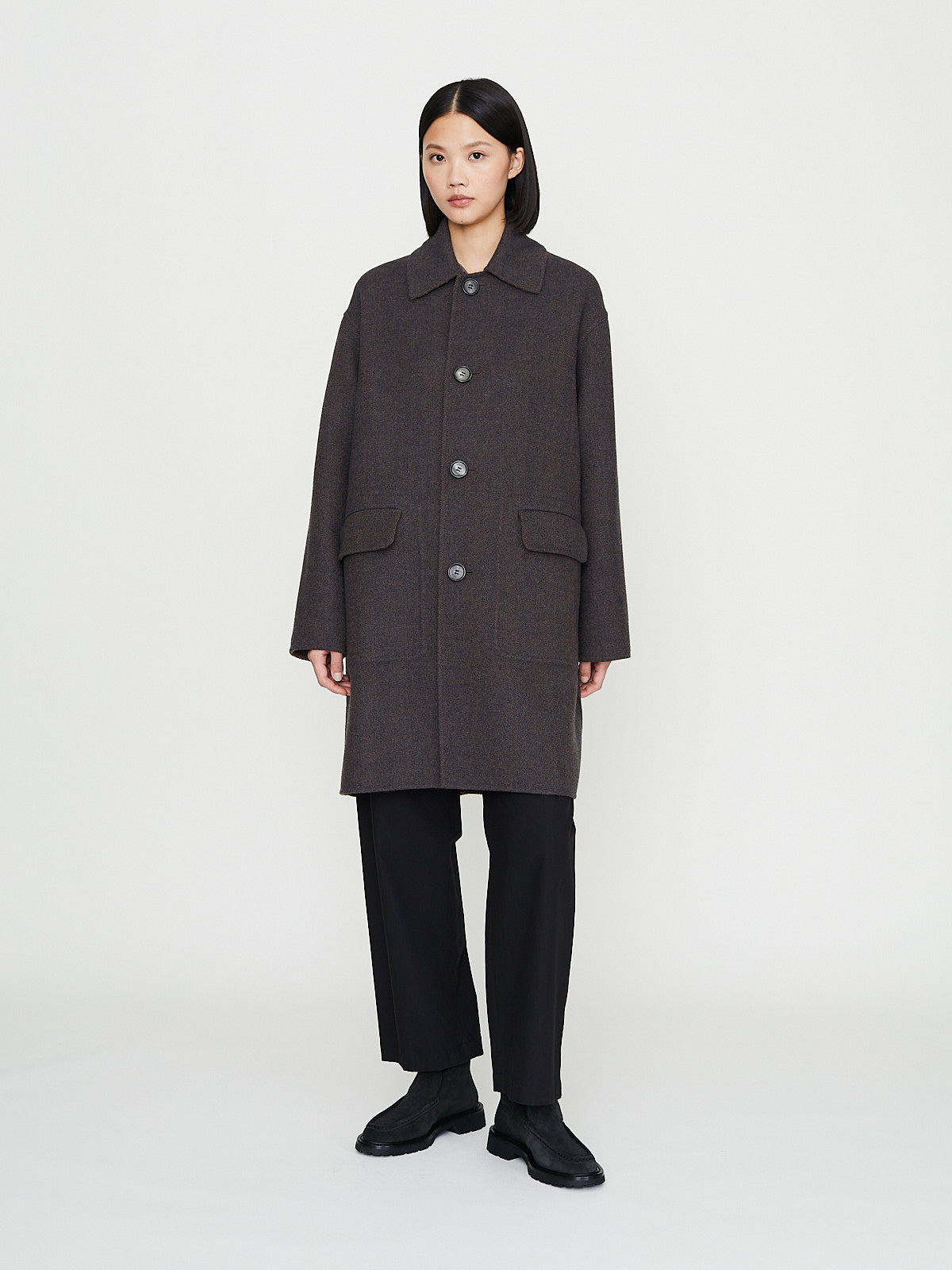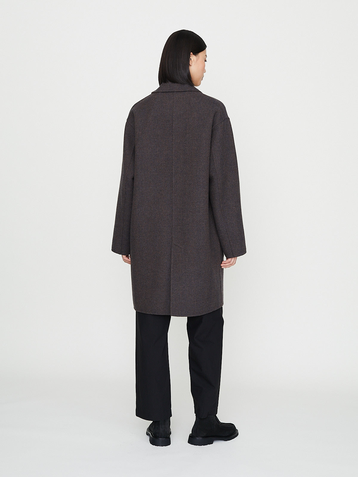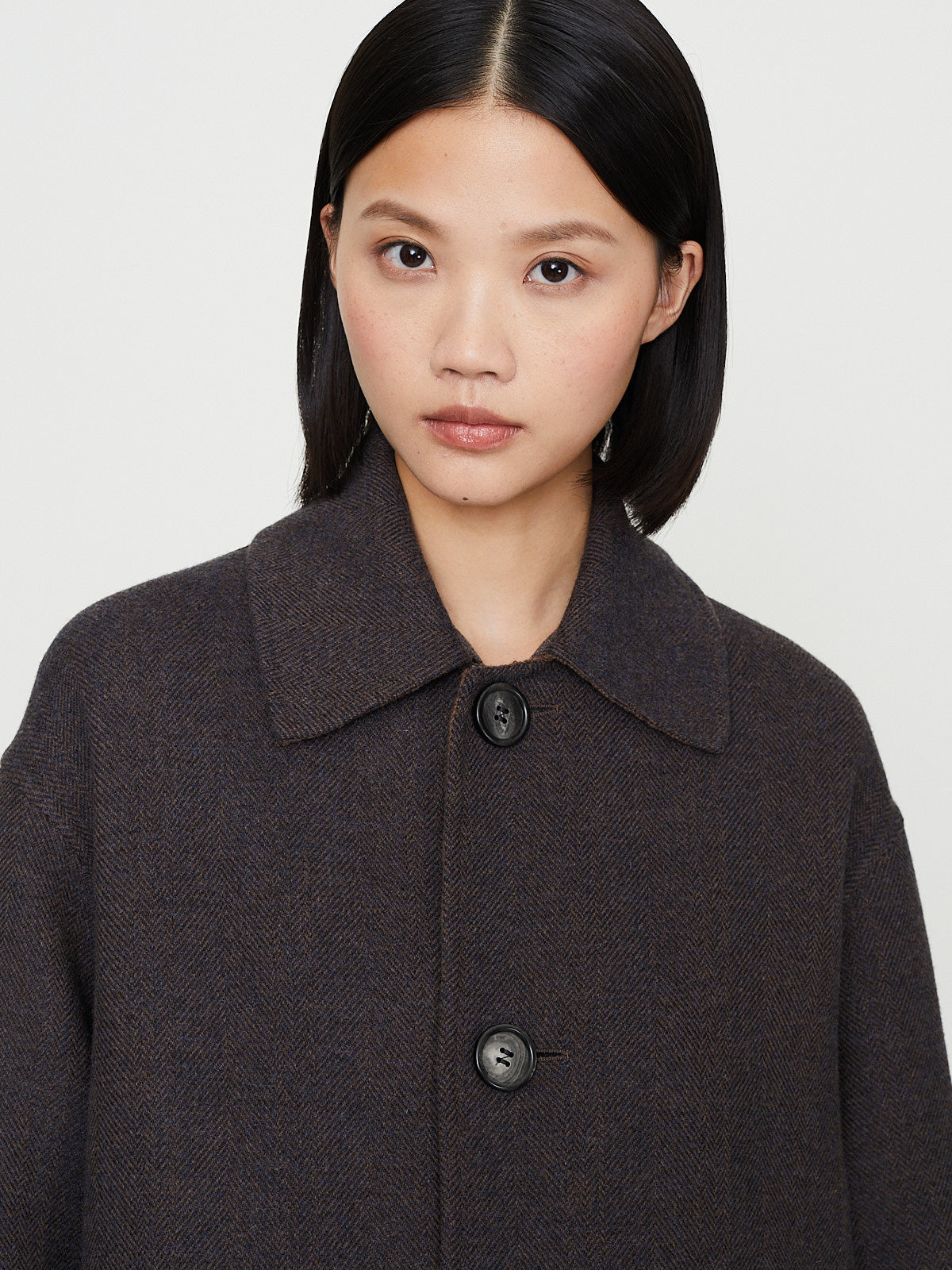 Oversized reversible car coat in double-faced virgin wool blend that is brown on one side and has a herringbone pattern on the other. Spread collar, front button fastening and long sleeves with a dropped shoulder. Flap pockets on one side and slip patch pocket on the other. Features a back vent.