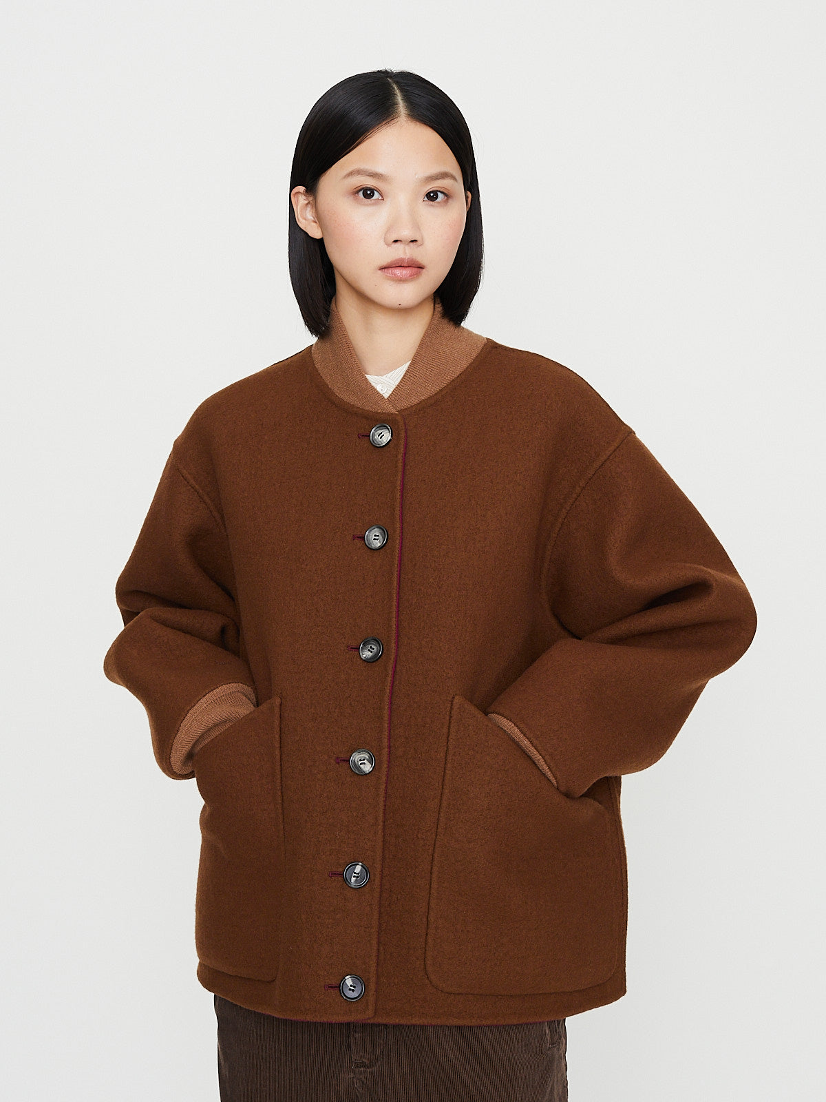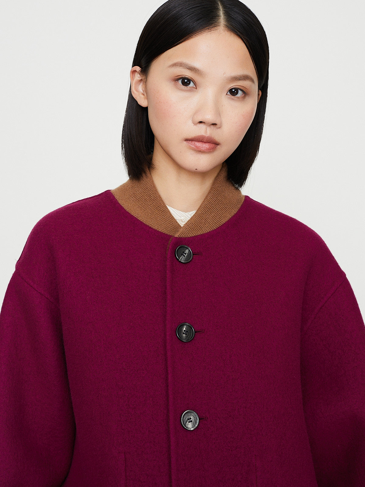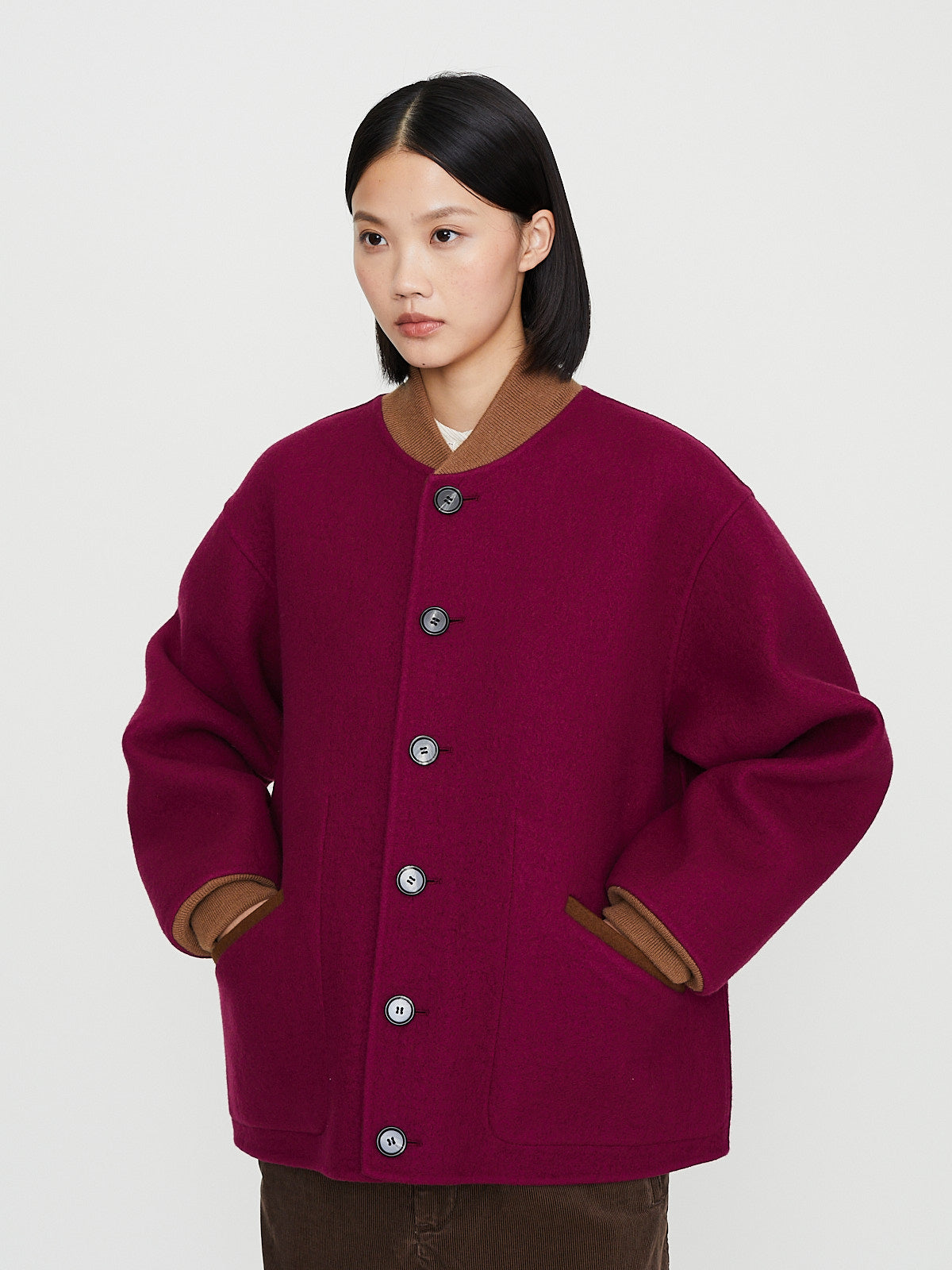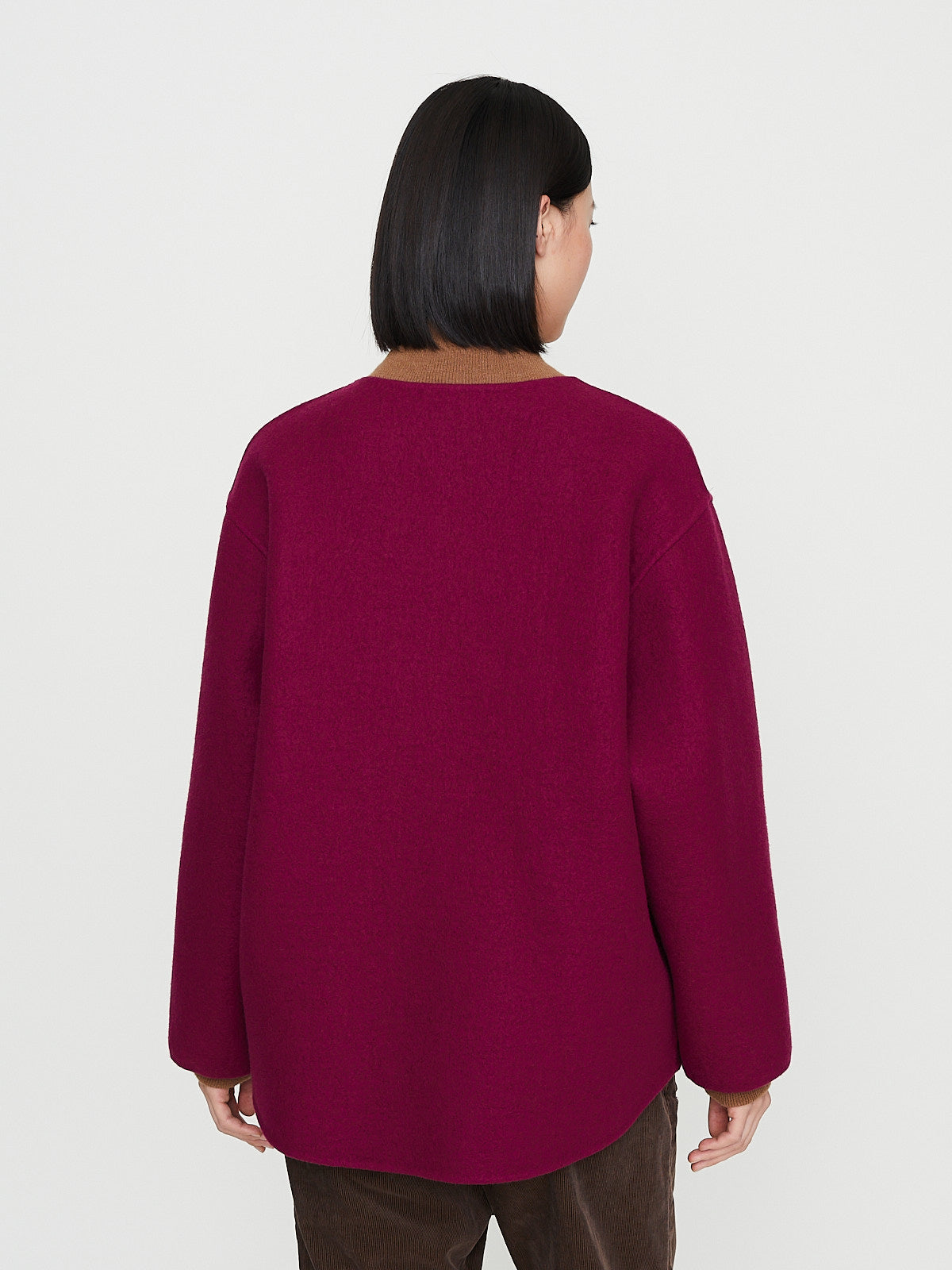 Reversible varsity jacket crafted from virgin wool that is raspberry on one side and brown on the other. Ribbed collar, front button fastening and long sleeves with a dropped shoulder and ribbed cuffs. Welted slip pockets on one side and patch pockets on the other.