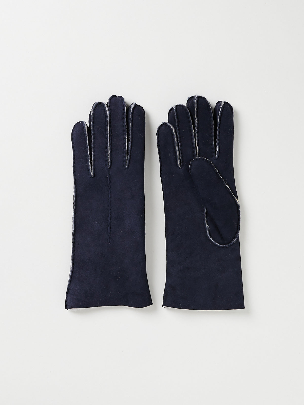 Gloves in dark blue Merino sheepskin with tonal stitching. Lined in shearling.