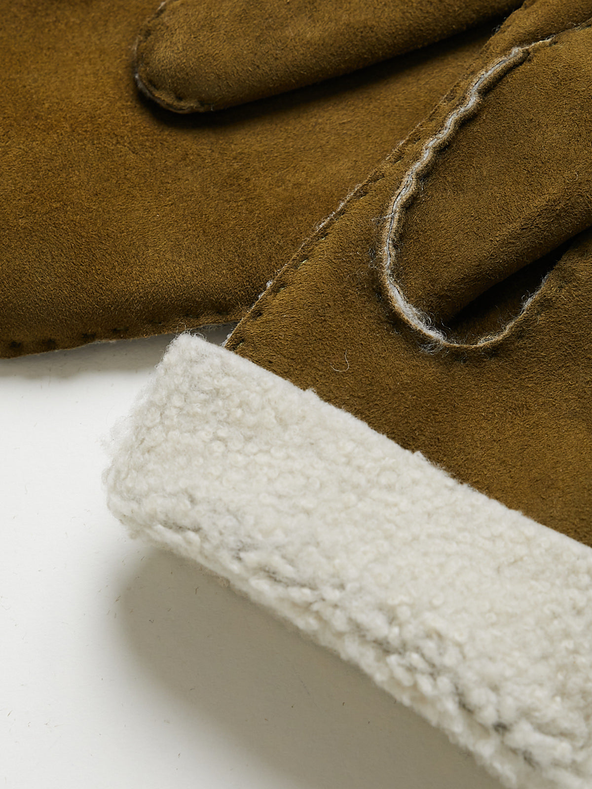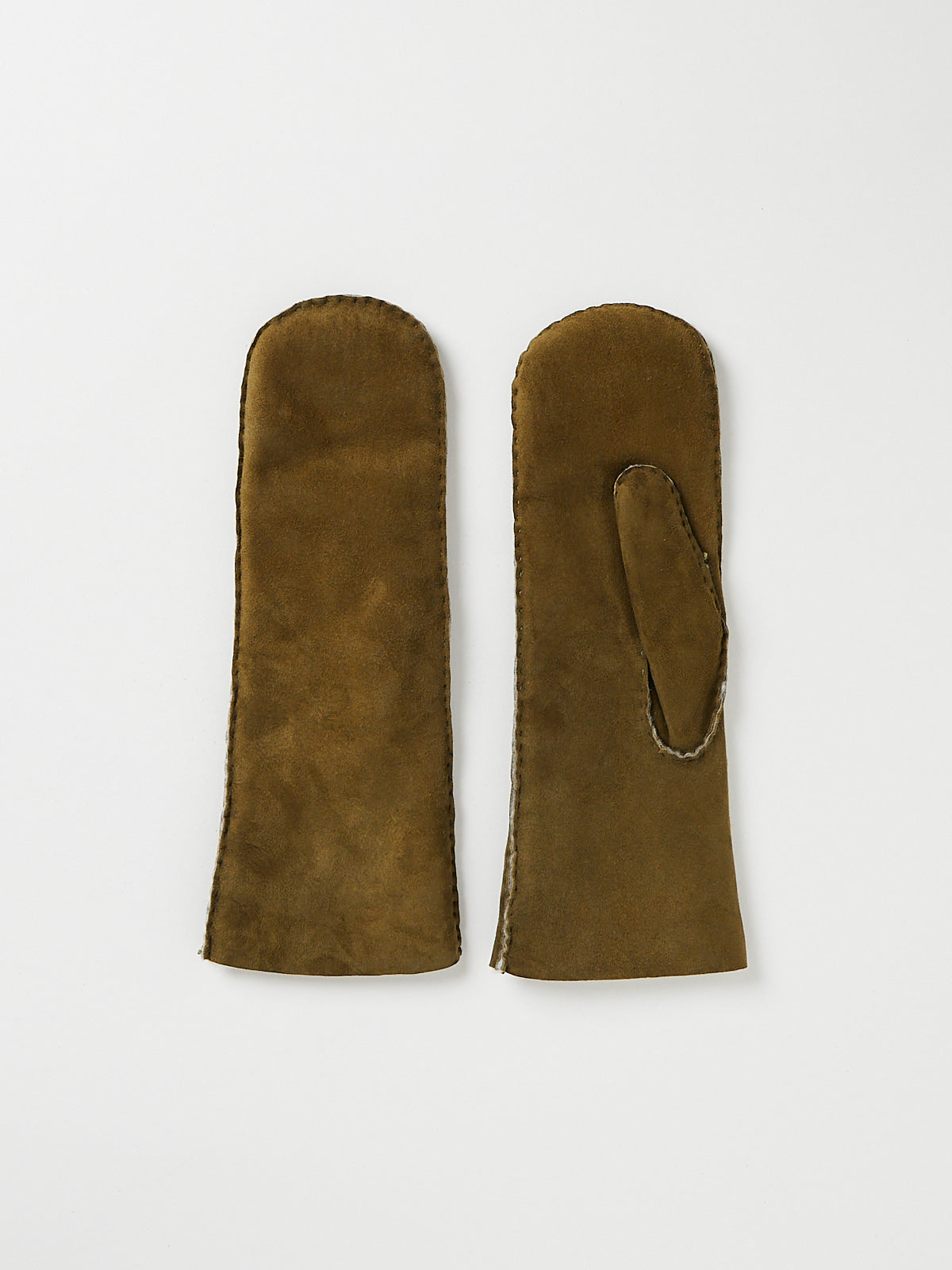 Mittens in green brown sheepskin with tonal stitching. Lined in shearling.