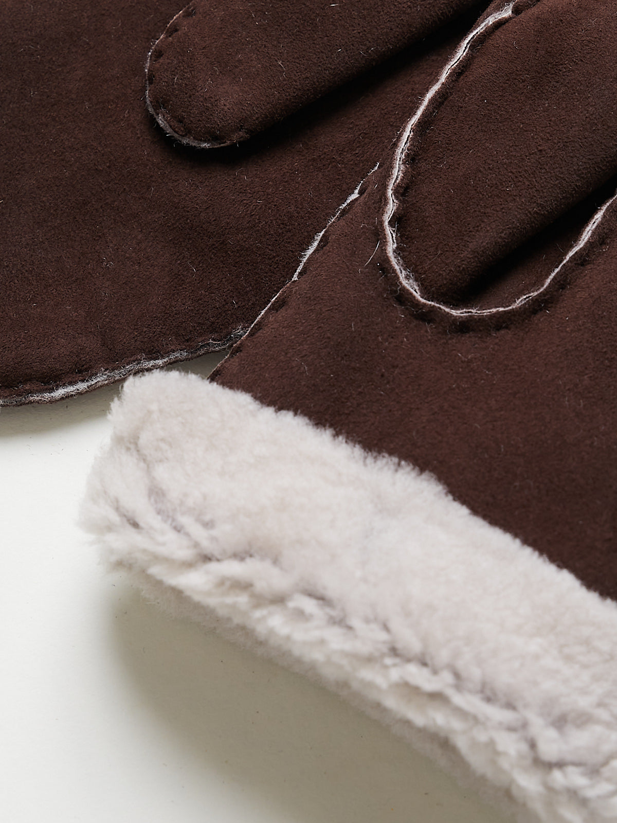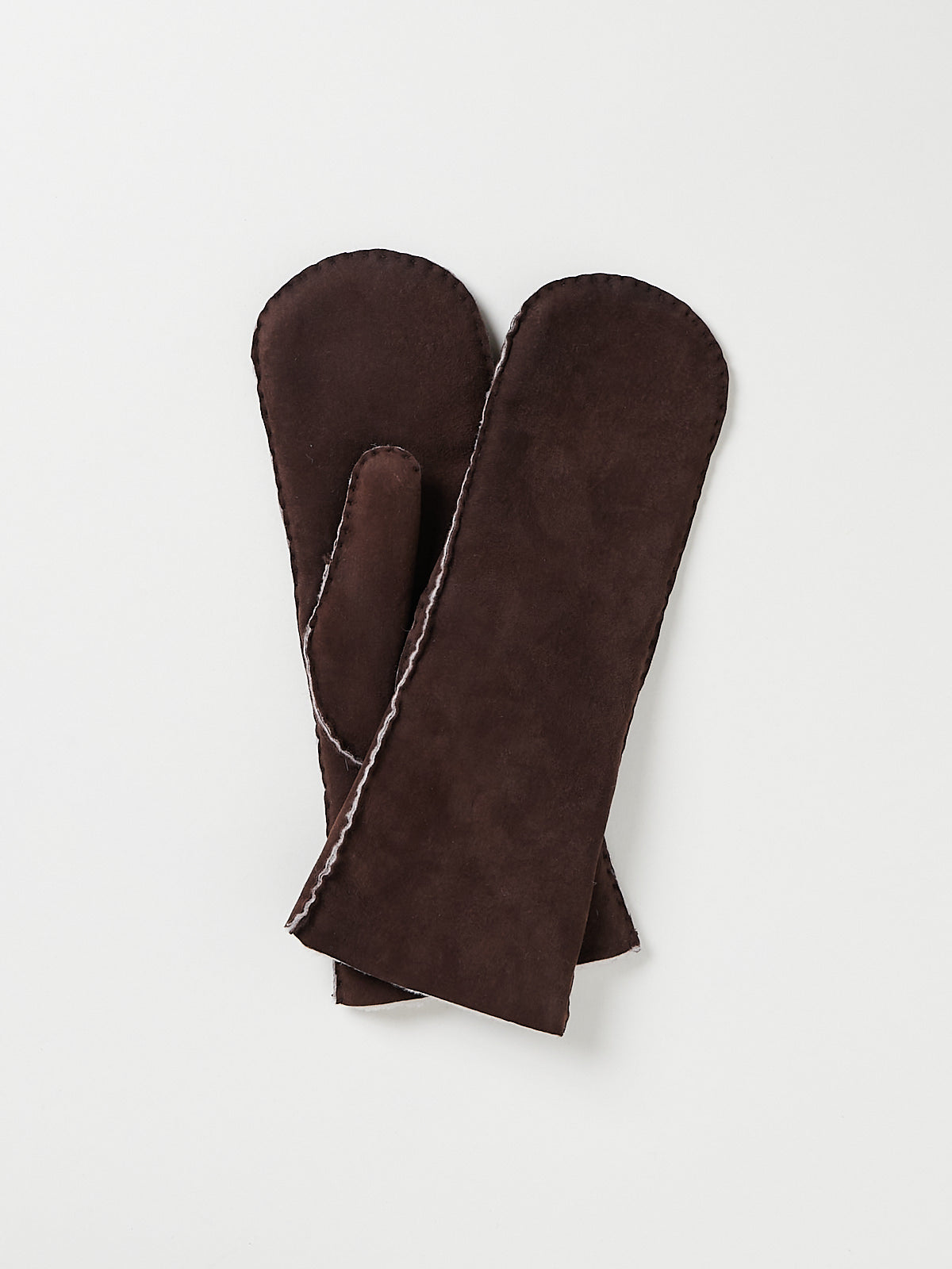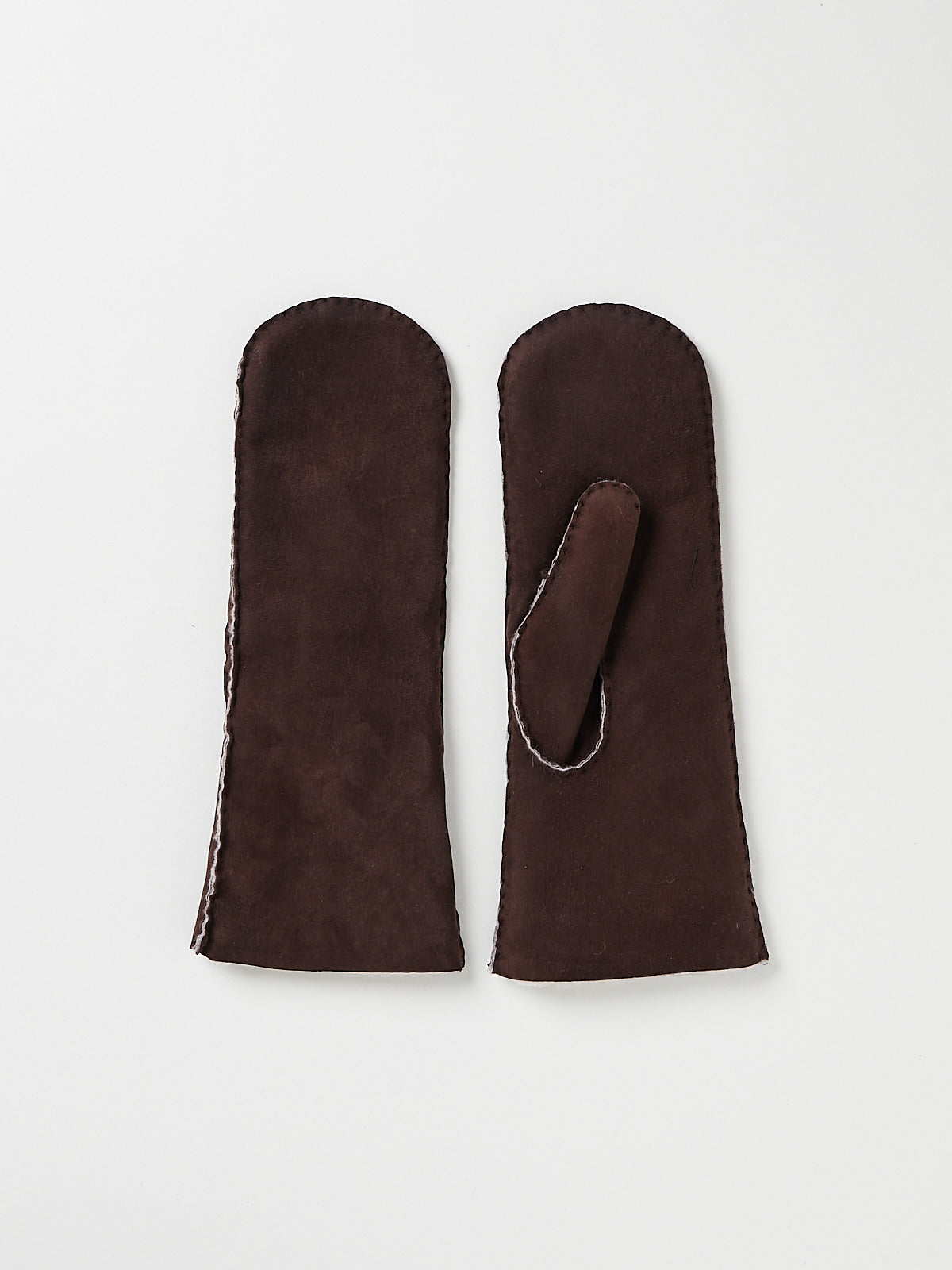Mittens in brown sheepskin with tonal stitching. Lined in shearling.