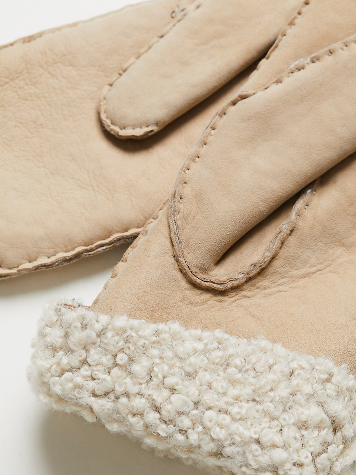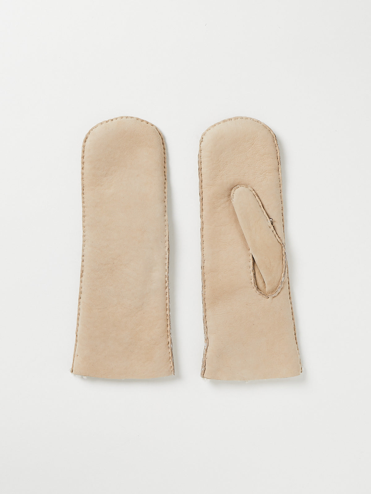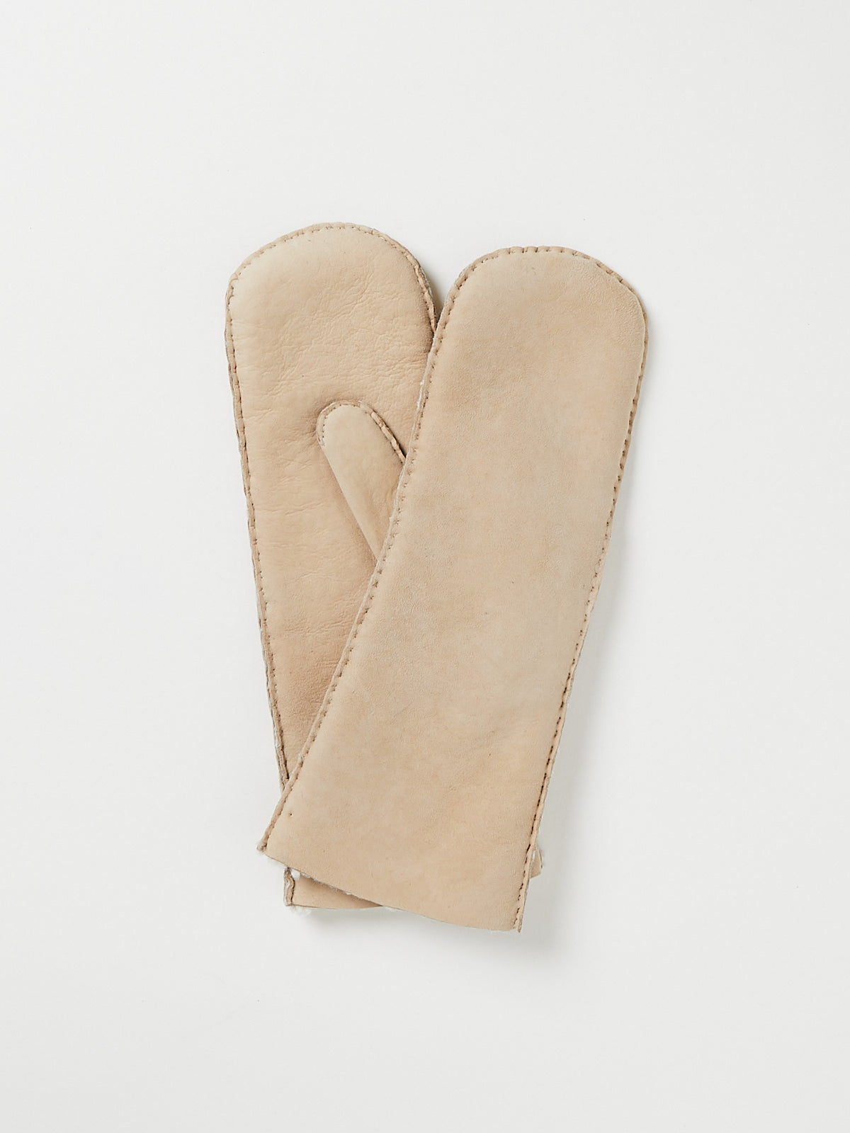 Mittens in beige sheepskin with tonal stitching. Lined in shearling.