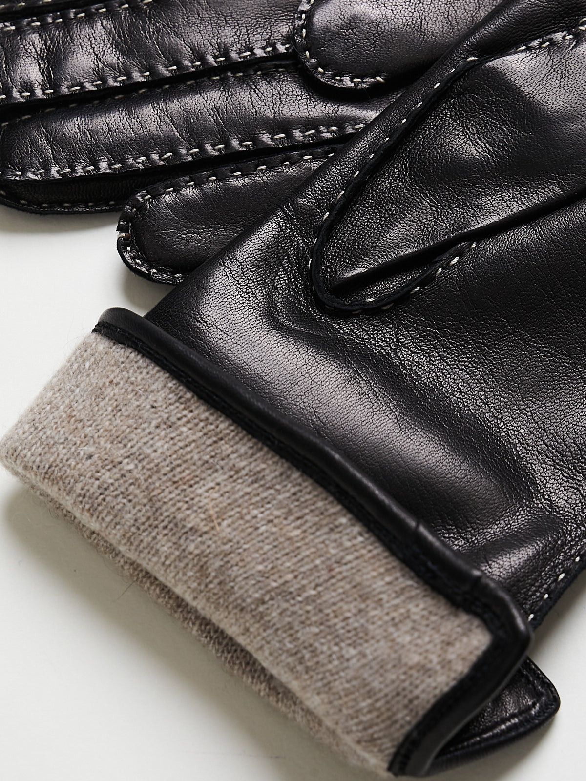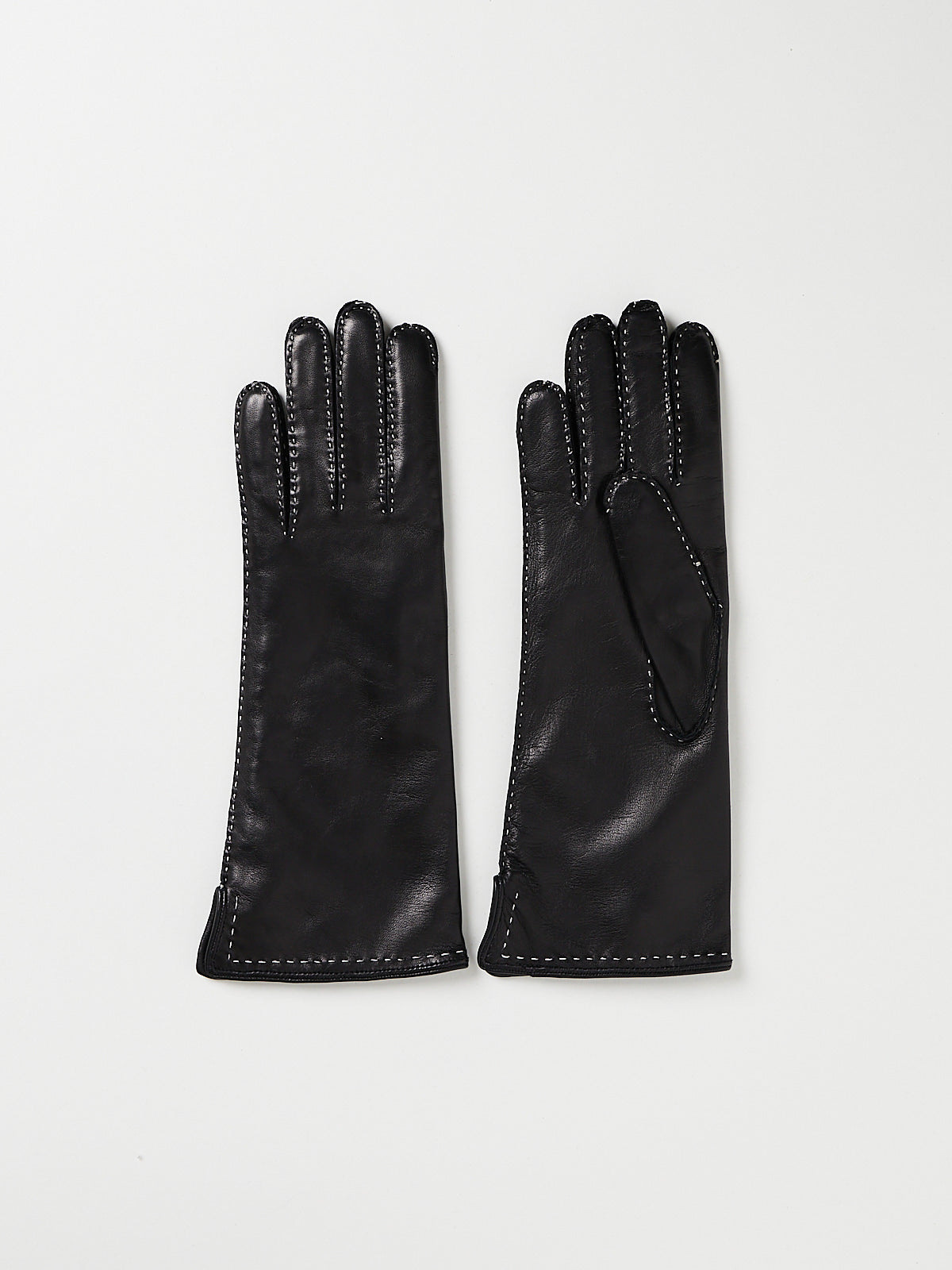 Long gloves in fine, smooth black Nappa leather. Contrasting stitching throughout. Lined in cashmere.