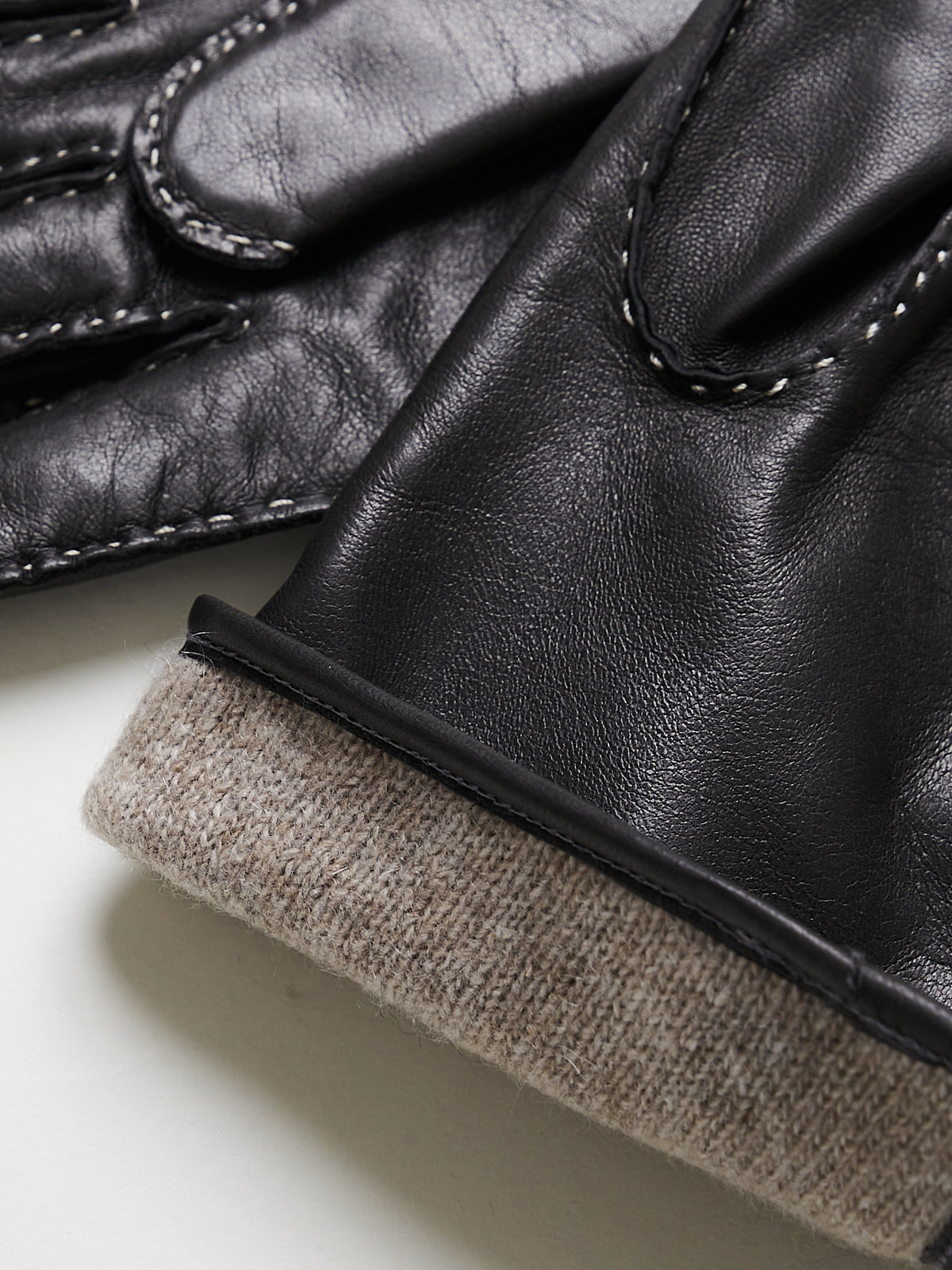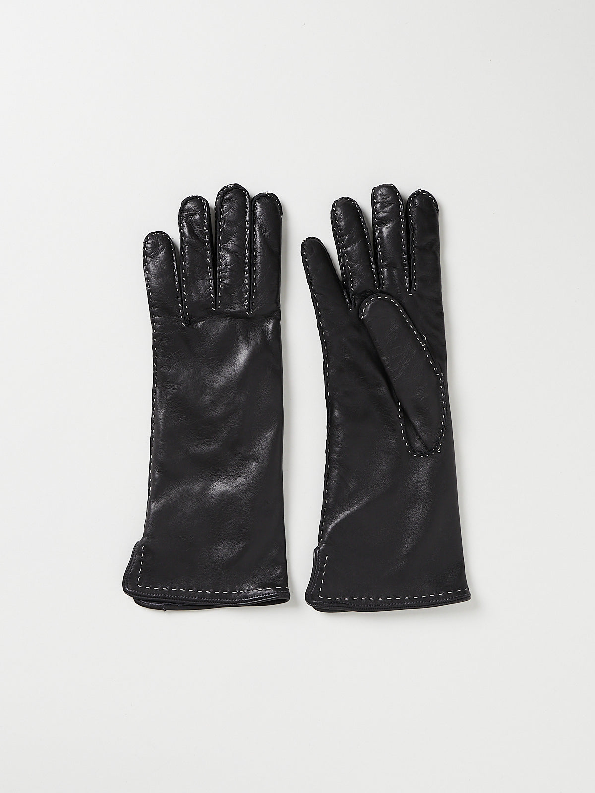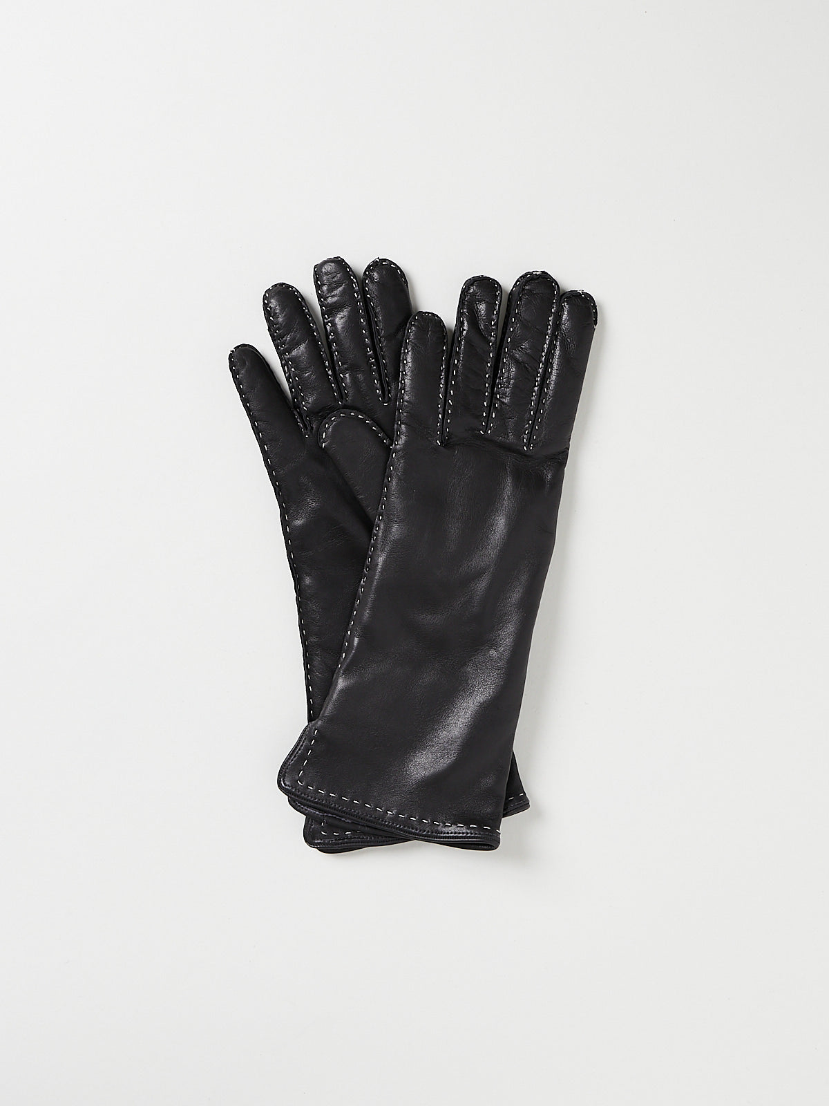Long gloves in fine, smooth dark grey Nappa leather. Contrasting stitching throughout. Lined in cashmere.