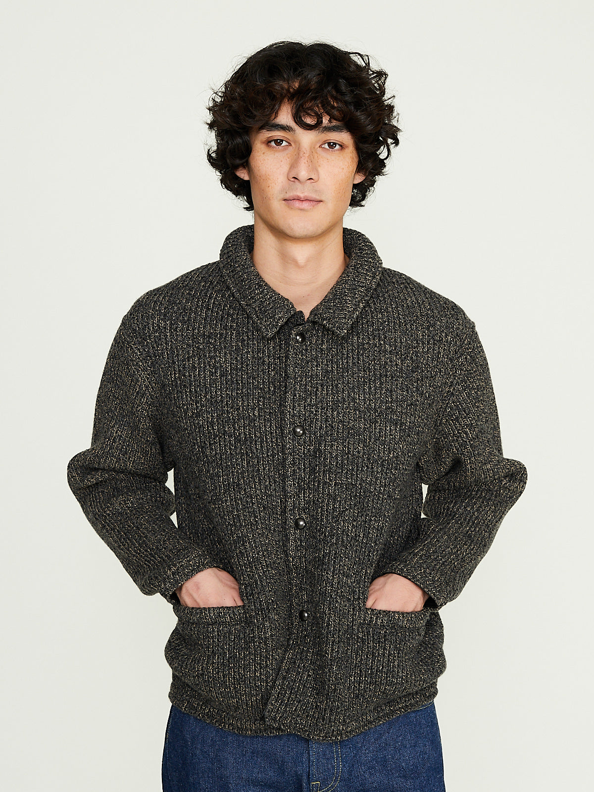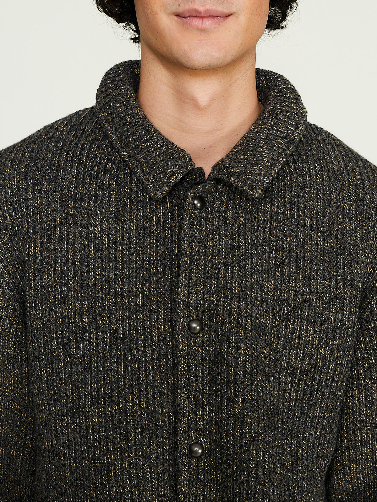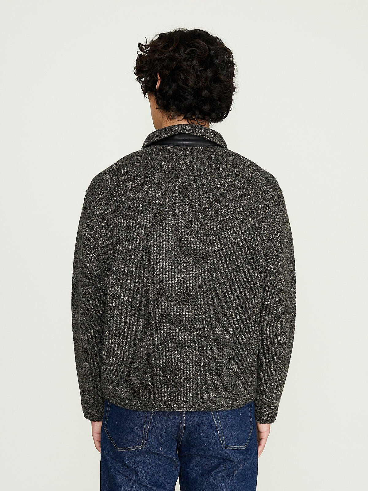 Jacket knitted from a grey British and South American wool blend chambray. It's knitted using a softly twisted elastic yarn to create a heathered look. It was inspired by a American beach jackets in 1930s to 1960s.