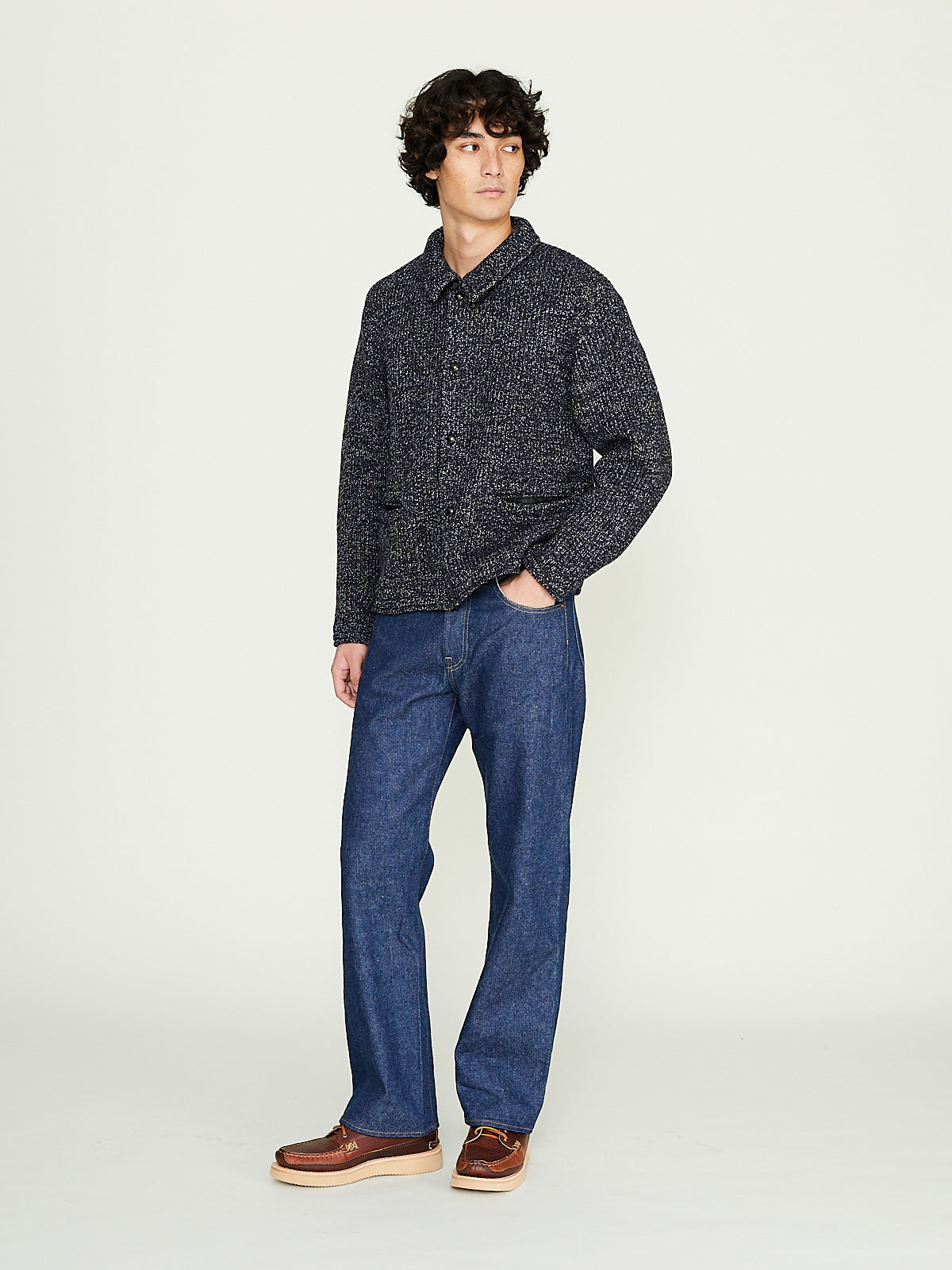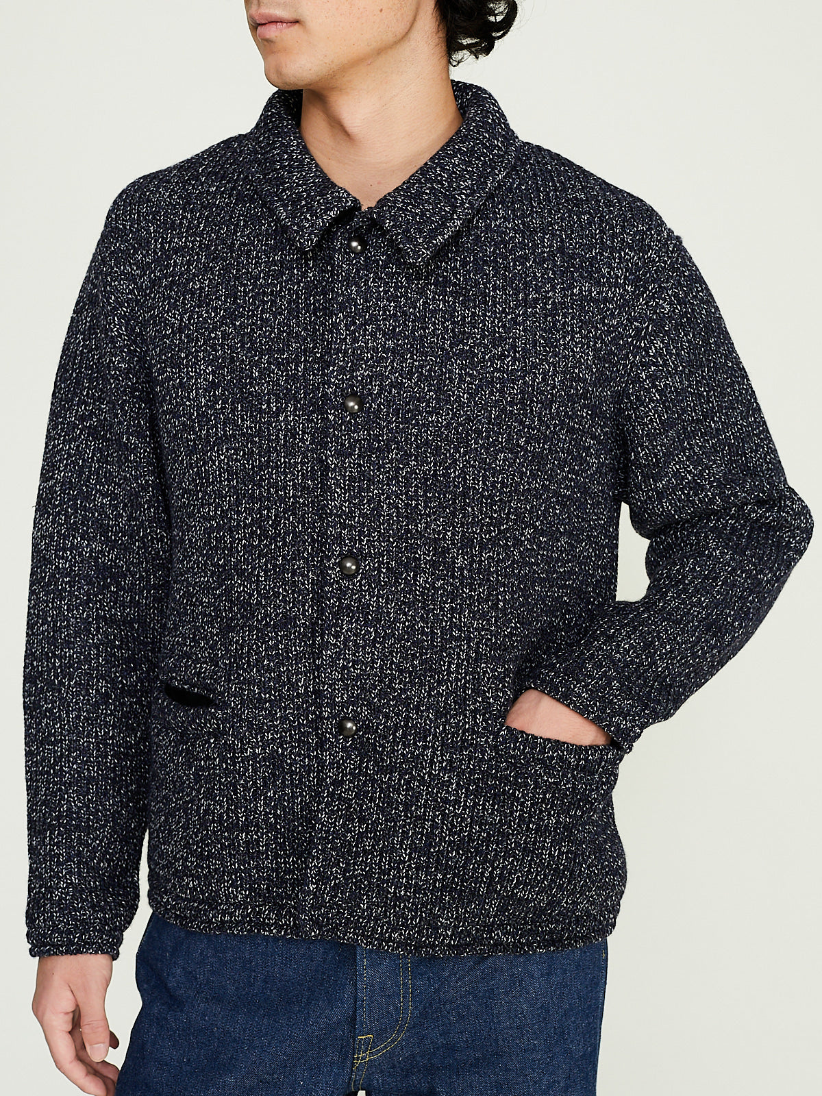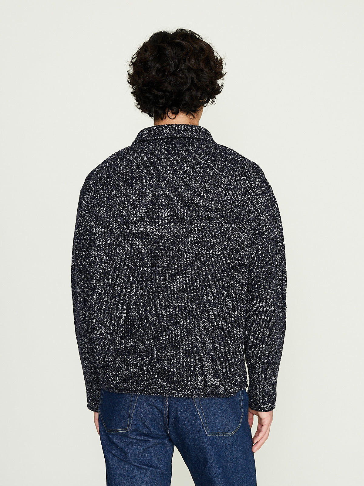 Jacket knitted from a navy British and South American wool blend chambray. It's knitted using a softly twisted elastic yarn to create a heathered look. It was inspired by a American beach jackets in 1930s to 1960s.
