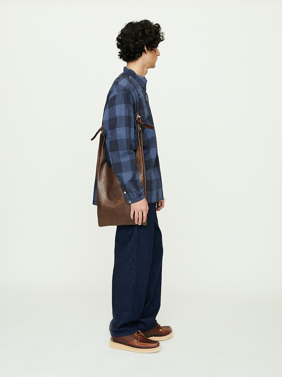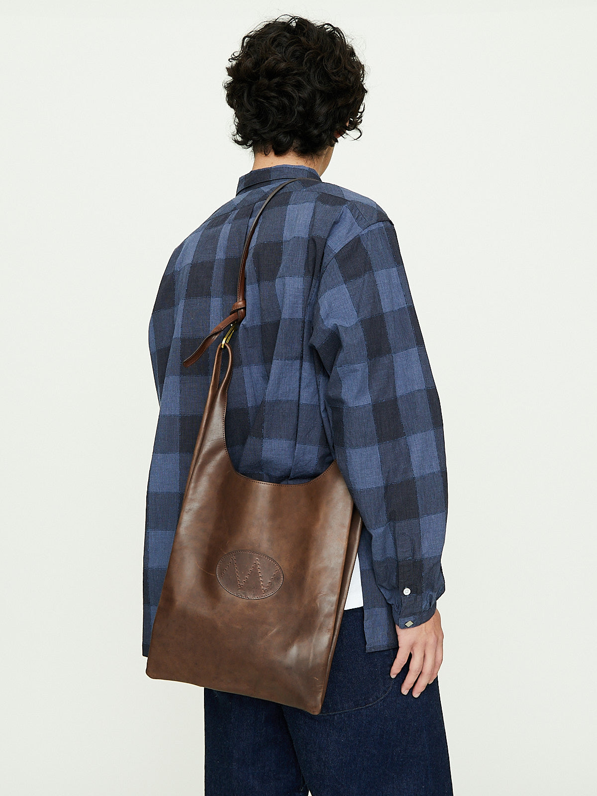 Classic shoulder bag made from brown fully tanned horsehide that will develop a dull shiny lustre with use. One large main compartment. Features an adjustable and removable shoulder strap, a flap pocket on the front and NN punched patch on the back.