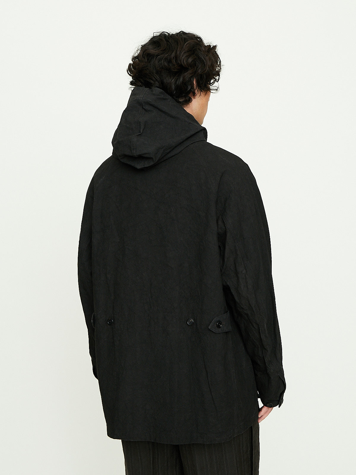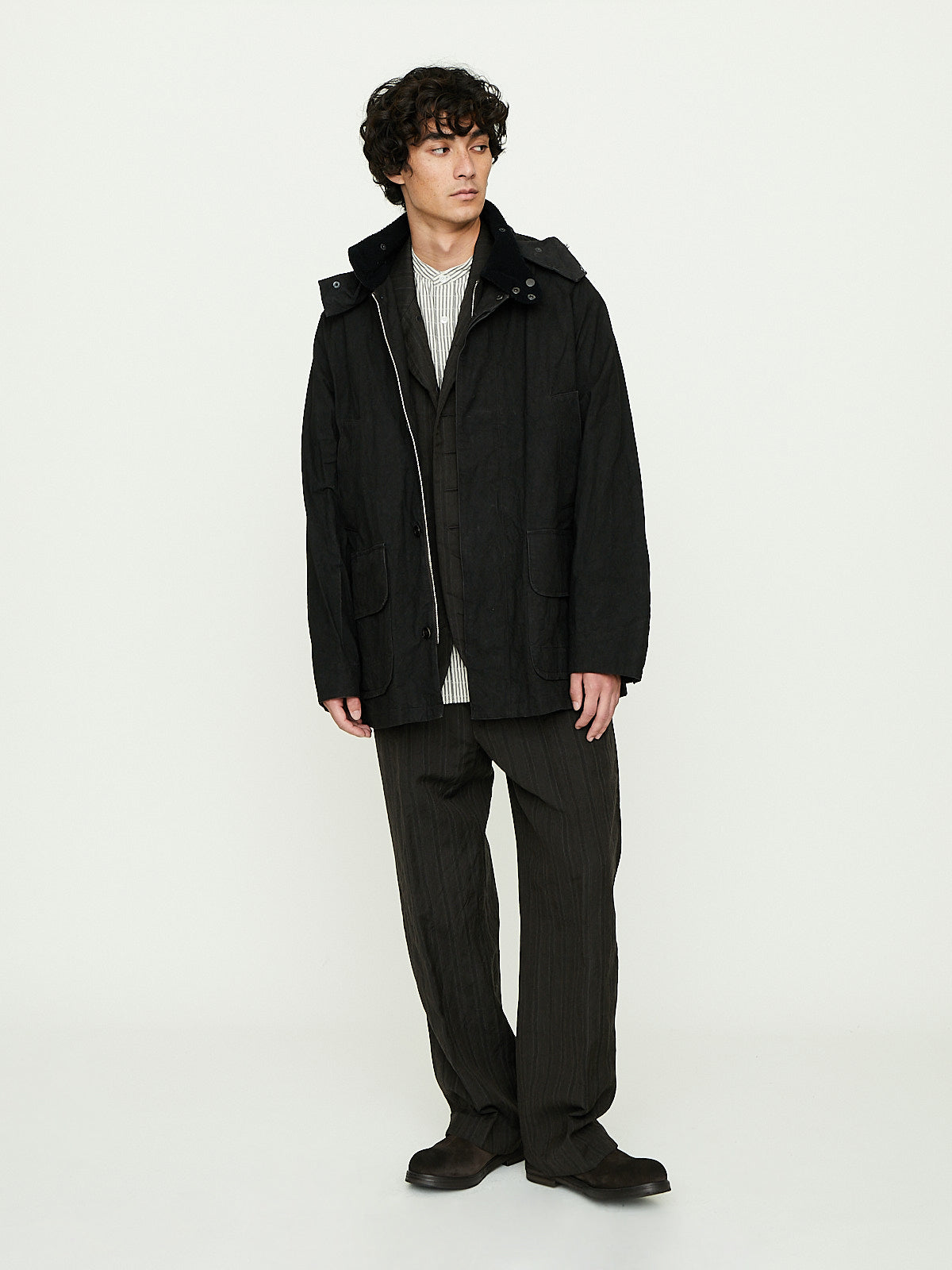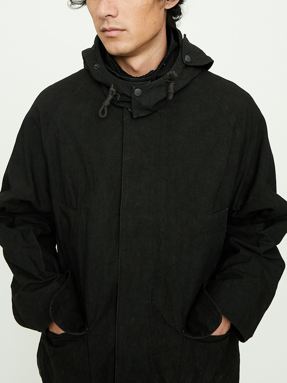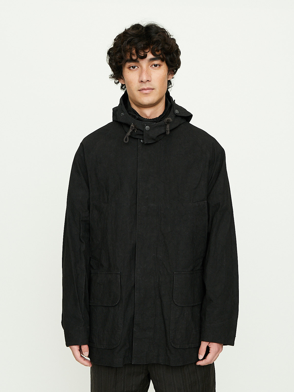 Hunting jacket crafted from dark brown twisted cotton duck fabric that has been sulfur-dyed and bio-processed to give it a worn look. This fabric was inspired by an American's fireman's canvas. Convertible collar that is corduroy on one side and can be worn up with a button fastening. Front concealed button and zip fastening and long raglan sleeves with buttoned cuffs. Features a removable hood that can be adjusted with an internal drawstring. Diagonal welted slip pockets at the waist and patch pockets with flaps on the front. Buttoned tabs at the waist. Oversized fit.