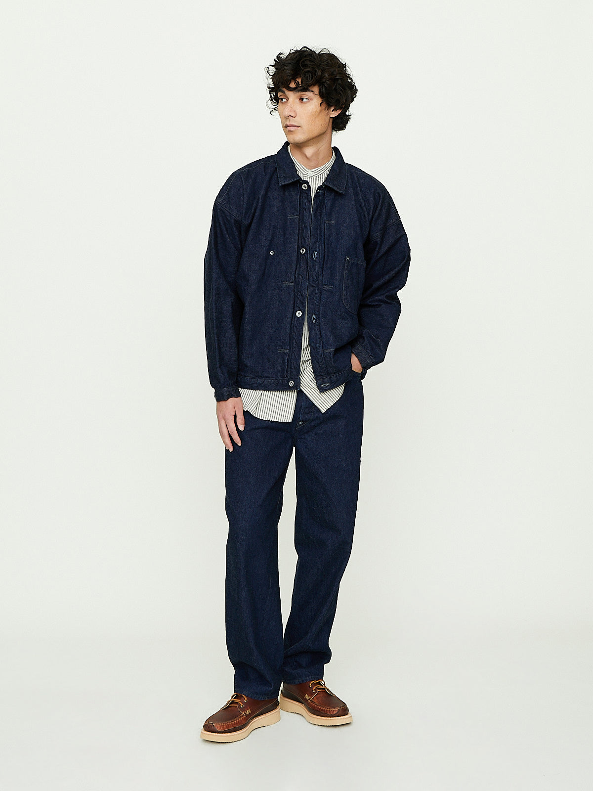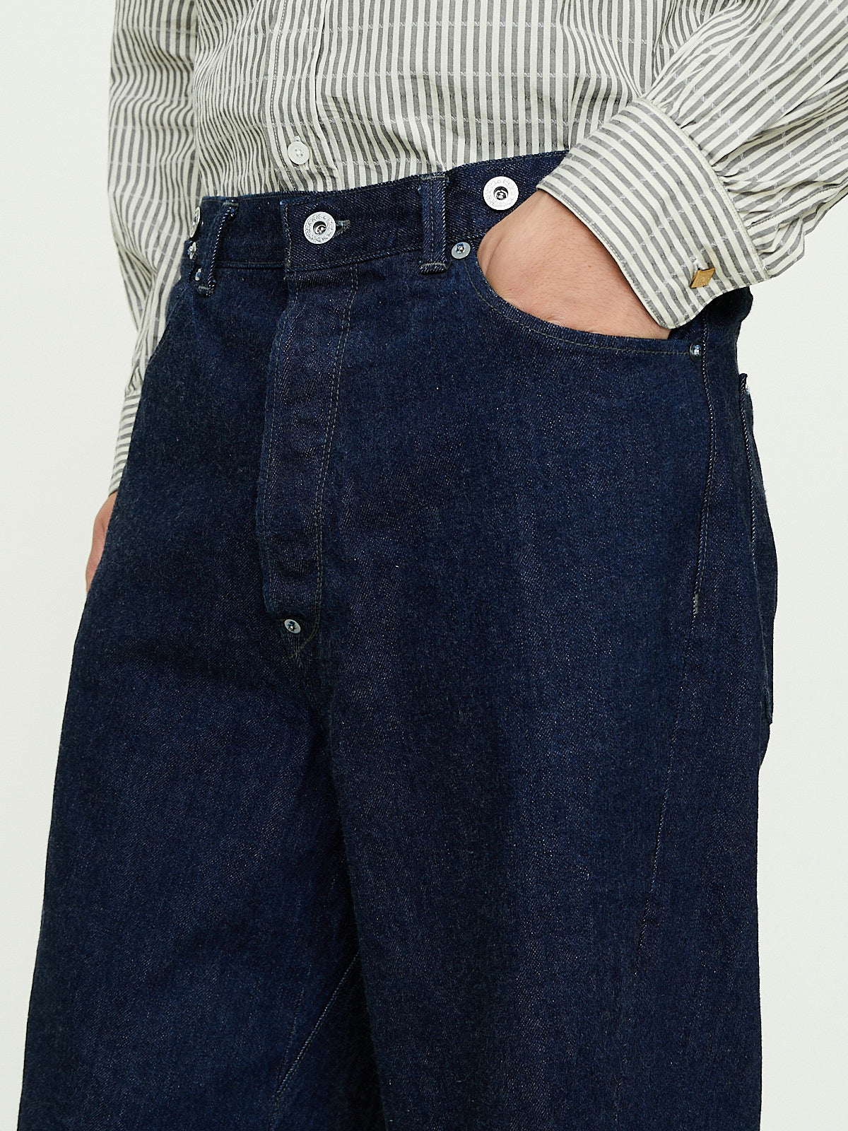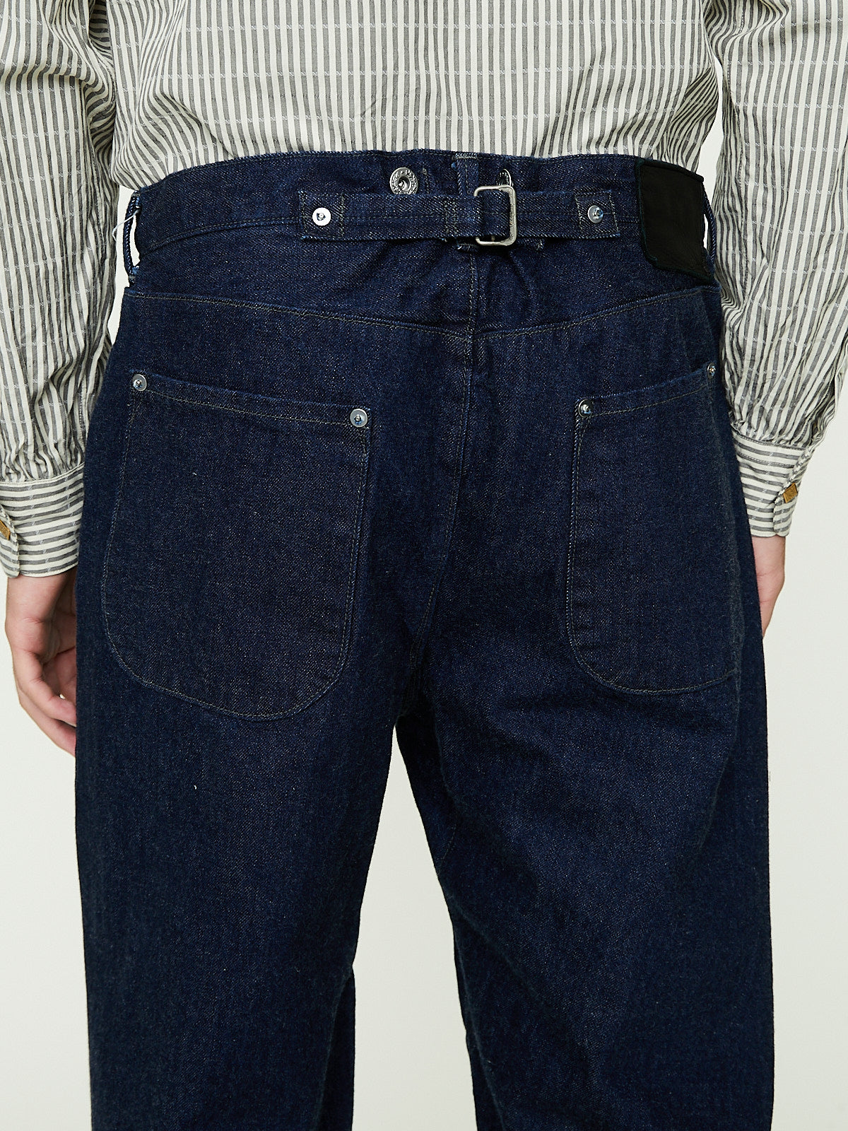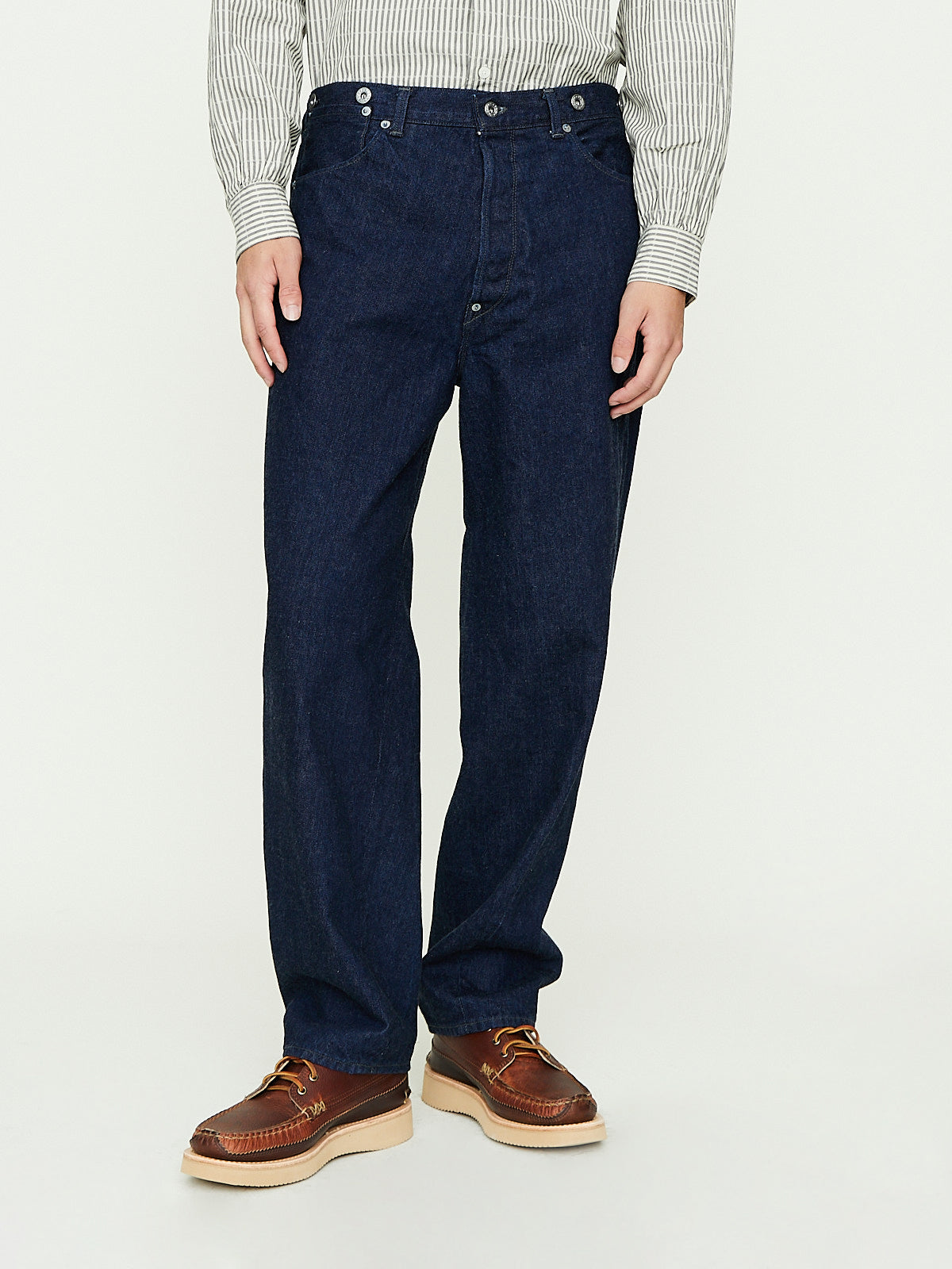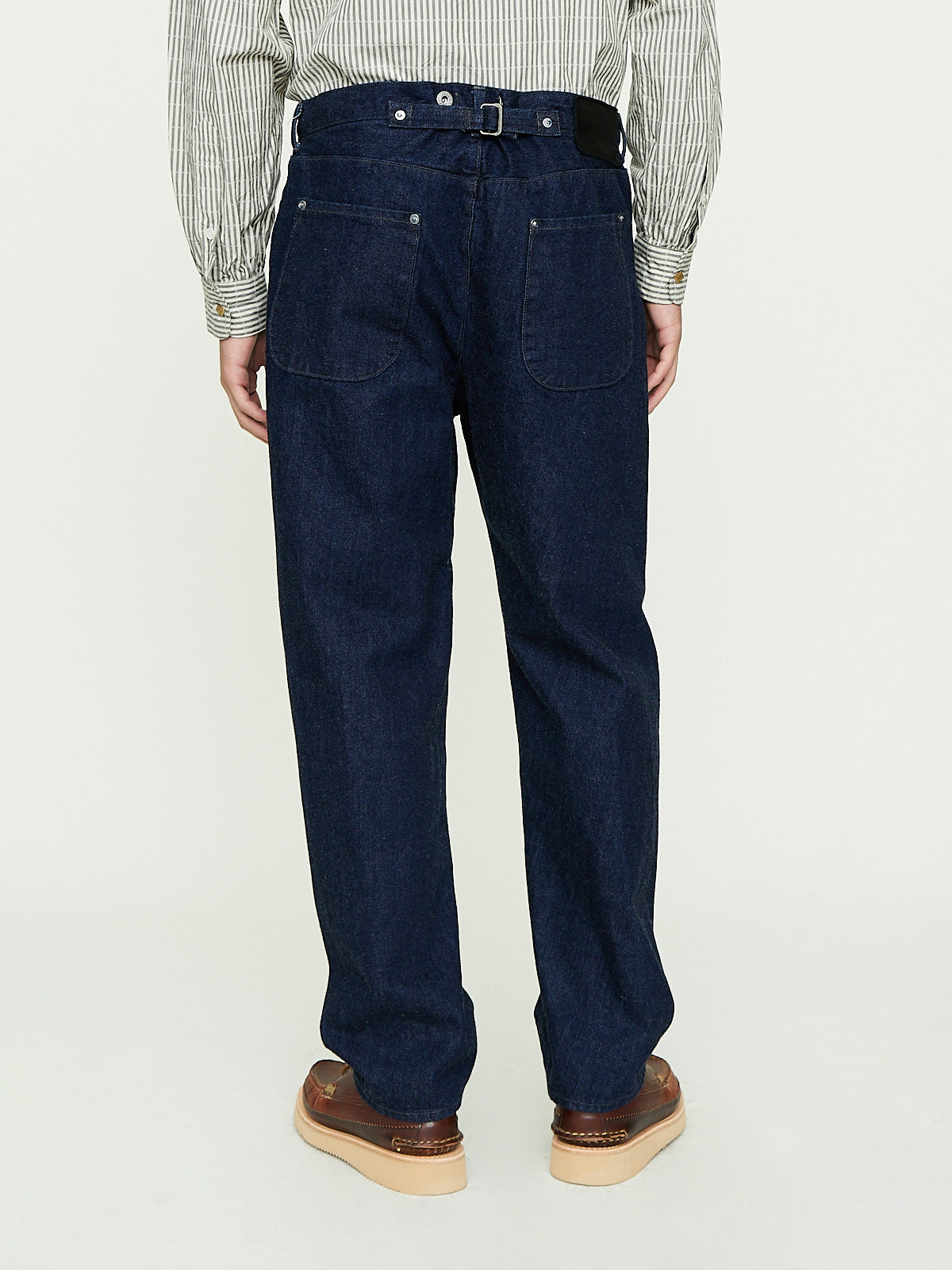 Relaxed carpenter pants in 14oz indigo cotton denim. Button fly and classic 5-pocket styling. Features a back yoke with a cinch-back and deer leather patch. Features contrasting topstitching detailing and metal rivets throughout. Wide legs that taper at the cuffs.