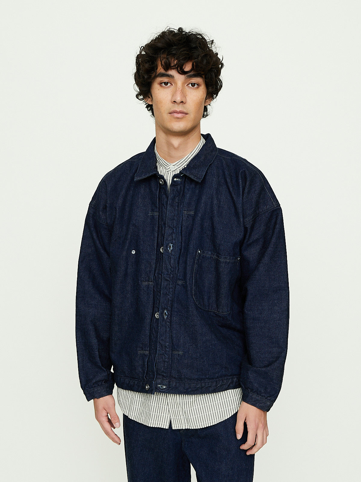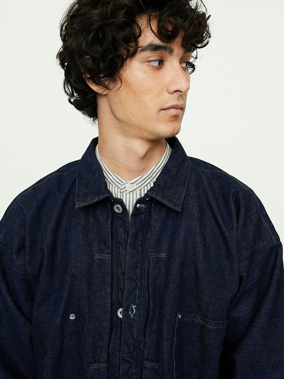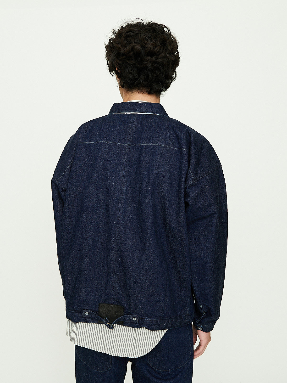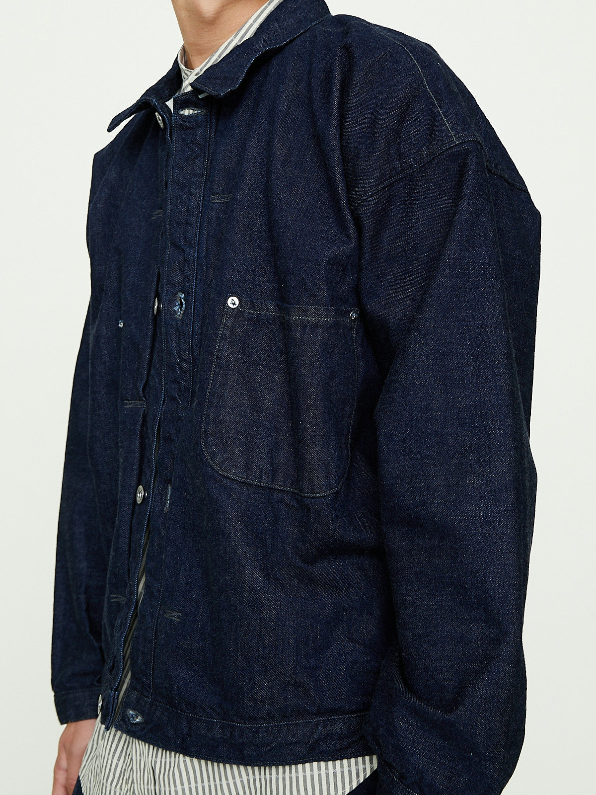 Oversized trucker jacket crafted from 14oz indigo cotton denim. Classic collar, front button fastening and long sleeves with a dropped shoulder with button cuffs. Patch pocket on the chest with an internal chest pocket on the other side and a cinch-back detail. Back yoke. Features a flat kimono-like structure.