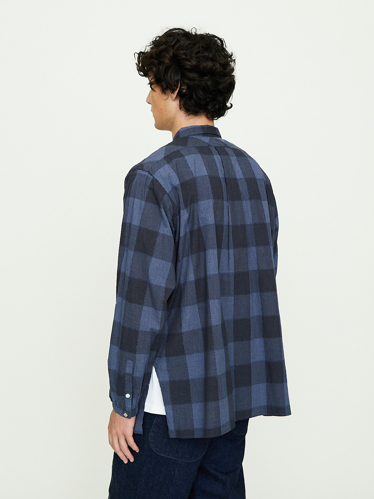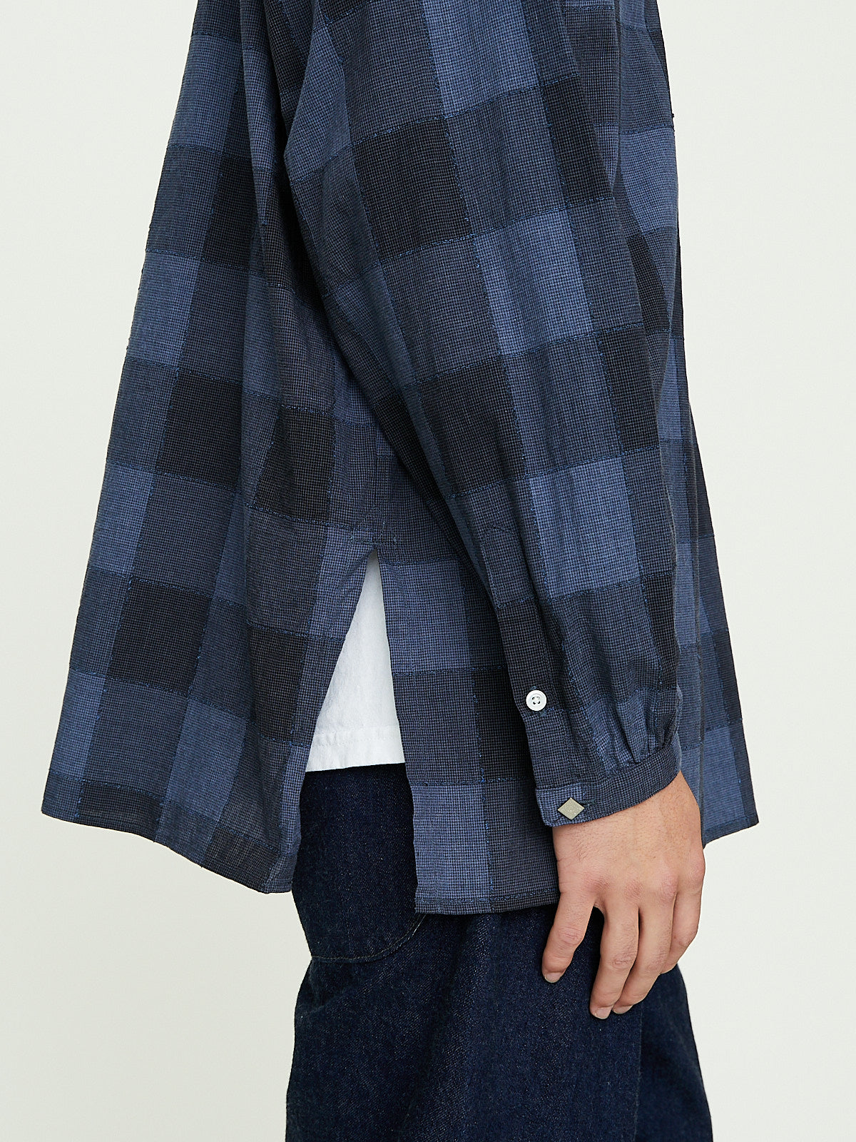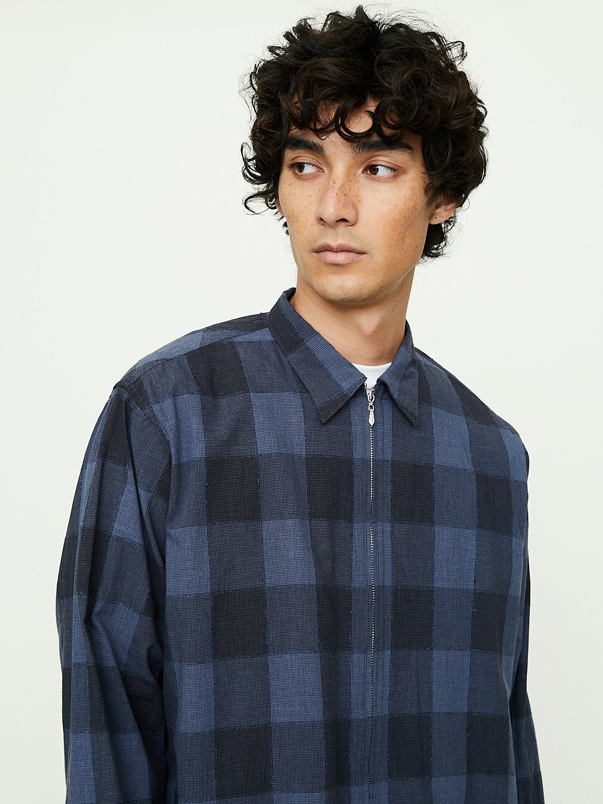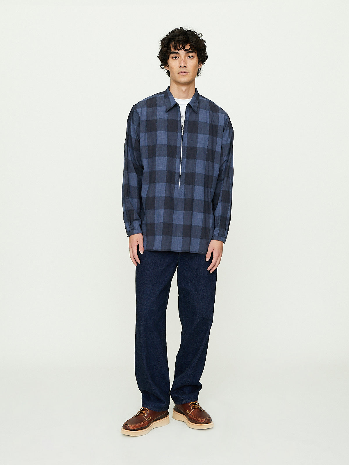 Pullover shirt crafted from navy checked cotton, a deadstock fabric acquired from a closed-down Italian shirting company. Classic shirt collar, partial front zip fastening and long sleeves with buttoned cuffs. Features a back yoke with a box pleat. Straight hemline with side slits. Regular fit.