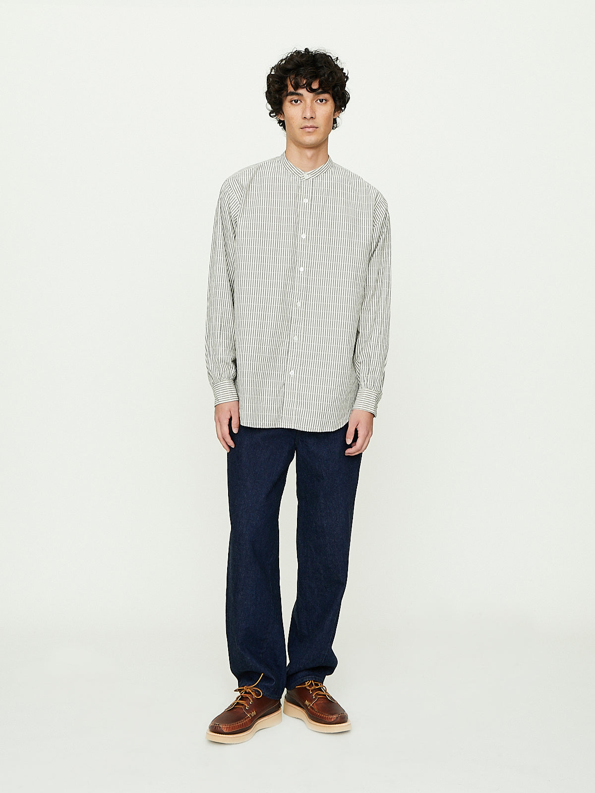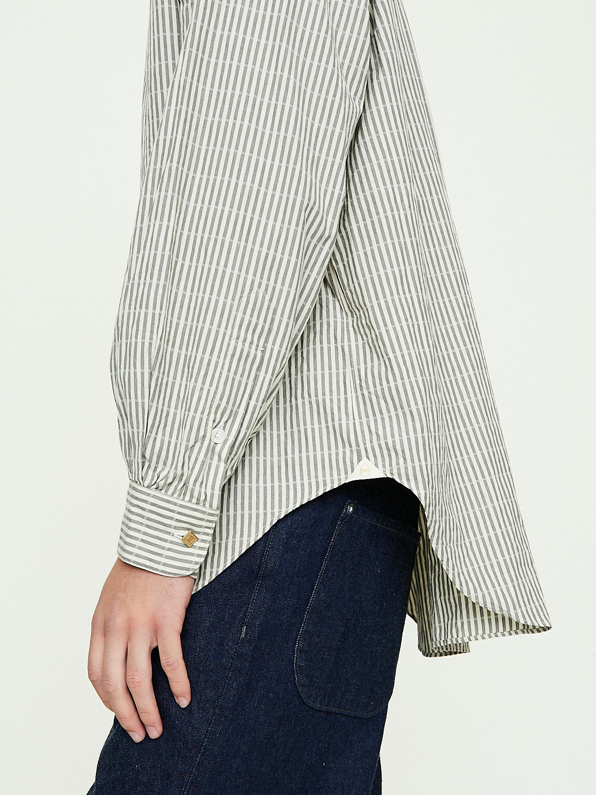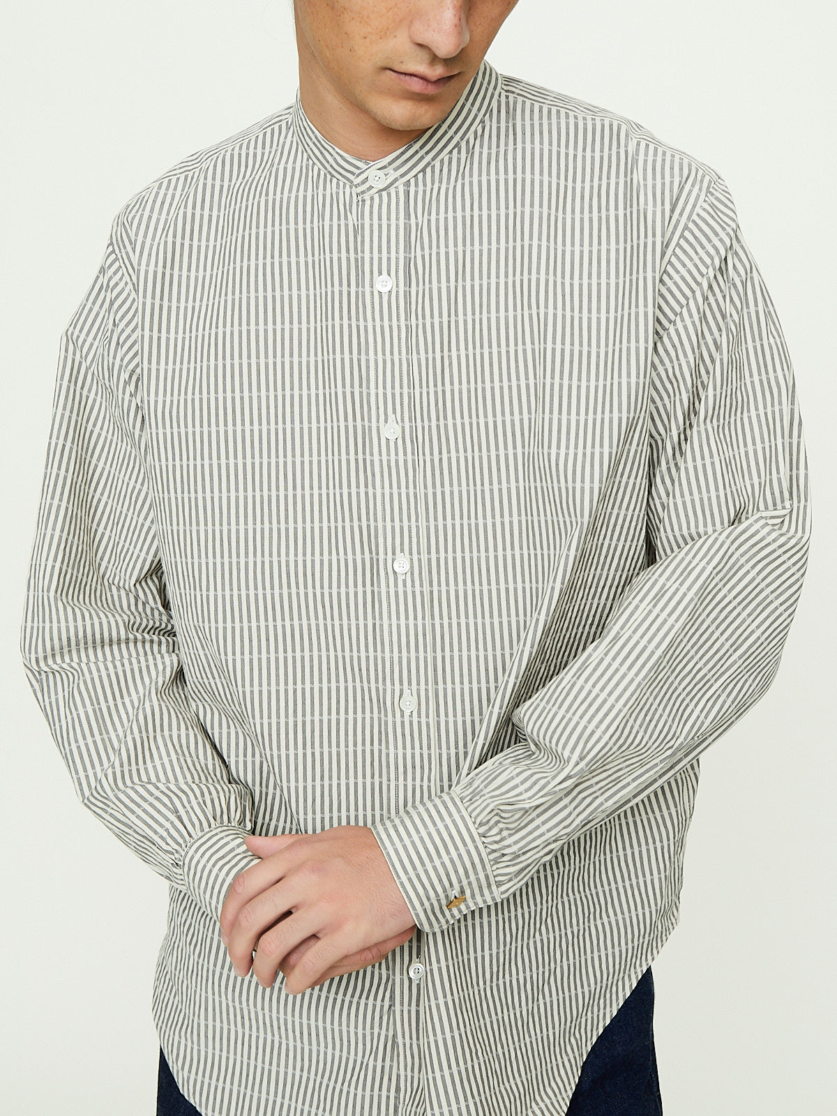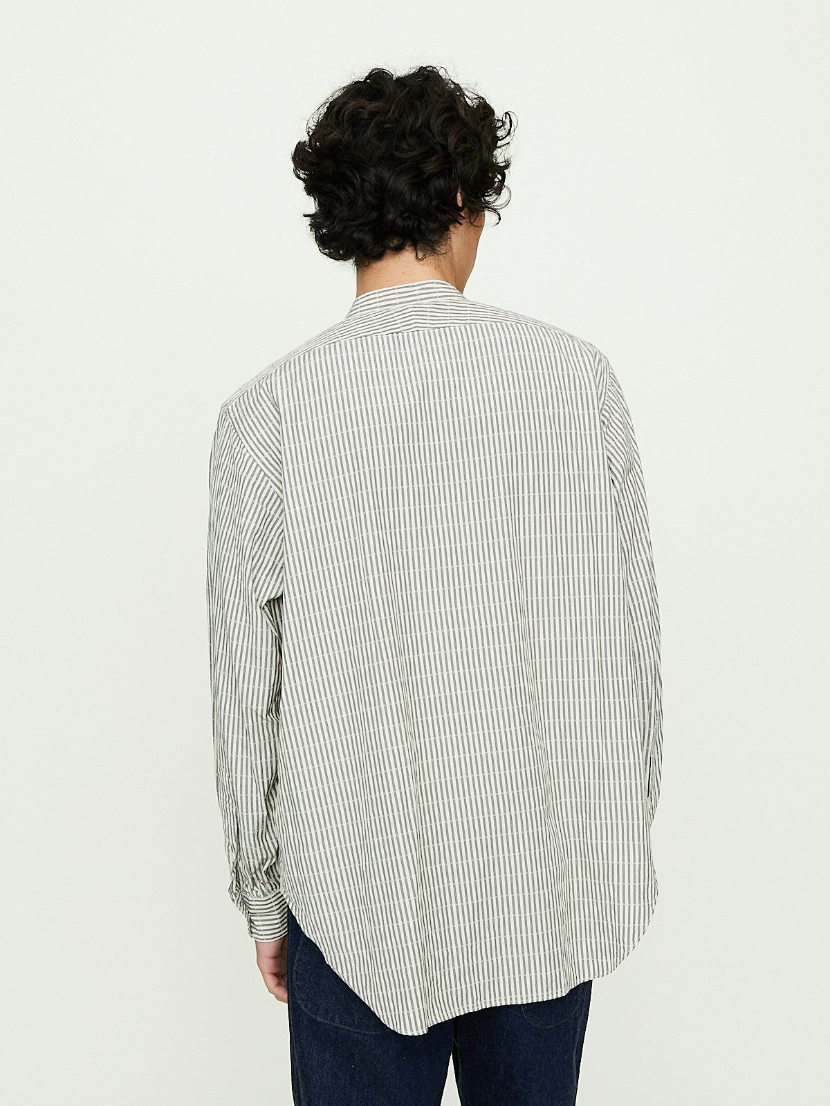 Relaxed shirt made from a grey bespoke dobby cotton broadcloth with a "N" woven into the pattern. Banded collar, front button fastening and long sleeves with buttoned cuffs. Features a small back yoke and a curved hemline.