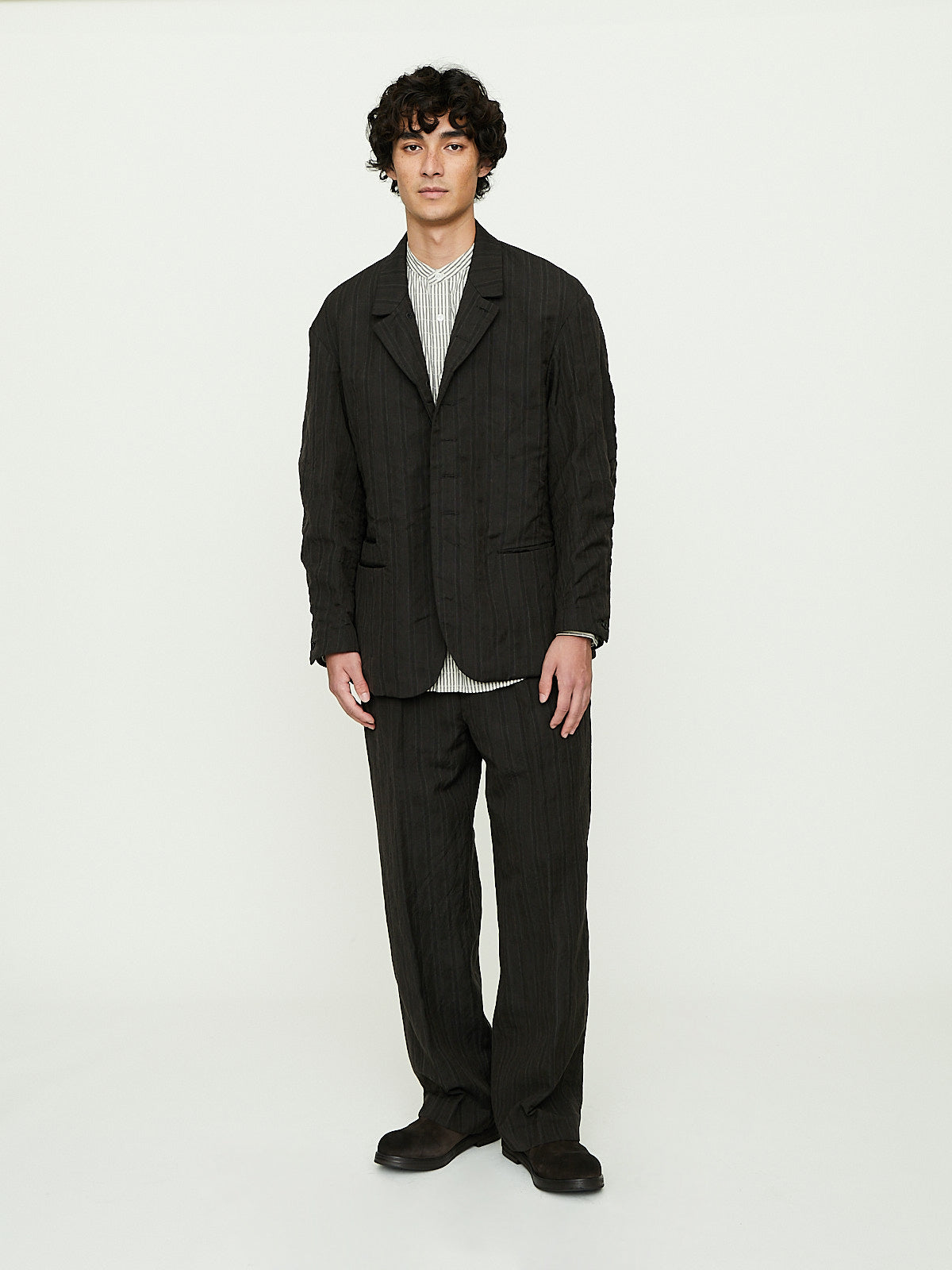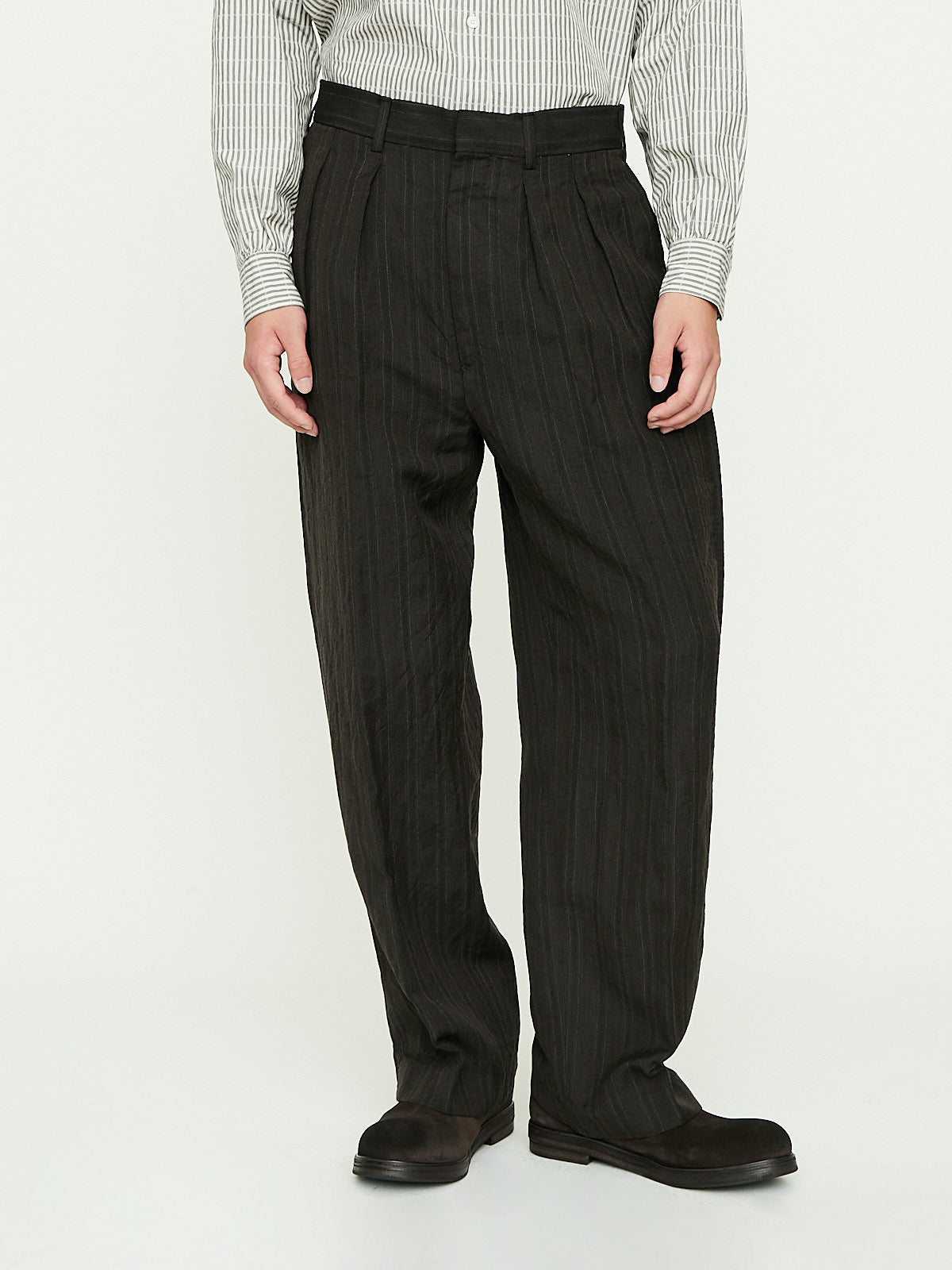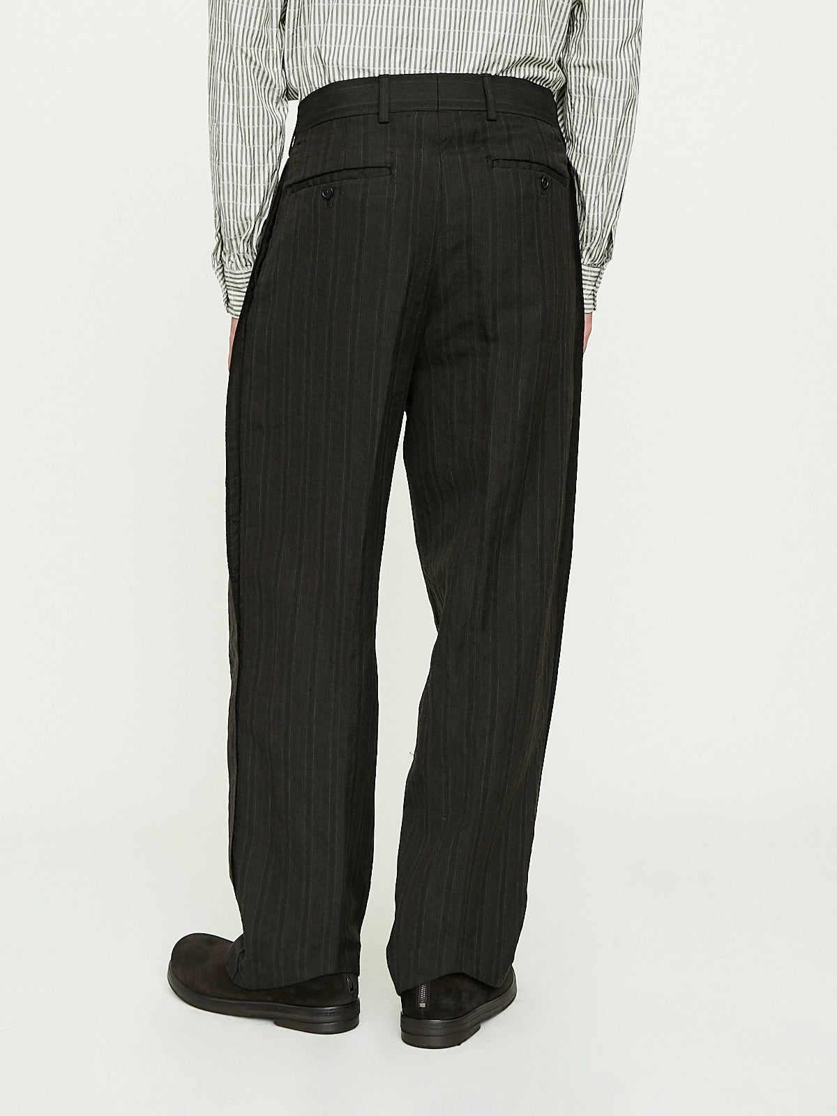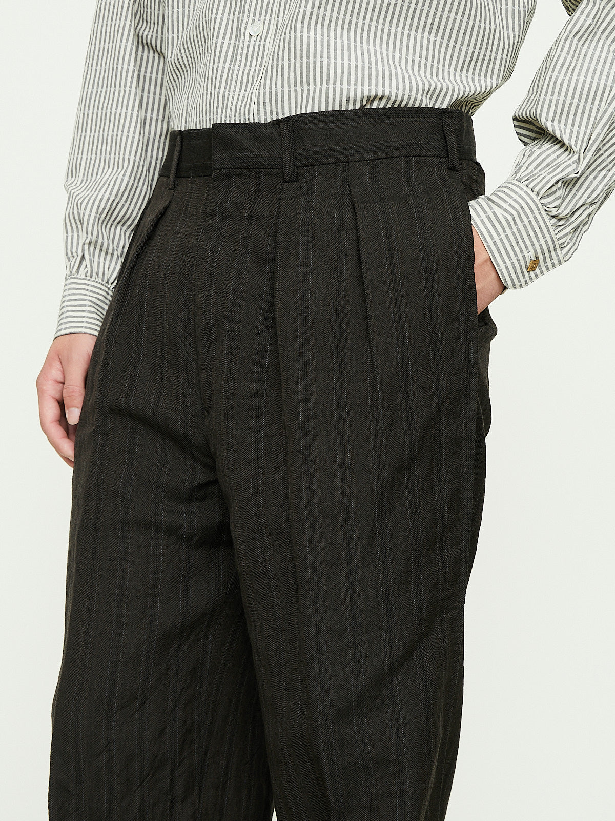 Wide leg striped tailored trouser crafted from brown heathered Merino wool and yarn-dyed black linen with a worn look. Hook and zip fastening, side seam pockets and welted buttoned pockets on the back. Pleated front and with a v-shaped hemline at the cuffs that create a looser silhouette on the front. Oversized fit.