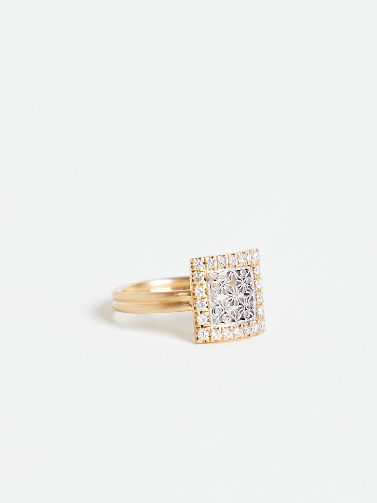 Ring in matte 18k yellow gold with a square platinum ornamental centre that is framed in white diamonds. The platinum detail is created by manipulating the finest platinum strands, by hand, to create delicate, intricate patterns.