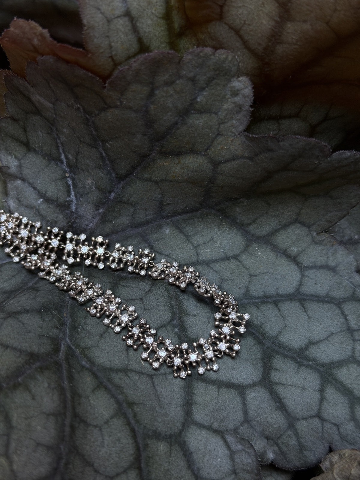 Intricate bracelet in 14k yellow gold encrusted with 120 (0.98ct) brown diamonds. Features a lobster claw clasp.