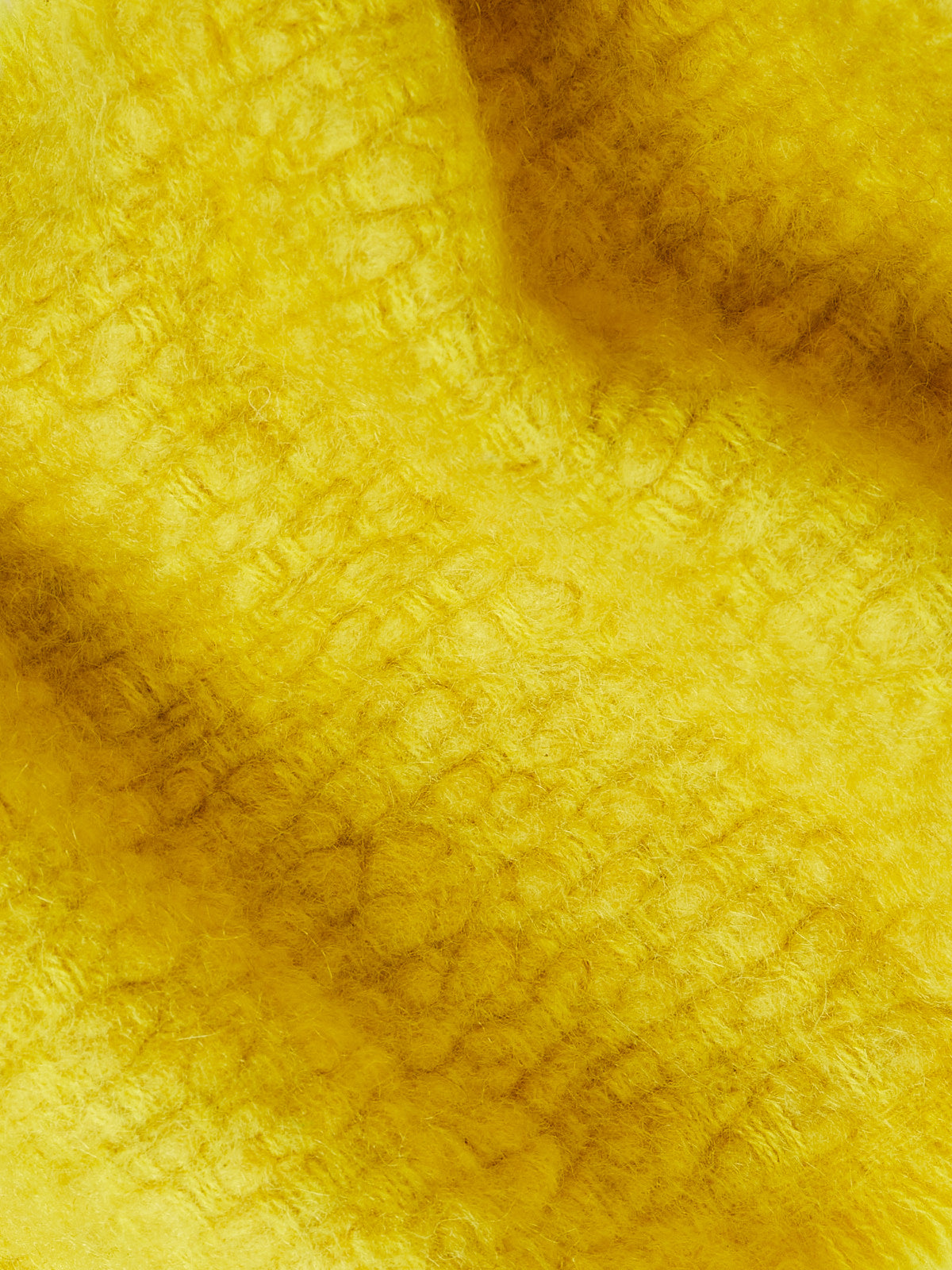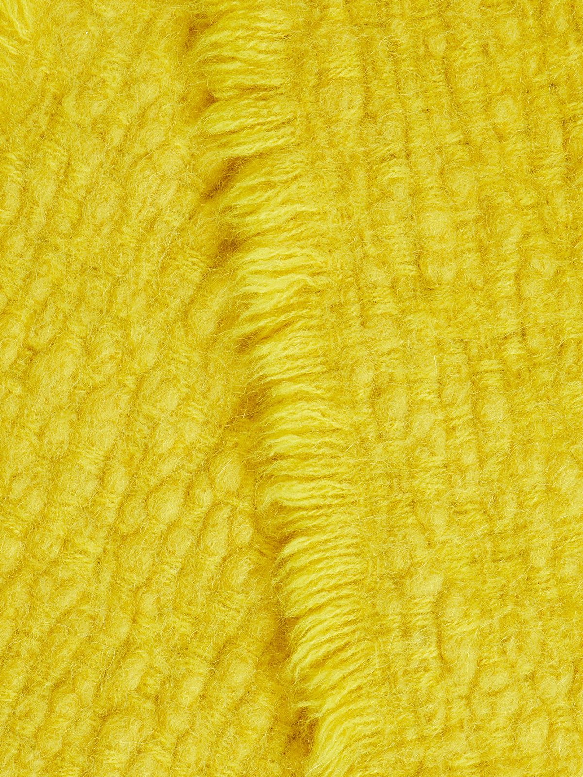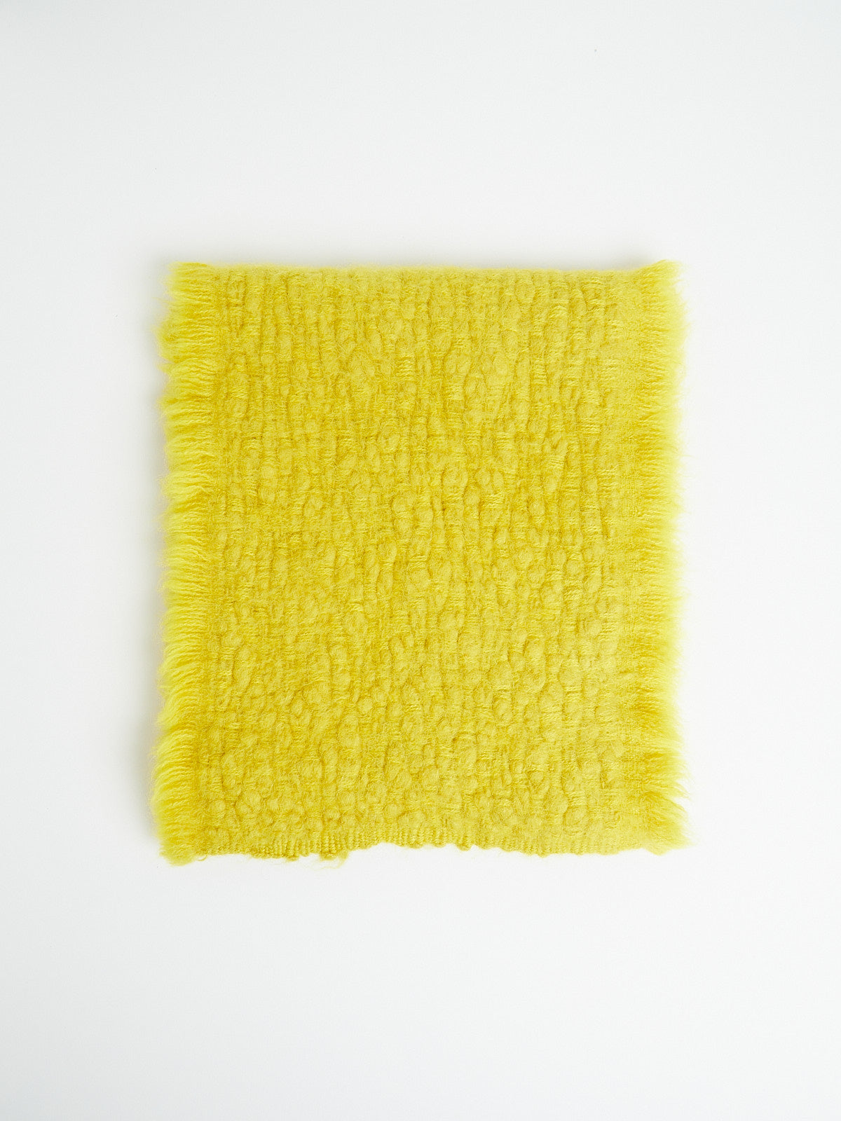 Neck warmer made from yellow pure yak khullu with a thick, warm weave and a fringed edge. The finished fabric is boiled for added density and a fleece-like touch. It can be worn knotted snugly around the neck or pinned for a looser fit. The pin is included with the piece.