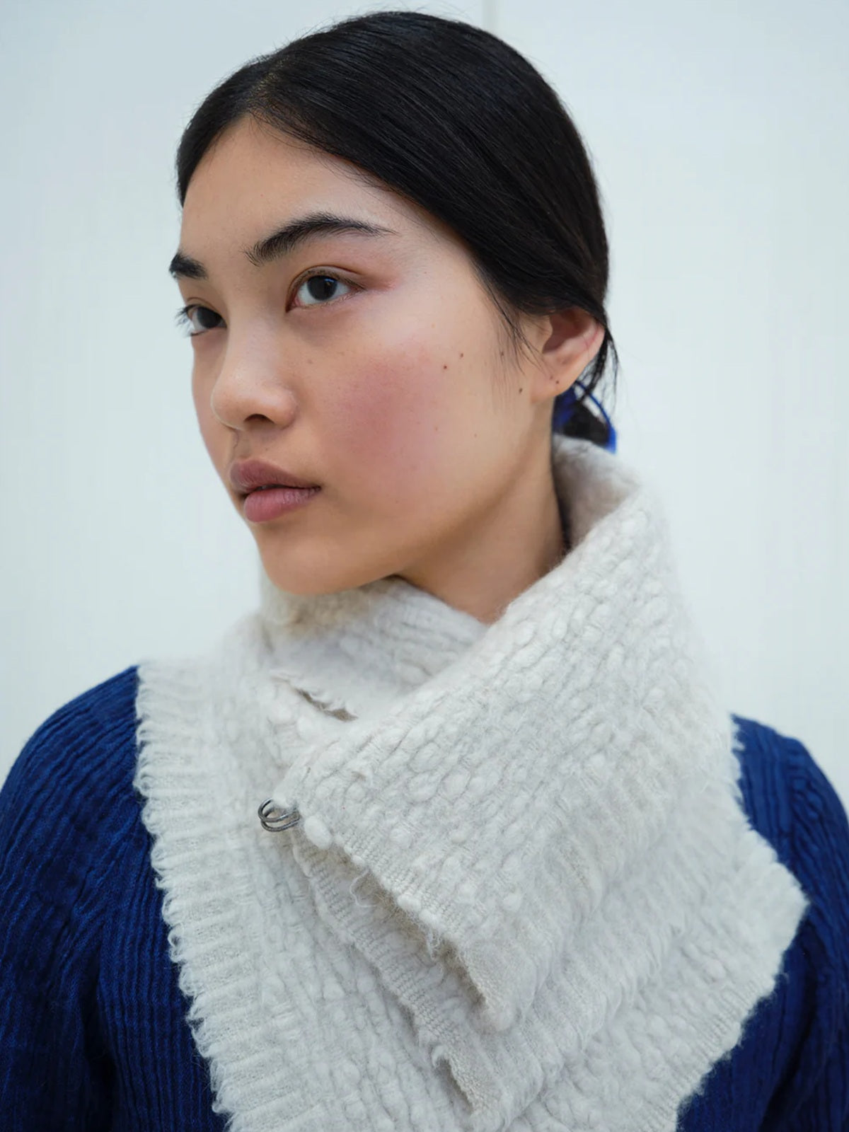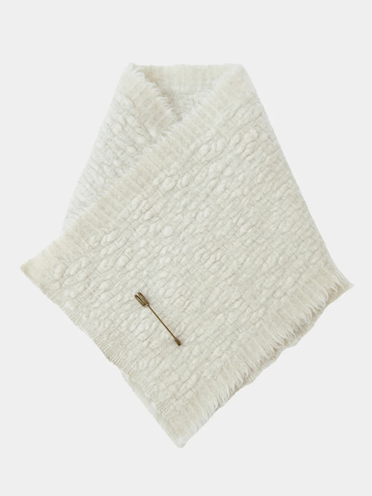 Neck warmer made from natural white pure yak khullu in a thick, warm weave. The finished fabric is boiled for added density and a fleece-like touch. It can be worn knotted snugly around the neck or pinned for a looser fit. The pin is included with the piece. 2cm raw fringe.