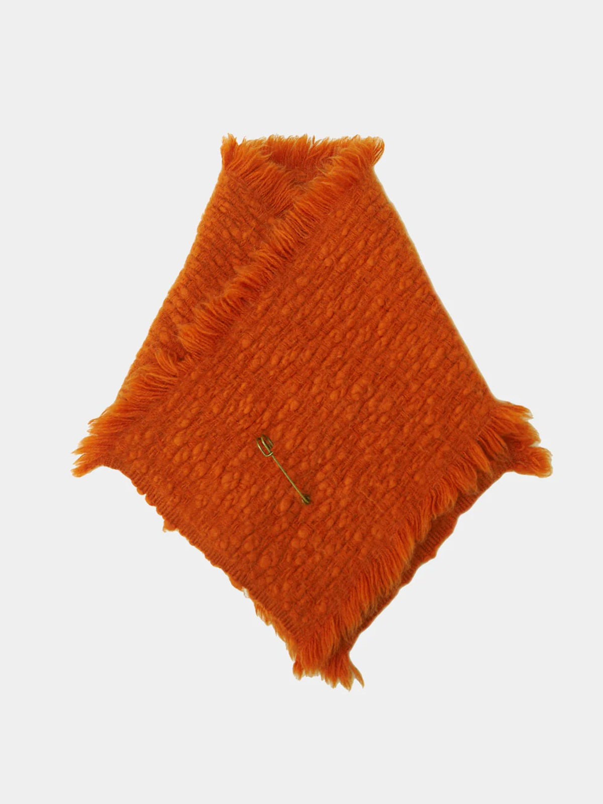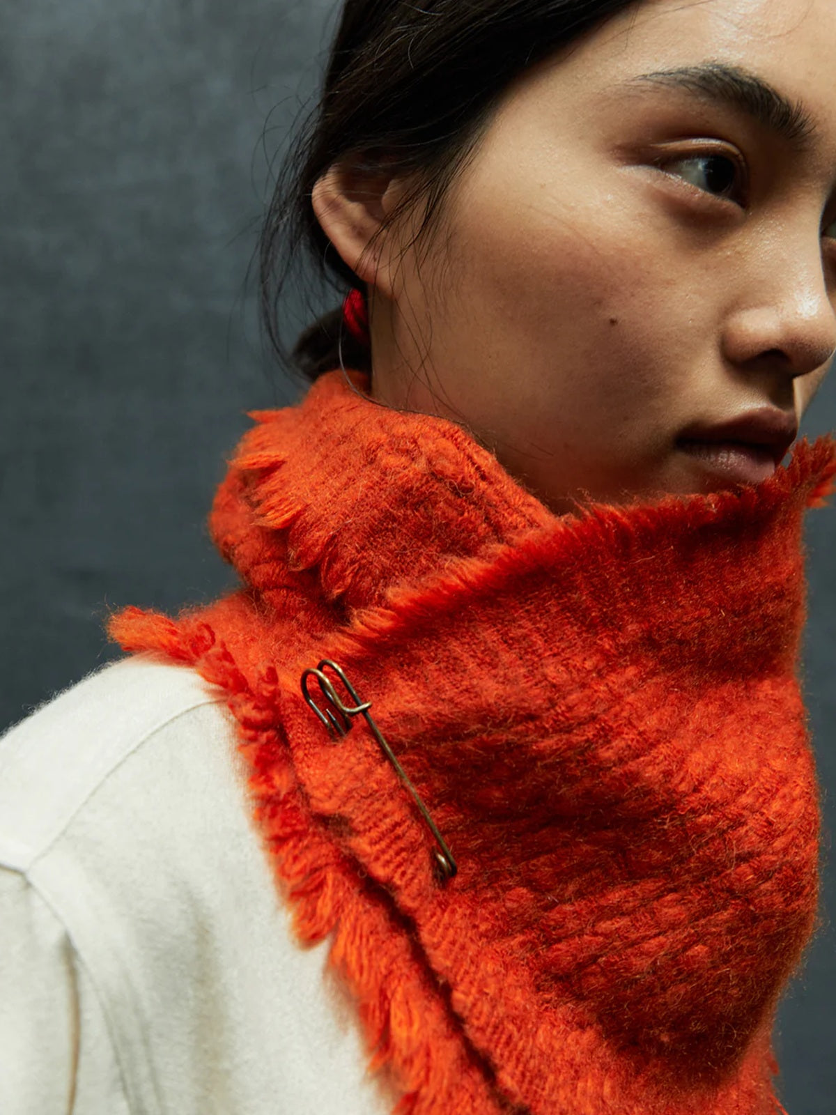 Neck warmer made from orange pure yak khullu in a thick, warm weave. The finished fabric is boiled for added density and a fleece-like touch. It can be worn knotted snugly around the neck or pinned for a looser fit. The pin is included with the piece. 2cm raw fringe.