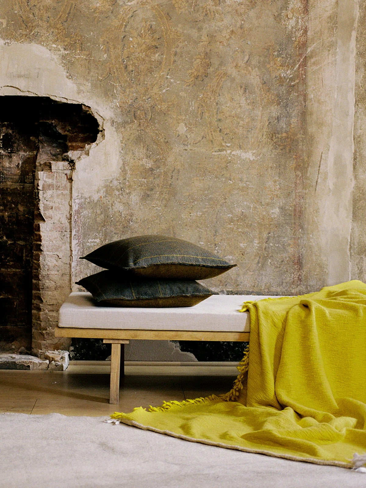 Blanket in yellow yak khullu made from Norlha’s heaviest weave. Its handspun weft creates a softly ridged texture across its surface. Features thick handspun fringing along its longer sides and a border of hand-woven yarn in a lighter tone along its selvedge.