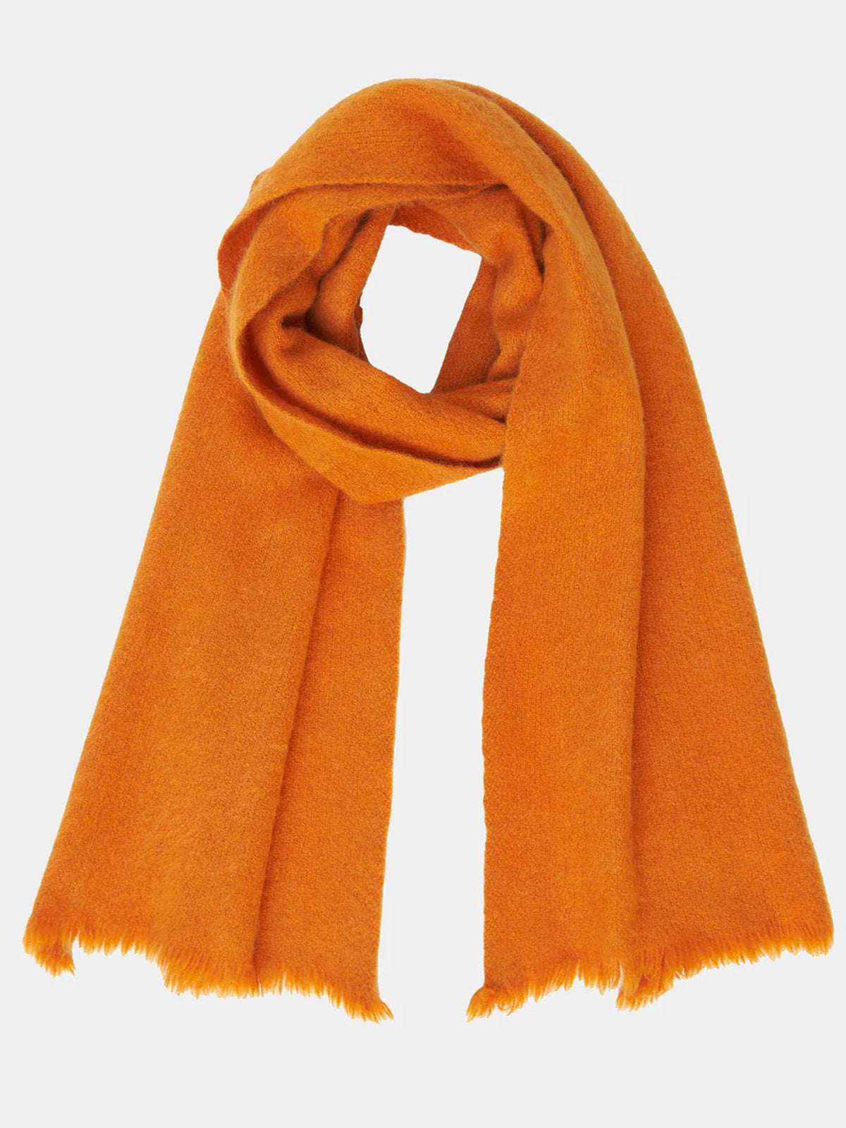 Skinny scarf made from orange pure yak khullu and lightly boiled for a dense, fleece-like touch. Features a 2cm raw fringe.