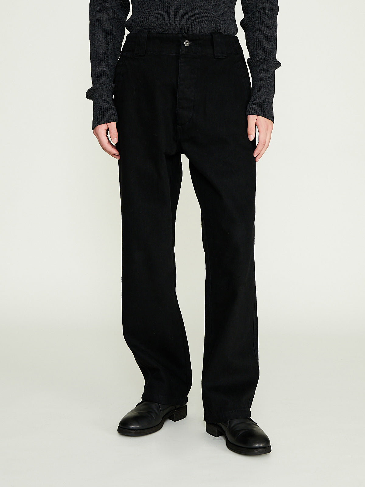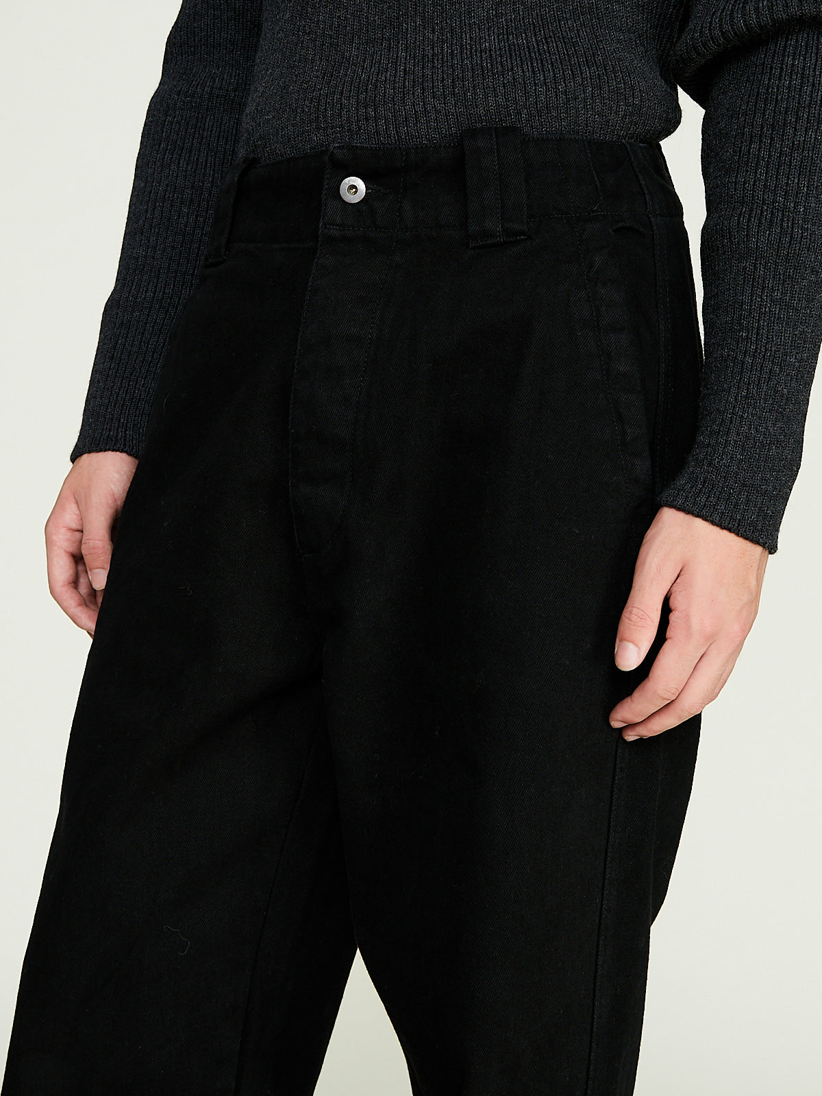 Oversized workwear-inspired pants in black organic cotton denim. Button fly, belt loops and slash pockets on the front. One patch pocket on the back. Wide legs.