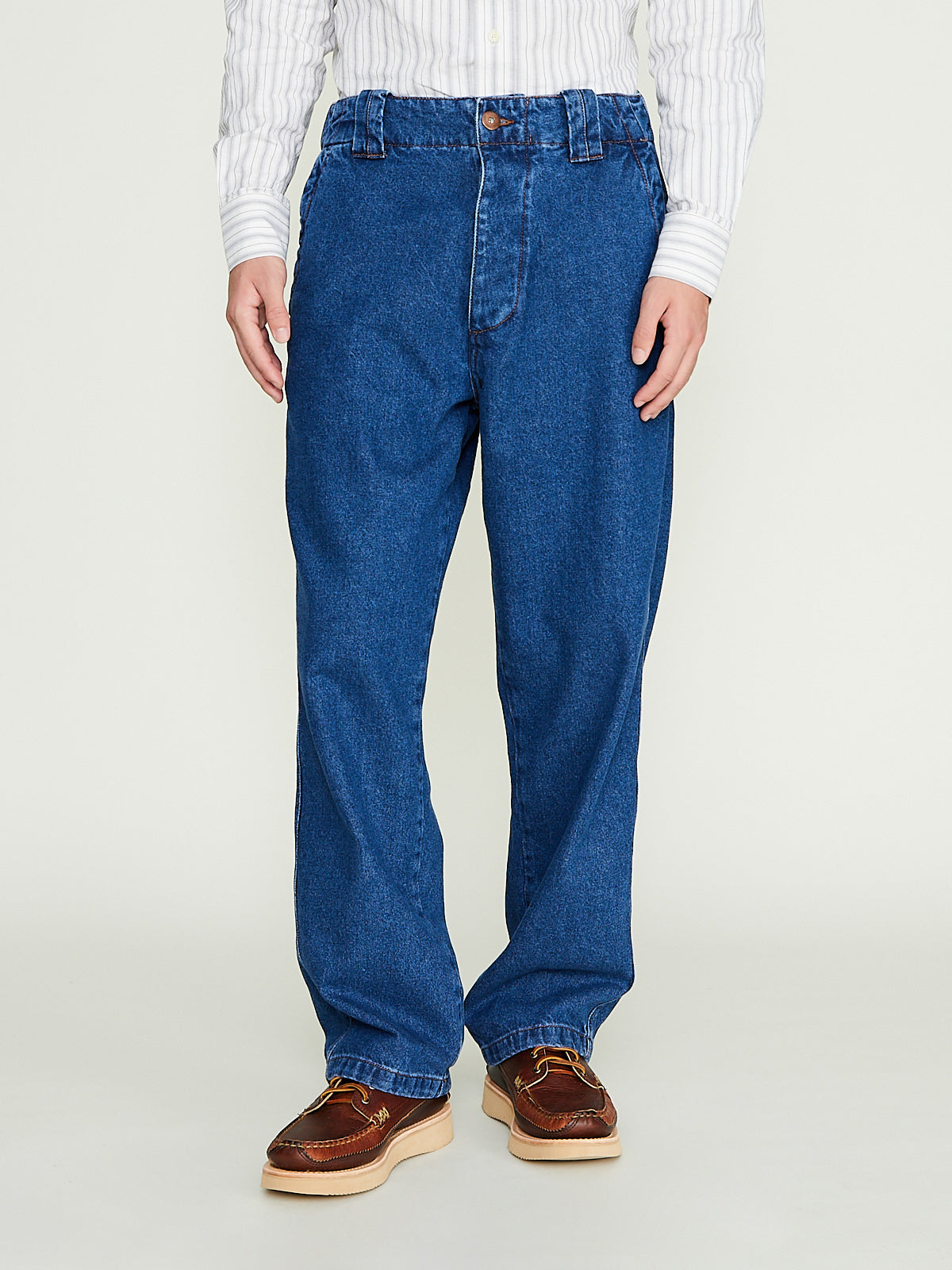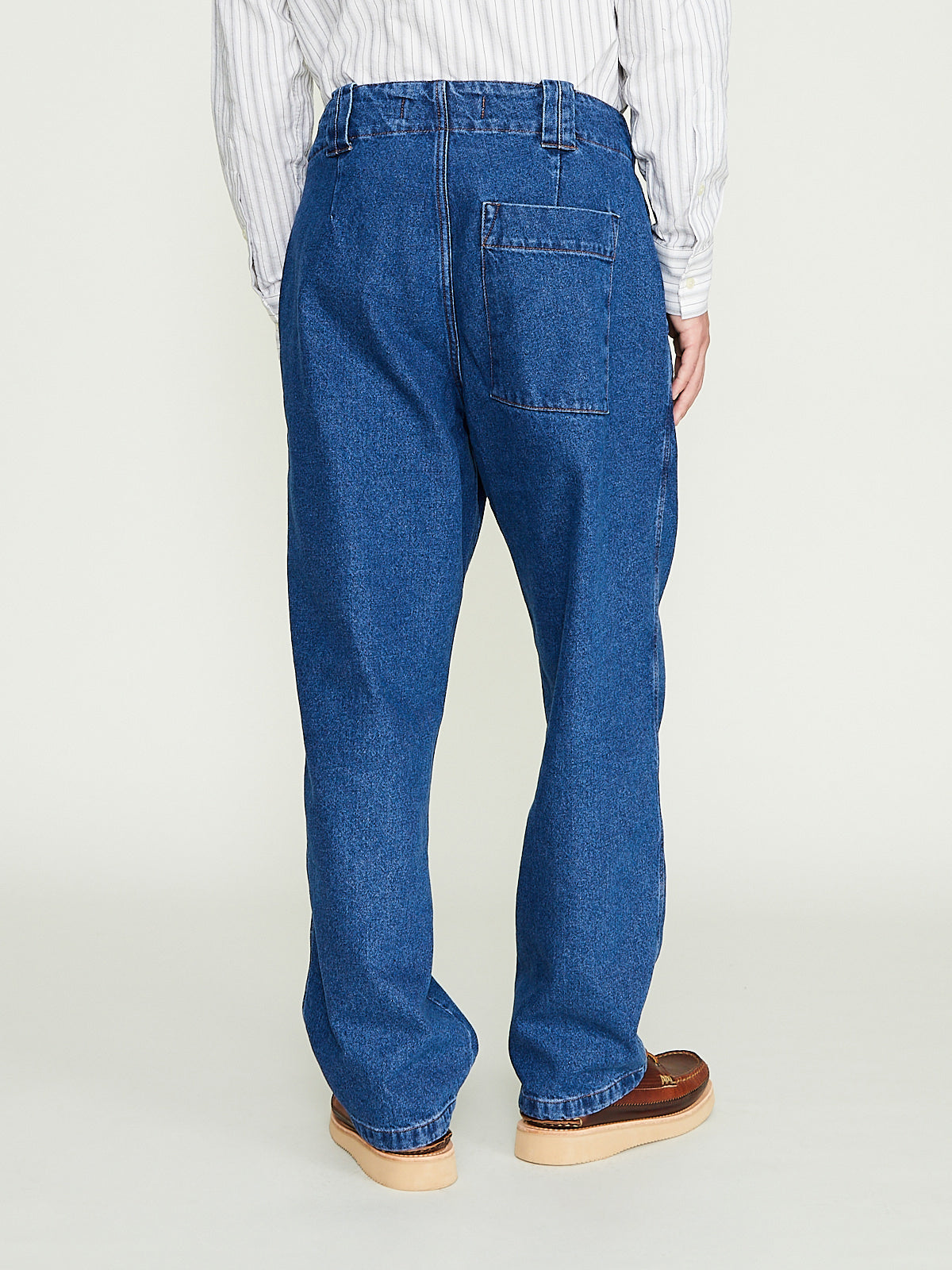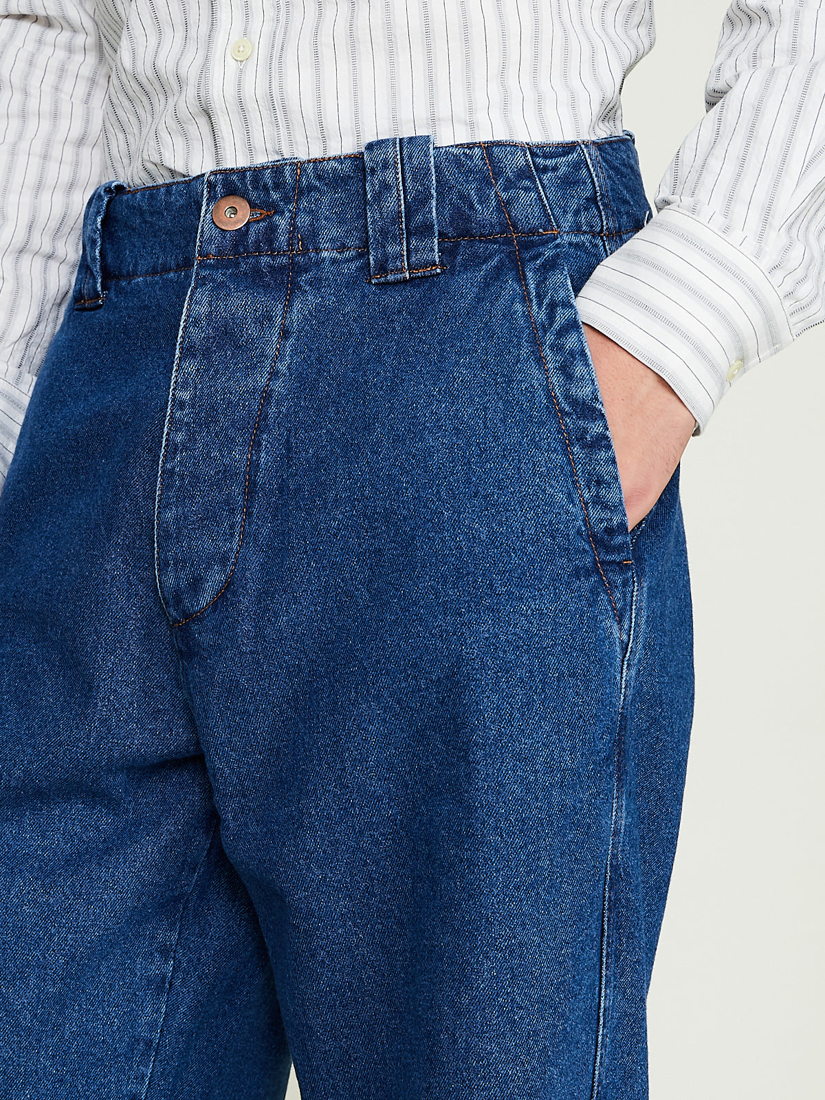 Oversized workwear-inspired pants in blue cotton denim. Button fly, belt loops and slash pockets on the front. One patch pocket on the back. Wide legs.