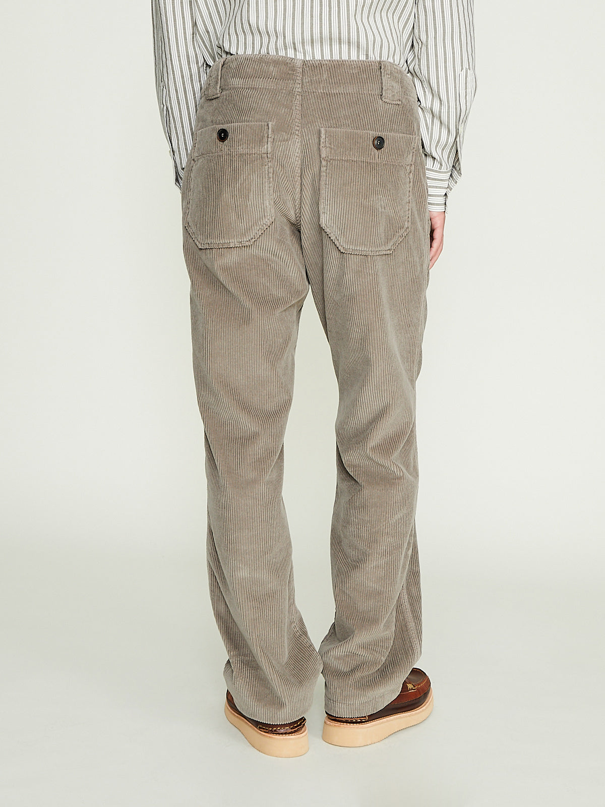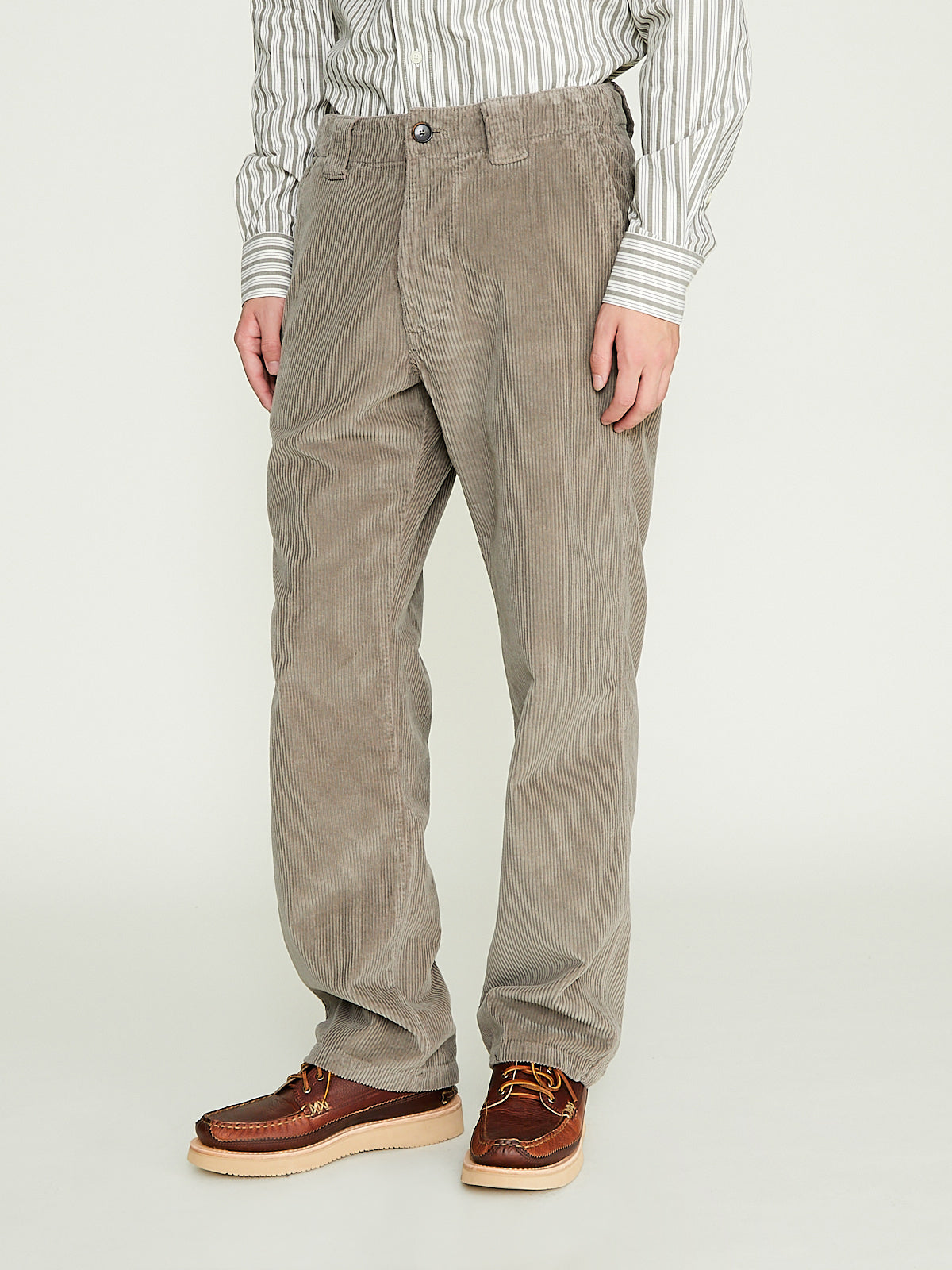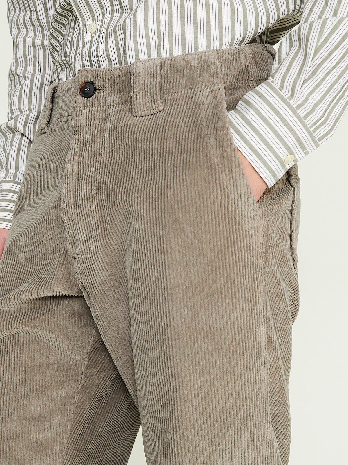 Wide pants in stone grey cotton corduroy. Zip fly, belt loops and slash pockets on the front. Two buttoned patch pocket on the back. Straight leg. Relaxed fit.
