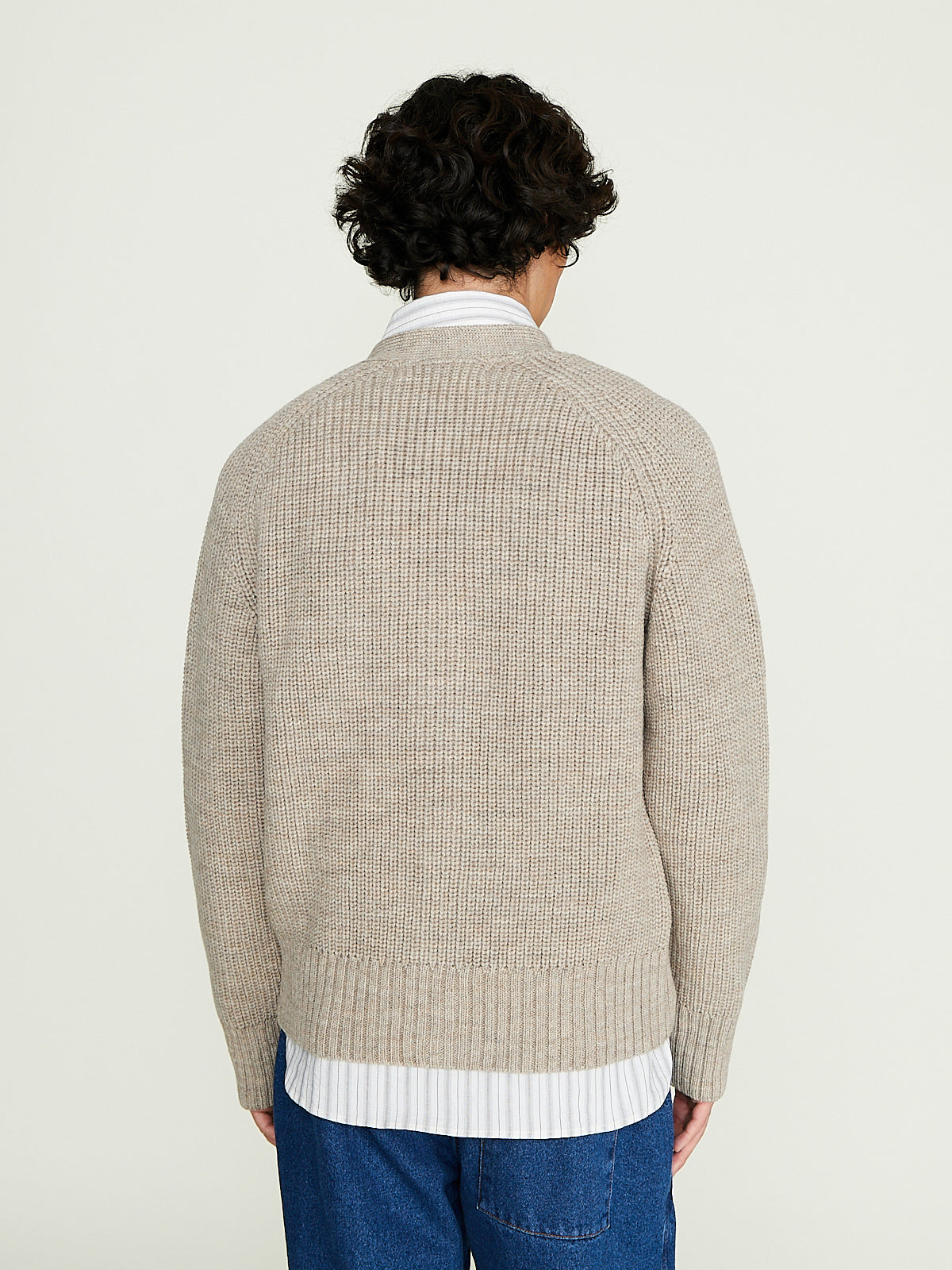 Classic rib-knit cardigan in a beige wool melange. V-neck, font button fastening and long raglan sleeves. Rib detail around the cuffs and bottom hem. Regular fit.