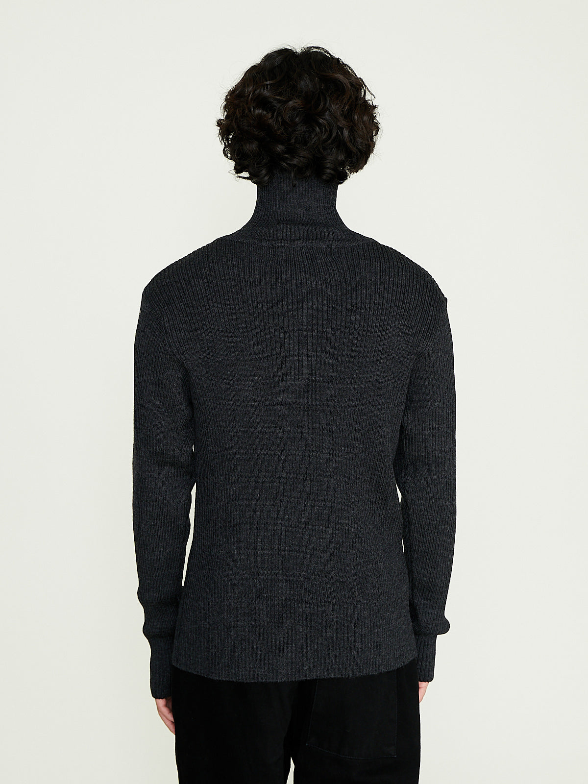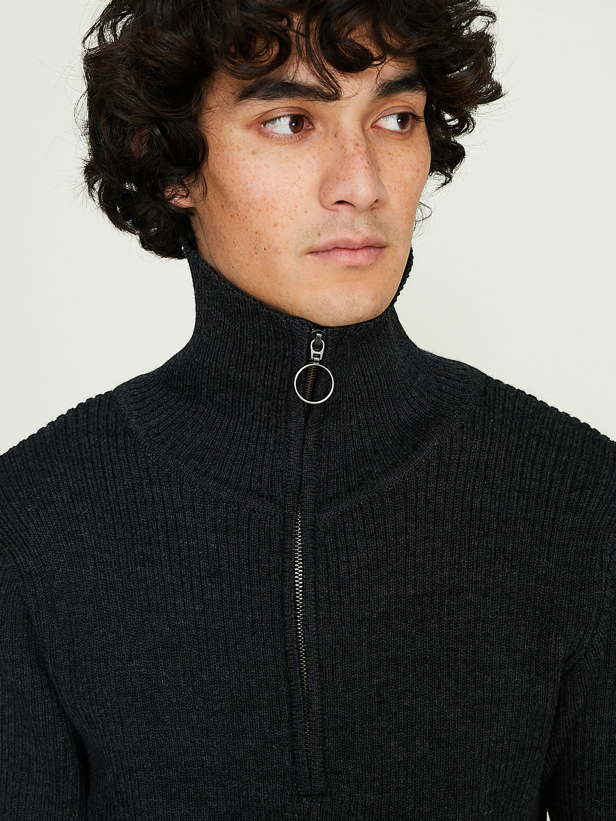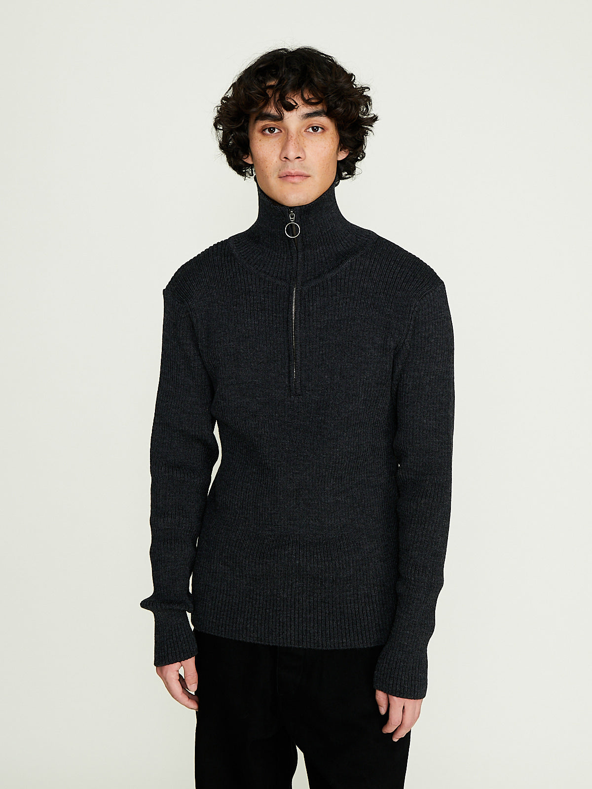 Rib-knit sweater in dark grey virgin wool melange. High neckline and a partial front zip fastening. Slim fit.