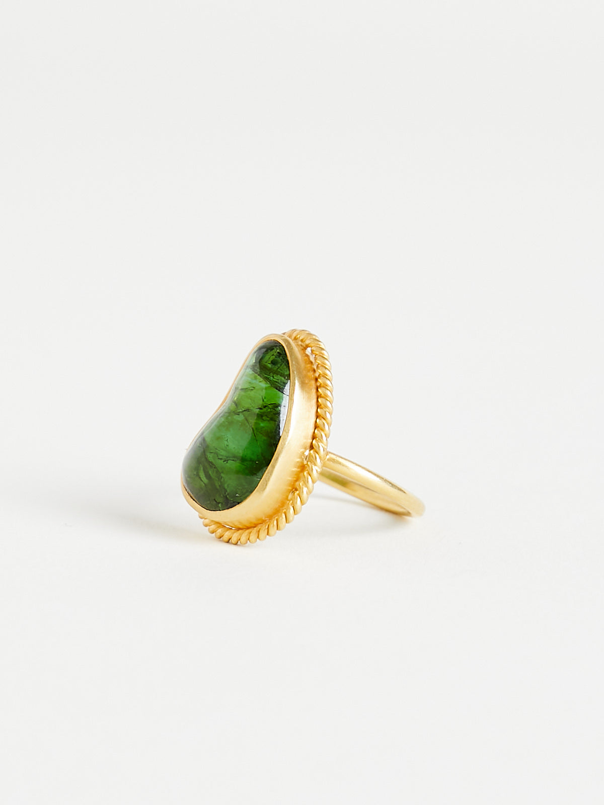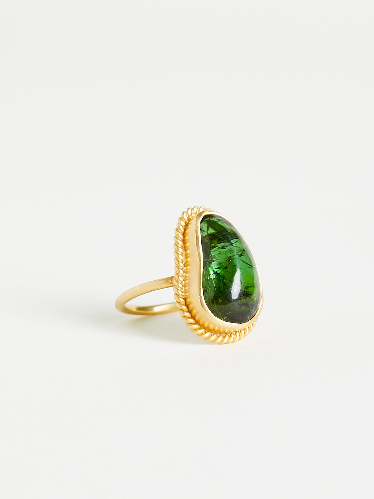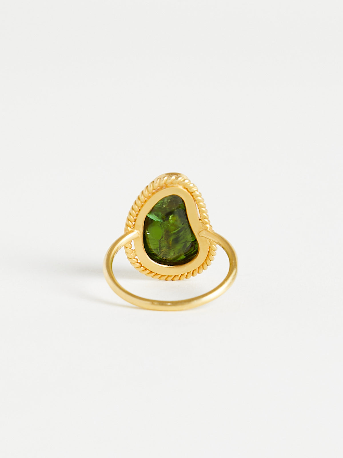Handcrafted ring in 18k yellow gold with a bezel-set organic-shaped green tourmaline with a decorative rope detail around the stone.