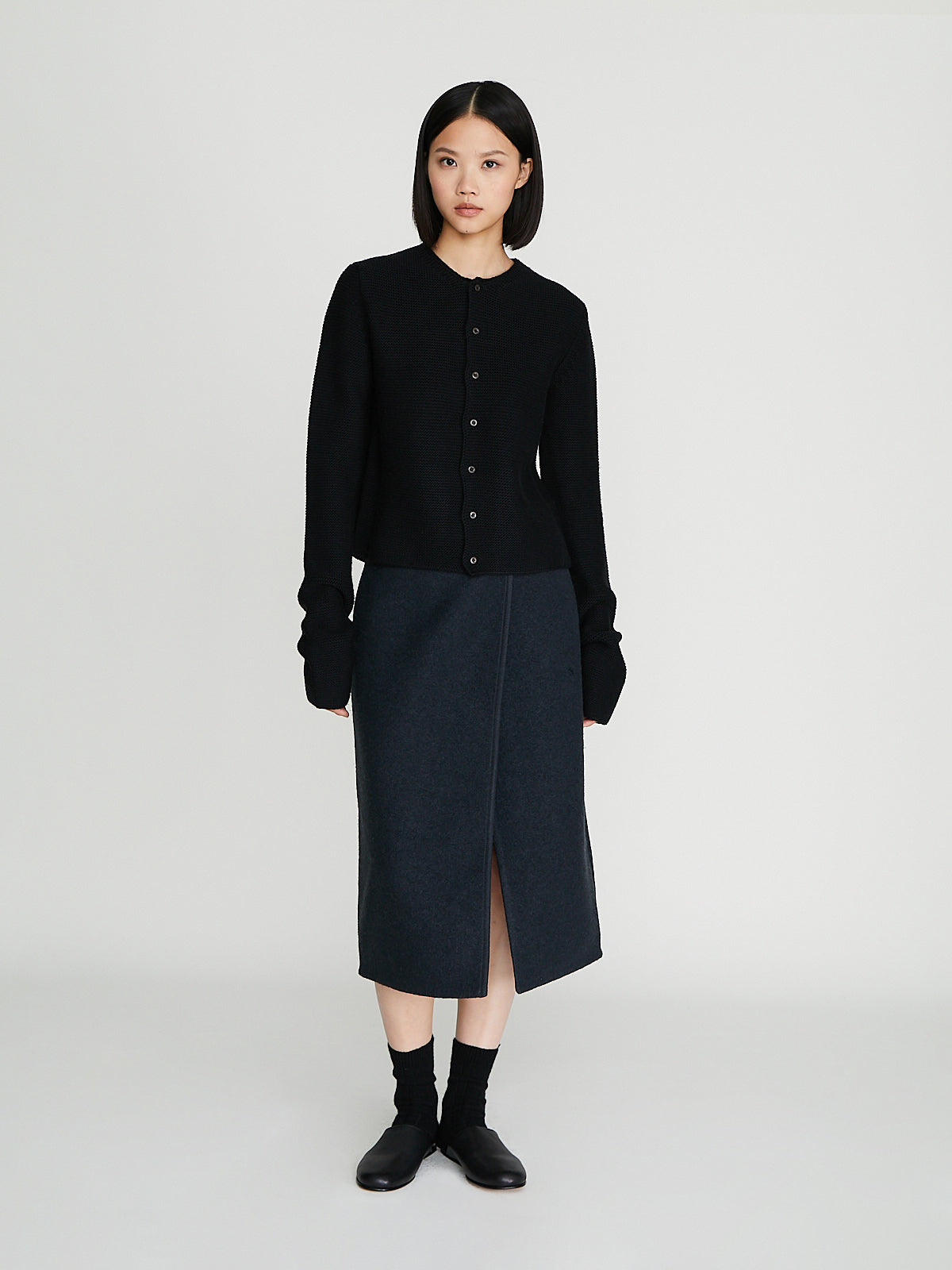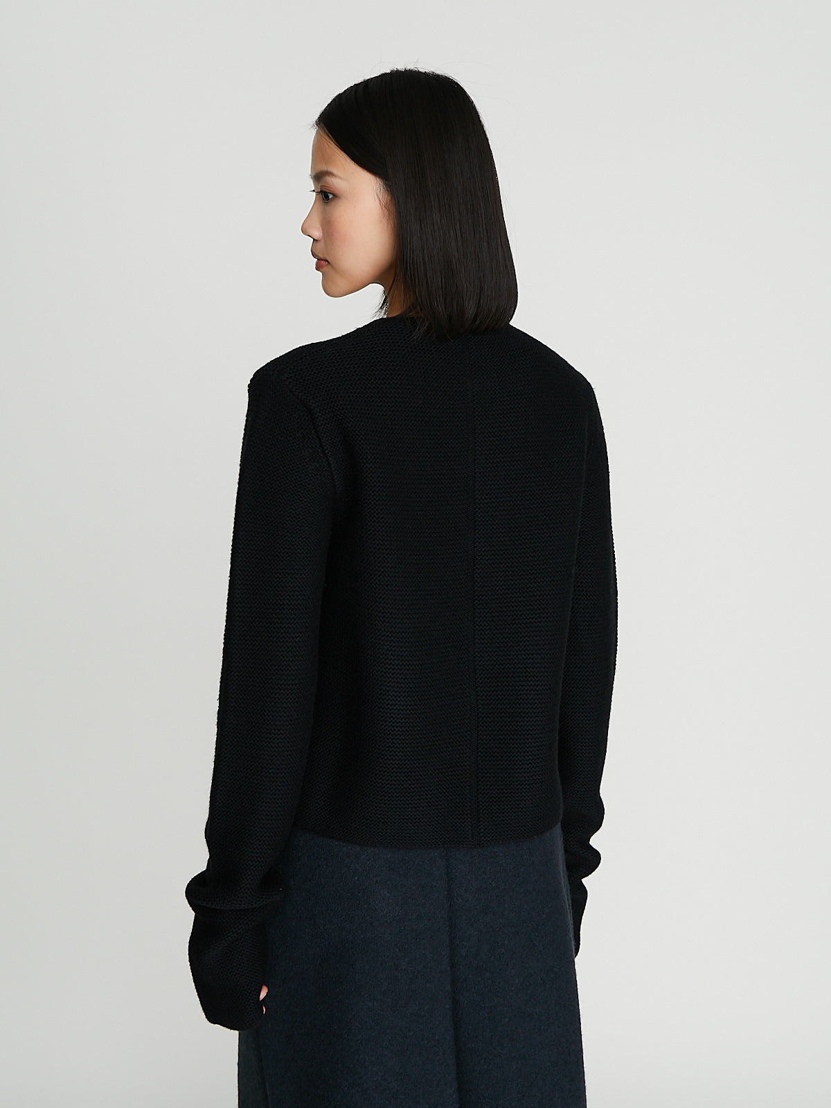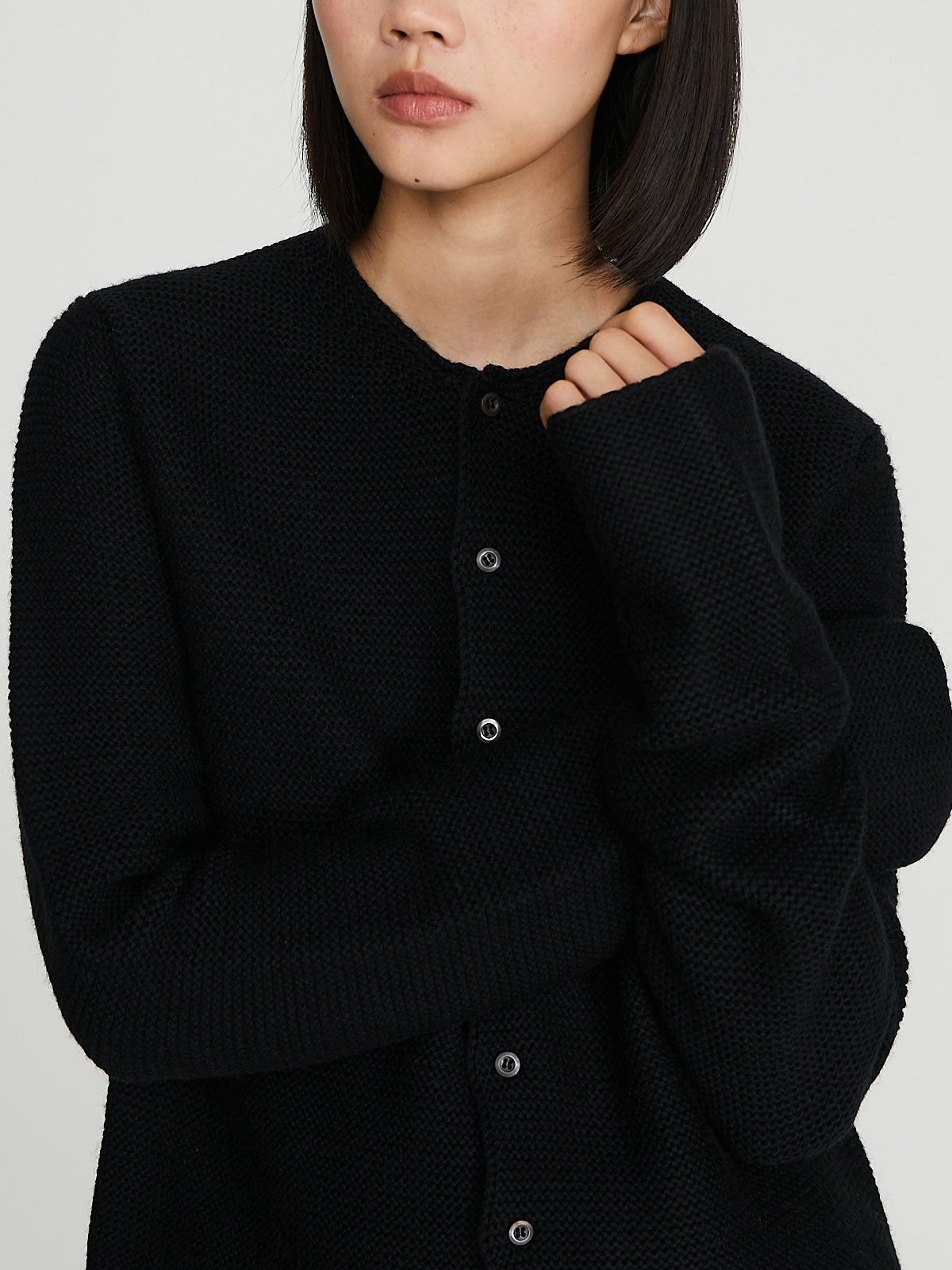 Knitted cardigan in black wool. Round neckline and a front mother-of-pearl button fastening. Rib detail around the neck. Boxy fit.
