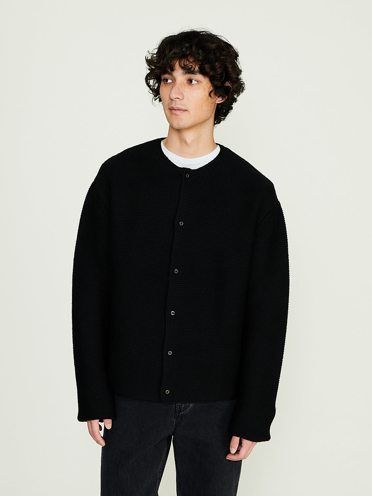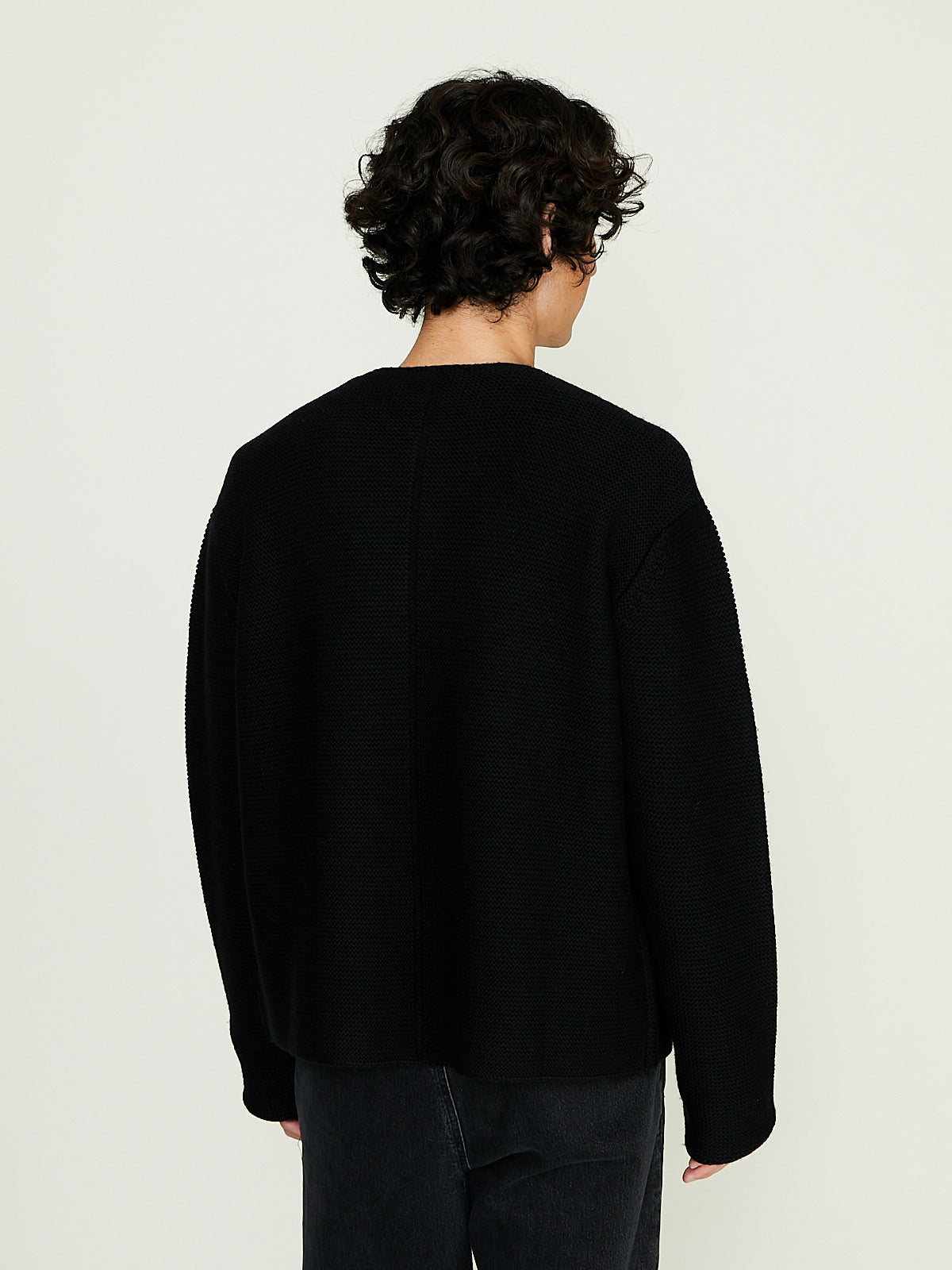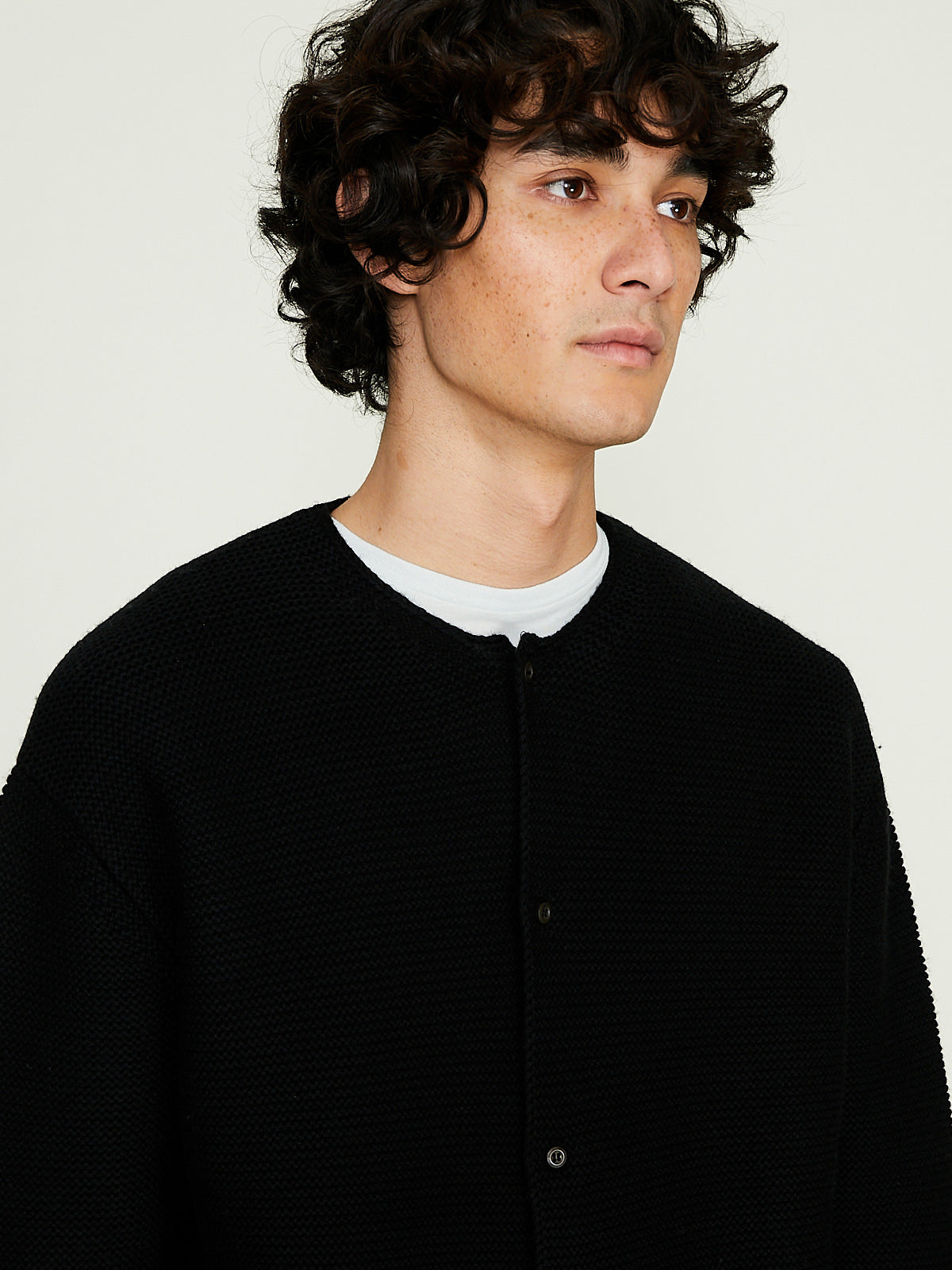 Oversized knitted cardigan in black wool. Round neckline and a front mother-of-pearl button fastening. Long sleeves with a dropped shoulder. Rib detail around the neck. Boxy fit.