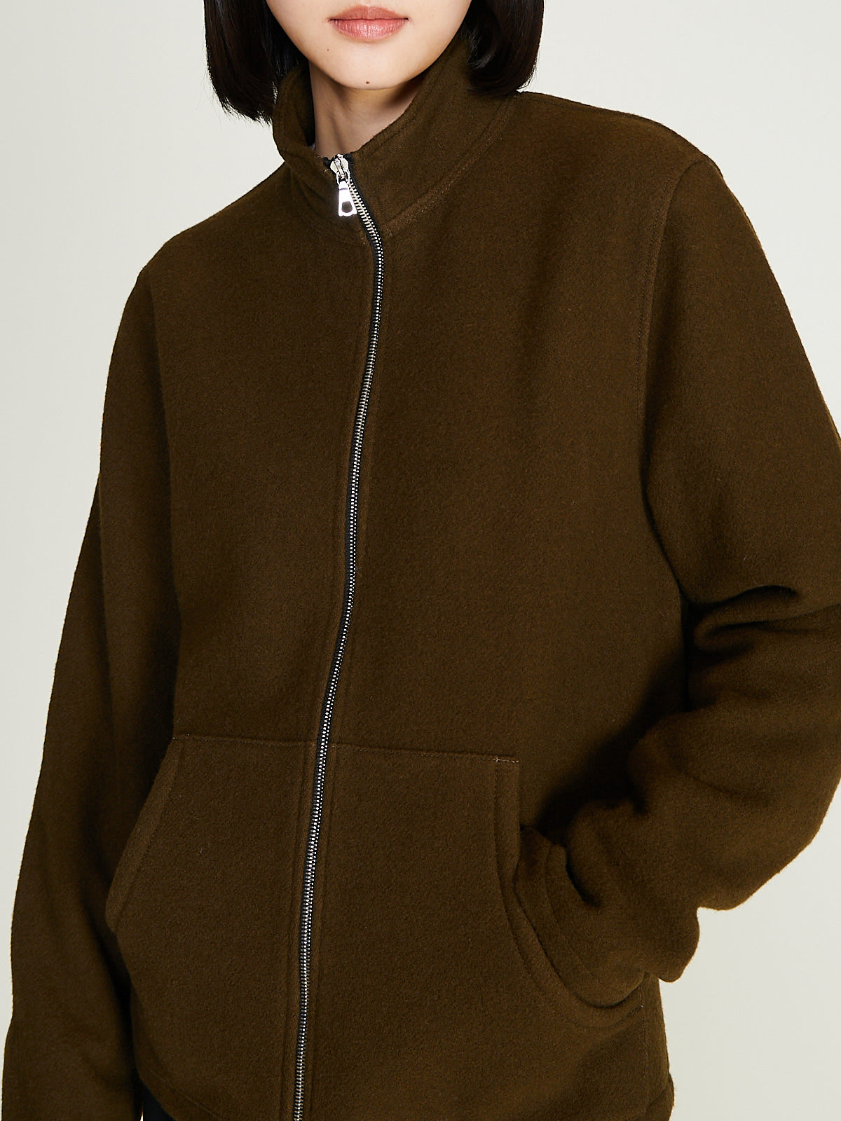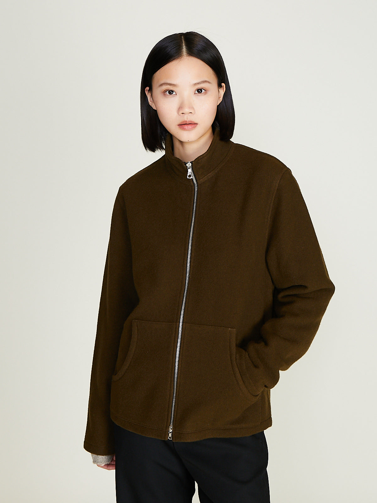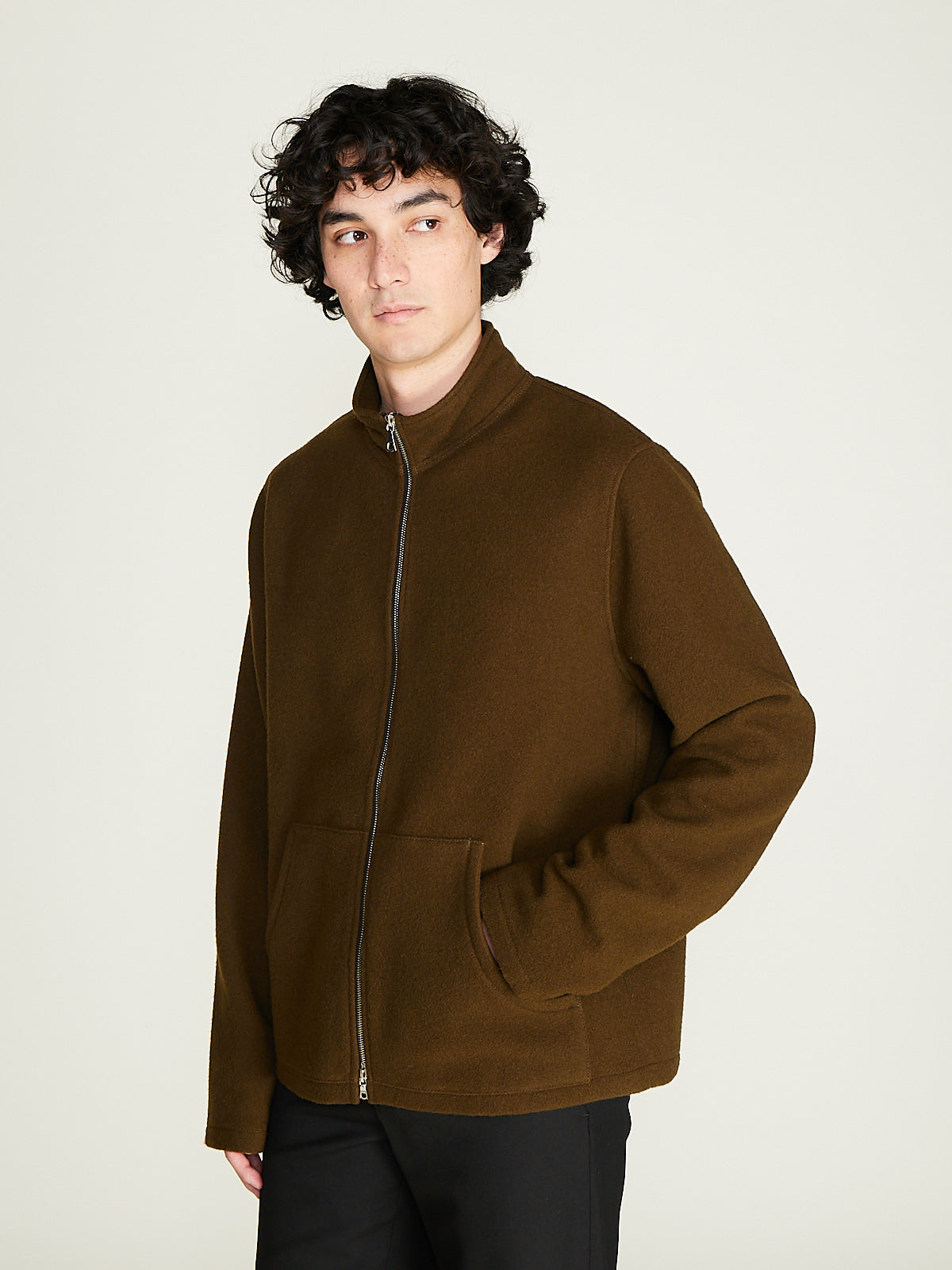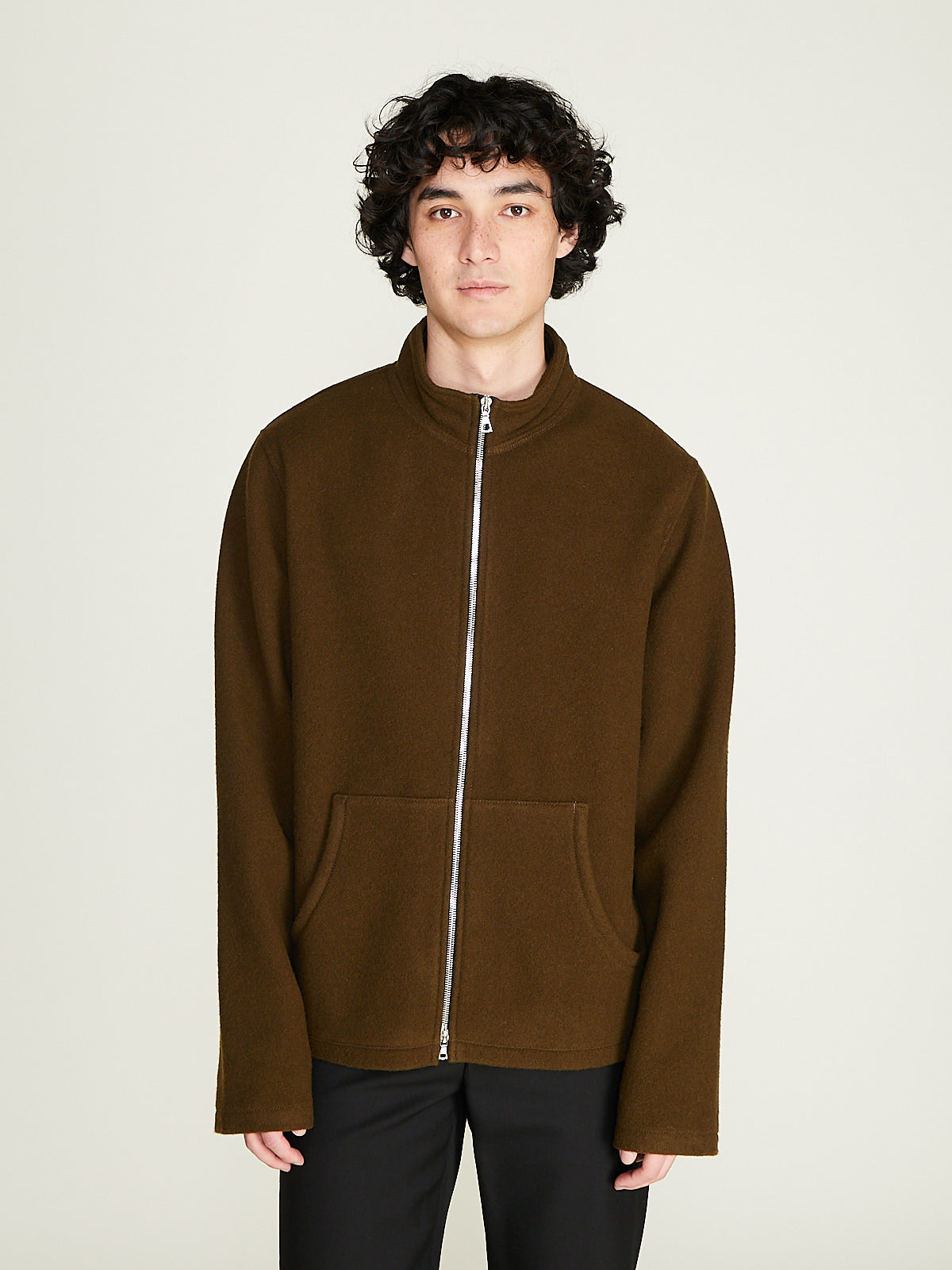 Unisex sweater in lightweight brown natural wool fleece-pile. Stand collar, front zip fastening and long sleeves. Slip pockets on the front and a back yoke. Features a completely unlined interior and an utility loop in the back. Regular fit.