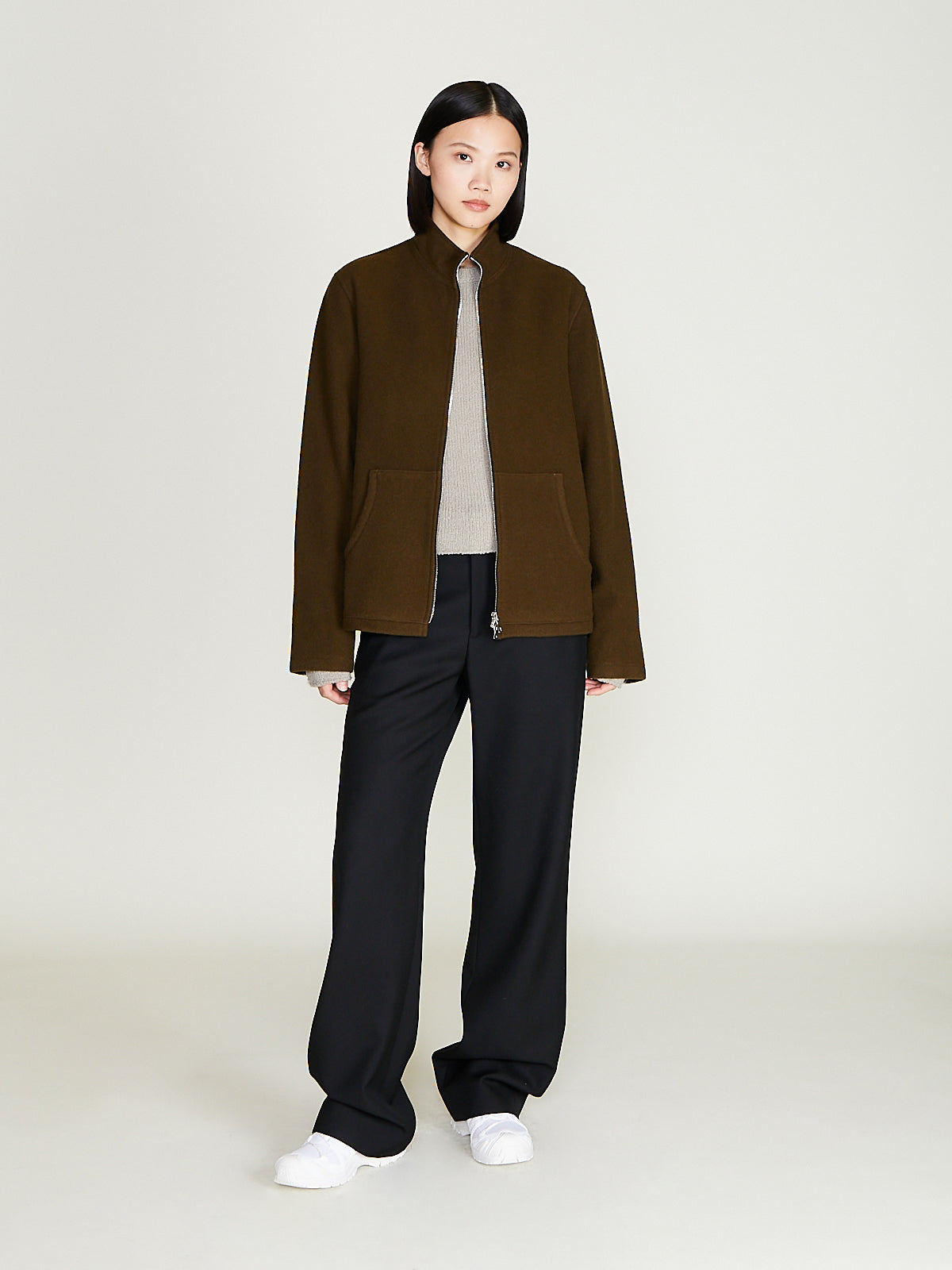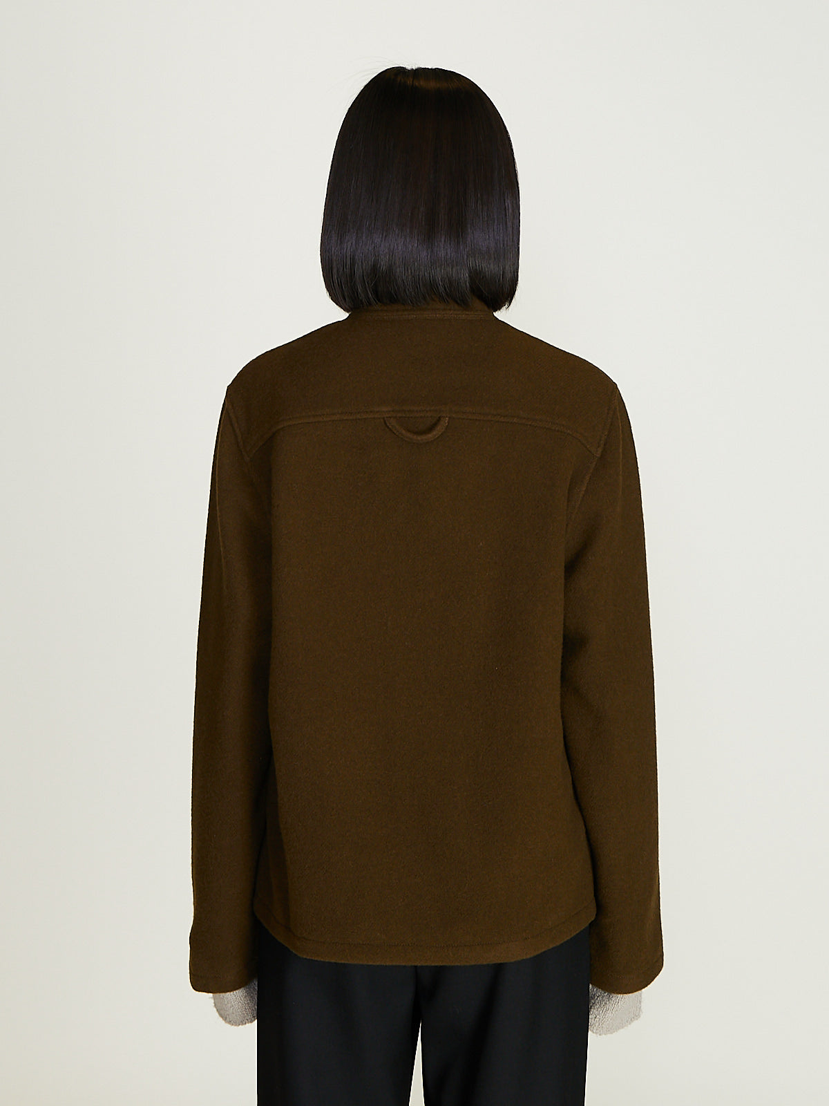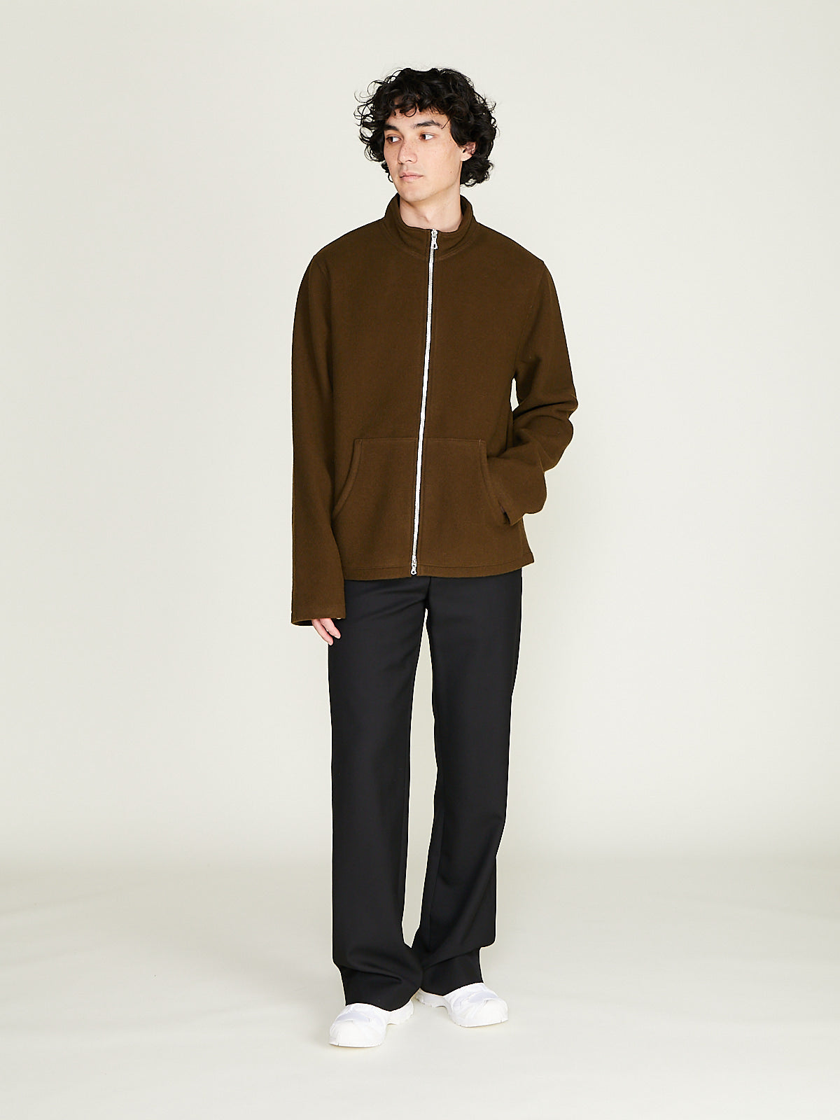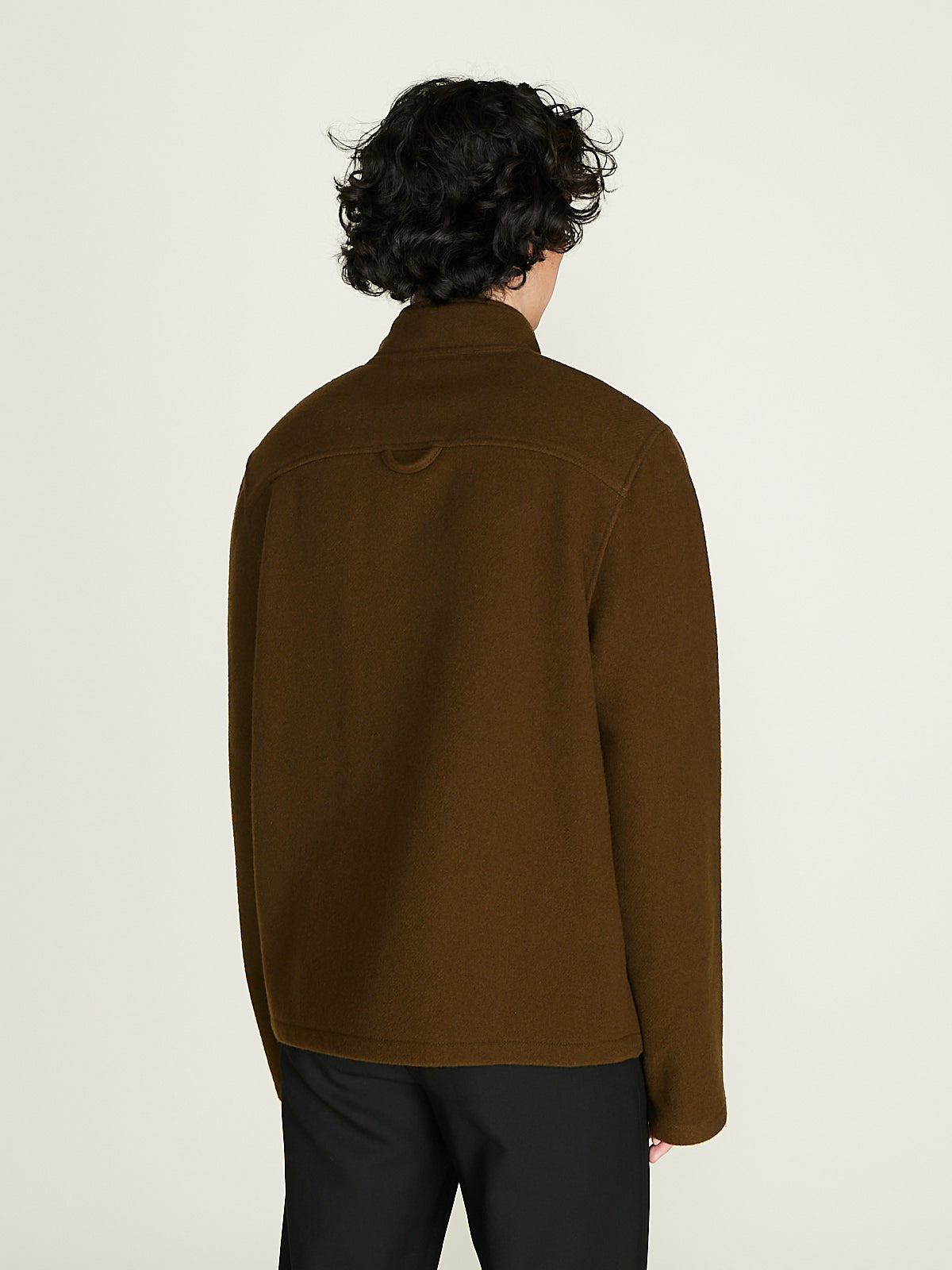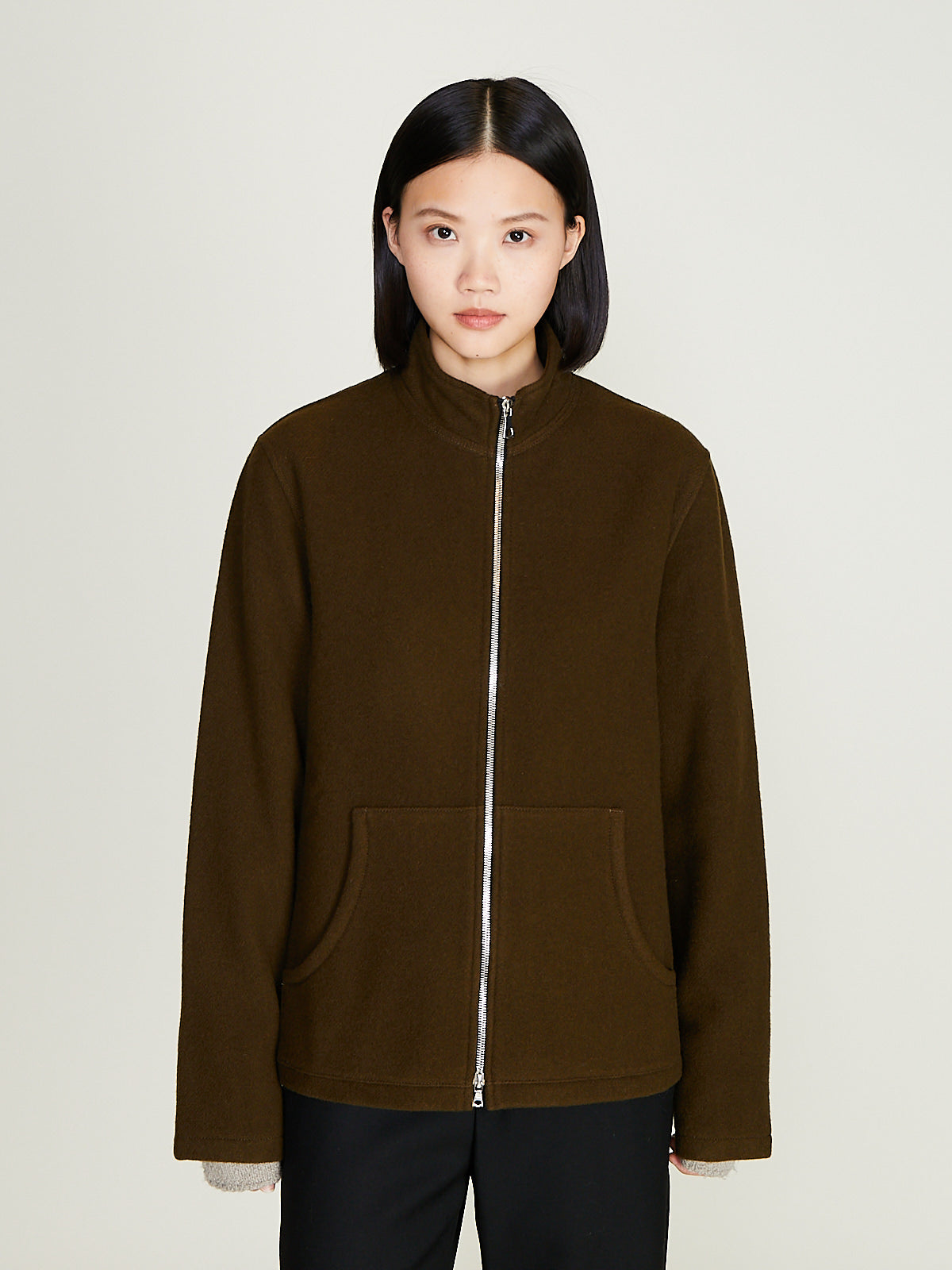 Unisex sweater in lightweight brown natural wool fleece-pile. Stand collar, front zip fastening and long sleeves. Slip pockets on the front and a back yoke. Features a completely unlined interior and an utility loop in the back. Regular fit.