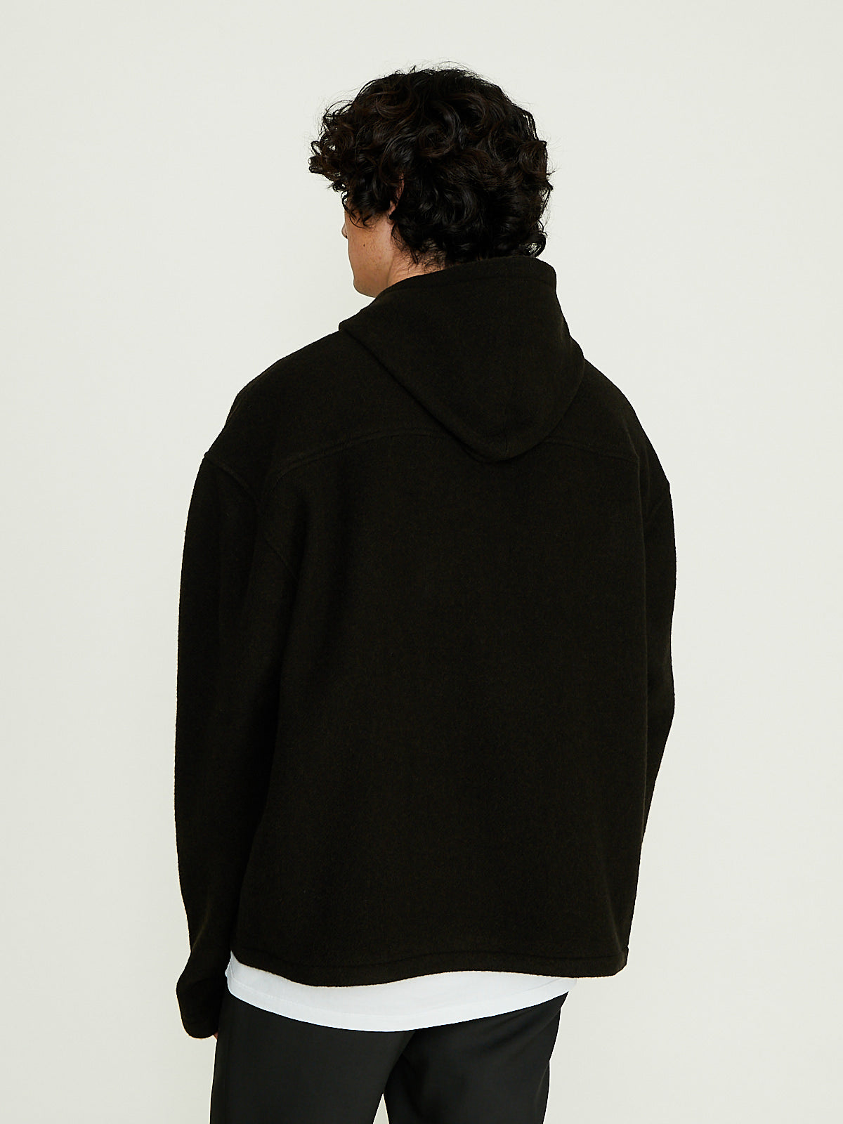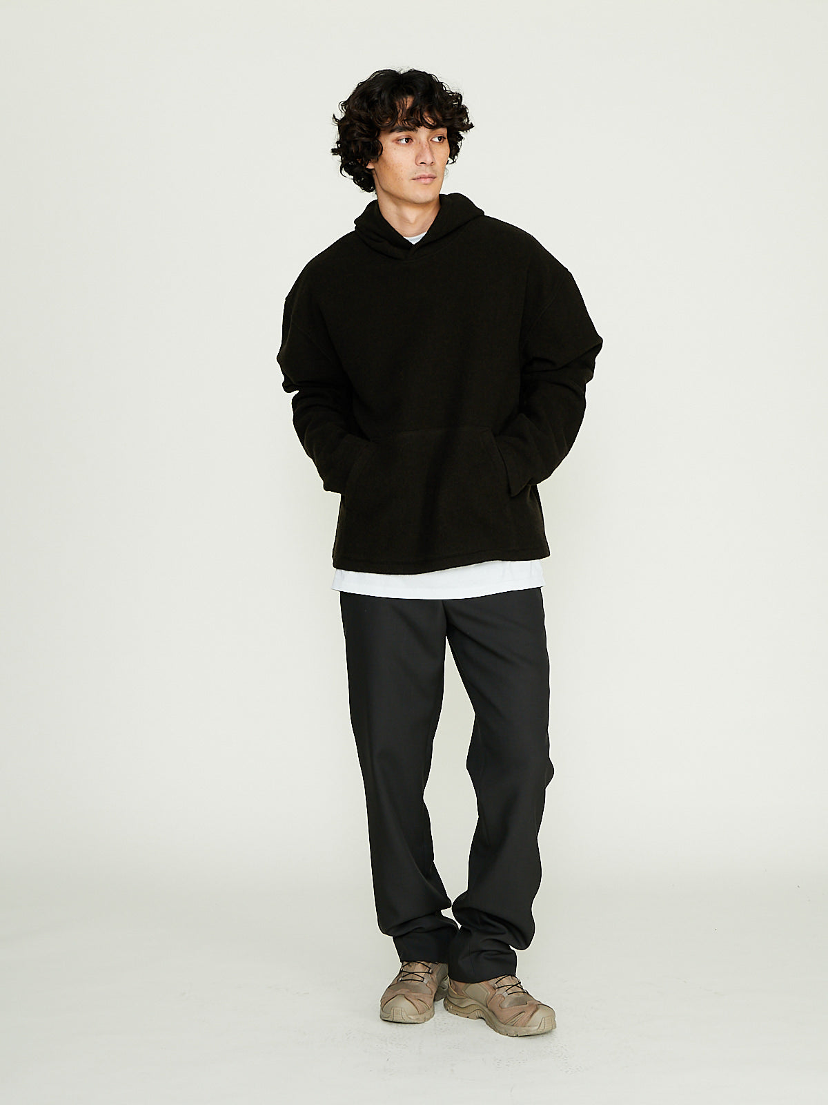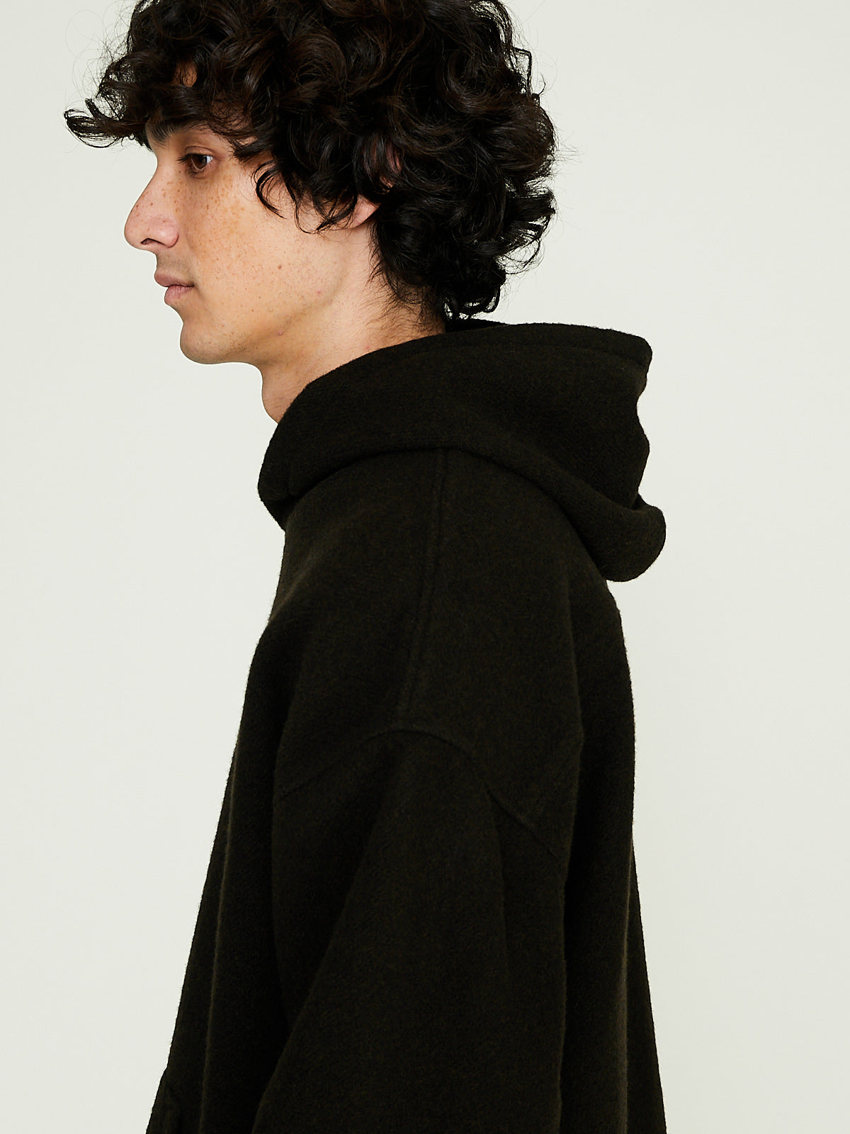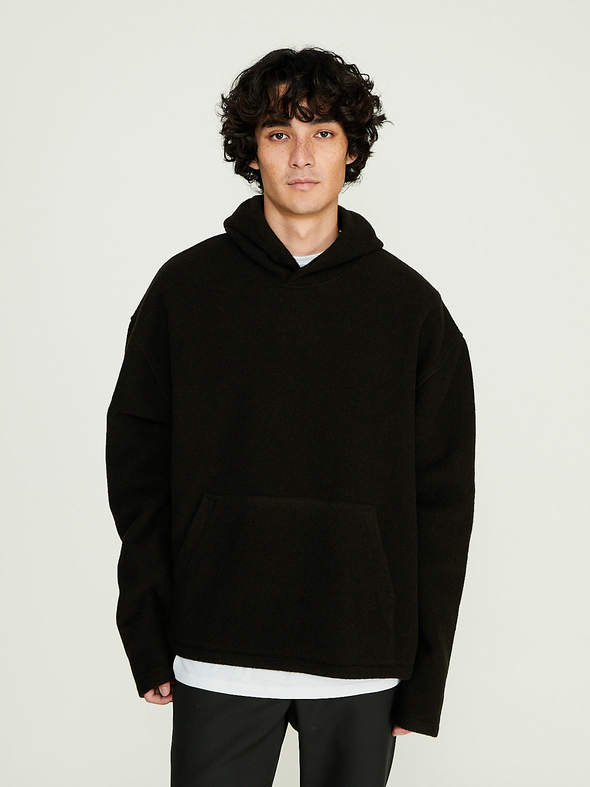 Oversized hoodie in lightweight natural biodegradable dark brown wool fleece-pile with a fluffy soft surface. Long sleeves with a dropped shoulder and a kangaroo pocket on the front. Features a back yoke with a loop detail. Boxy fit.