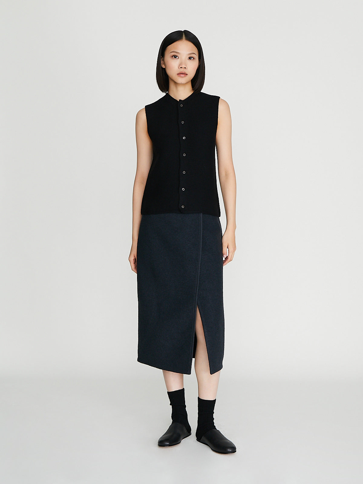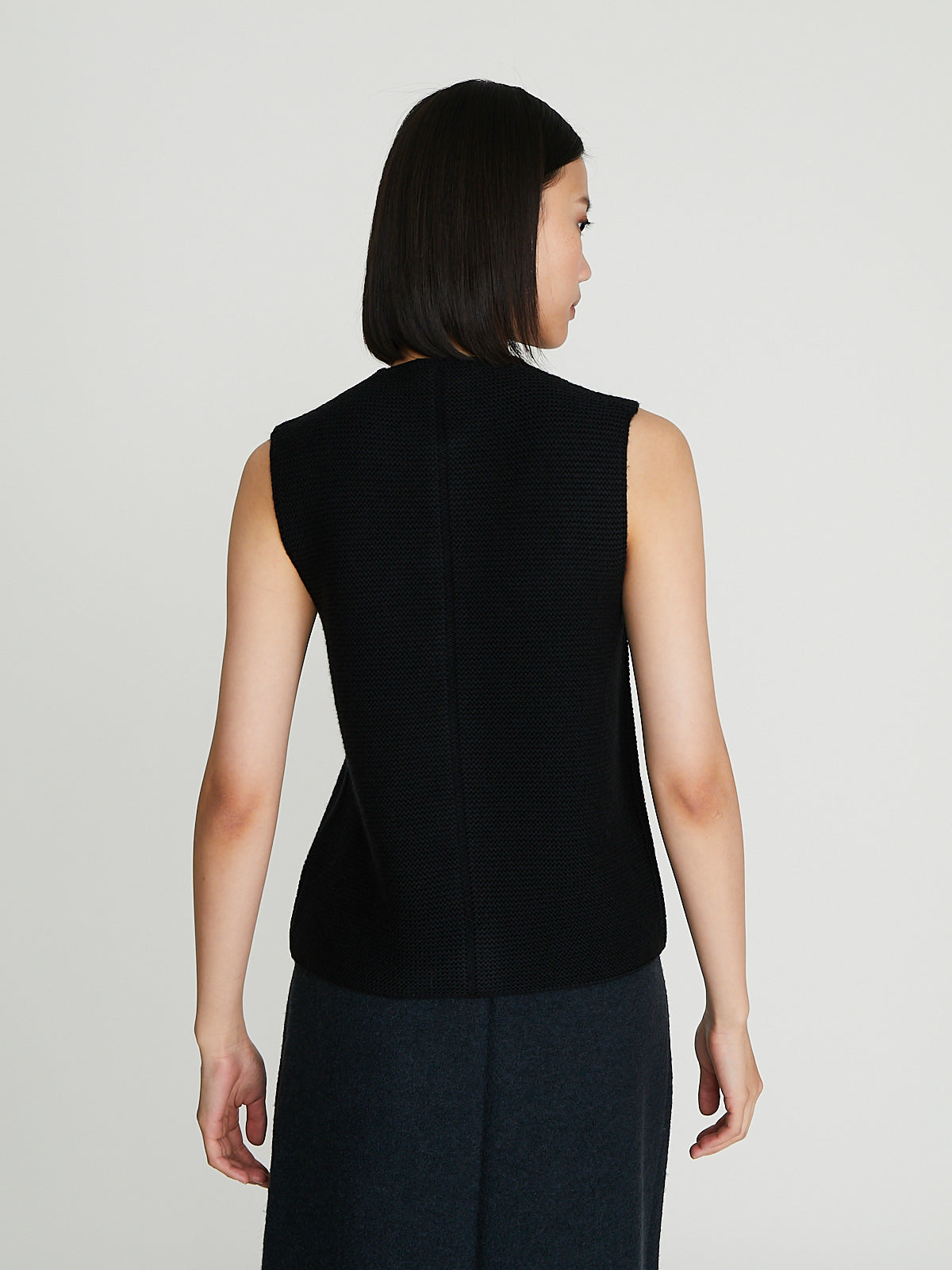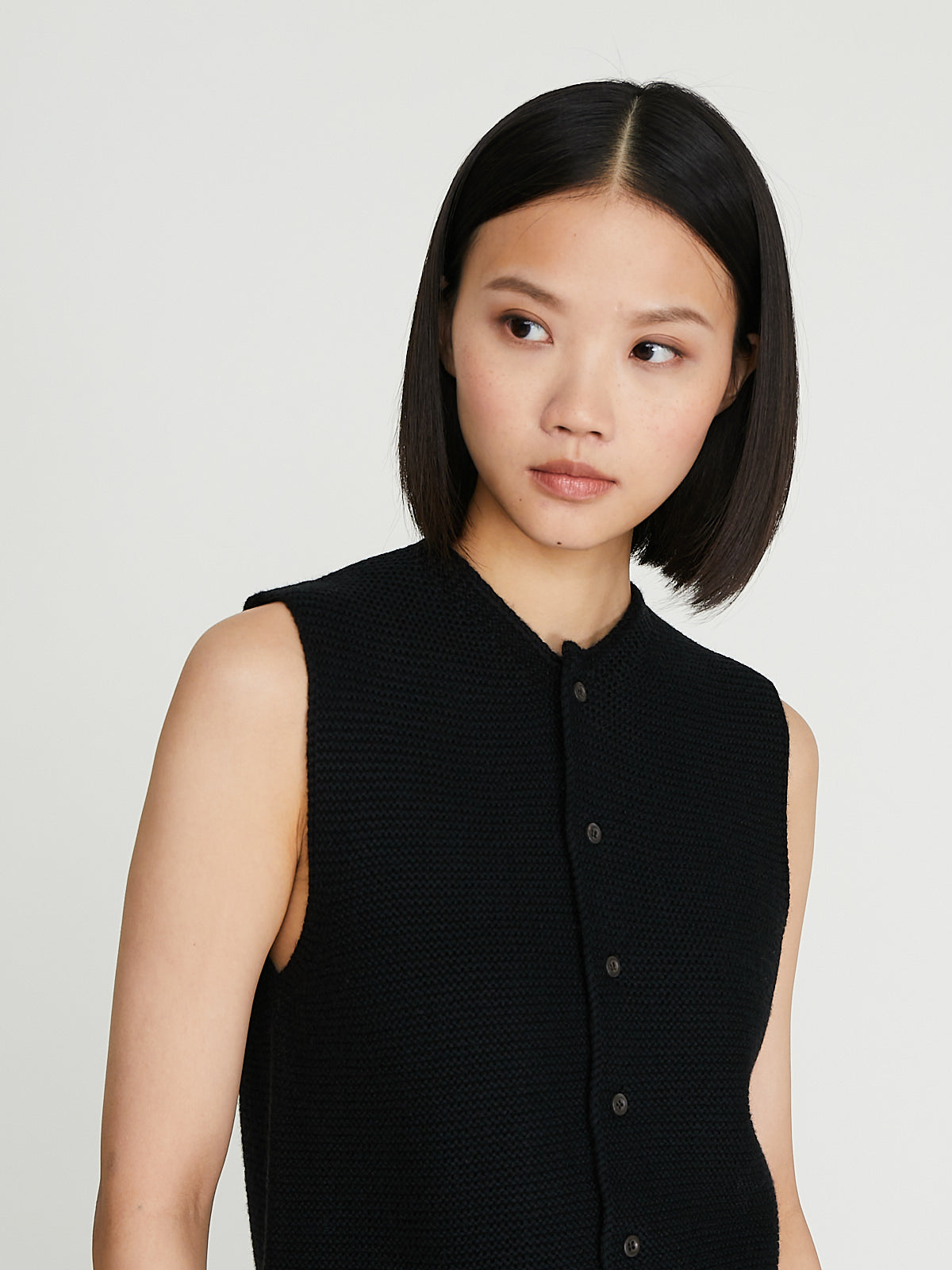 Knitted gilet in black wool. Round neckline and a front mother-of-pearl button fastening. Rib detail around the neck. Boxy fit.