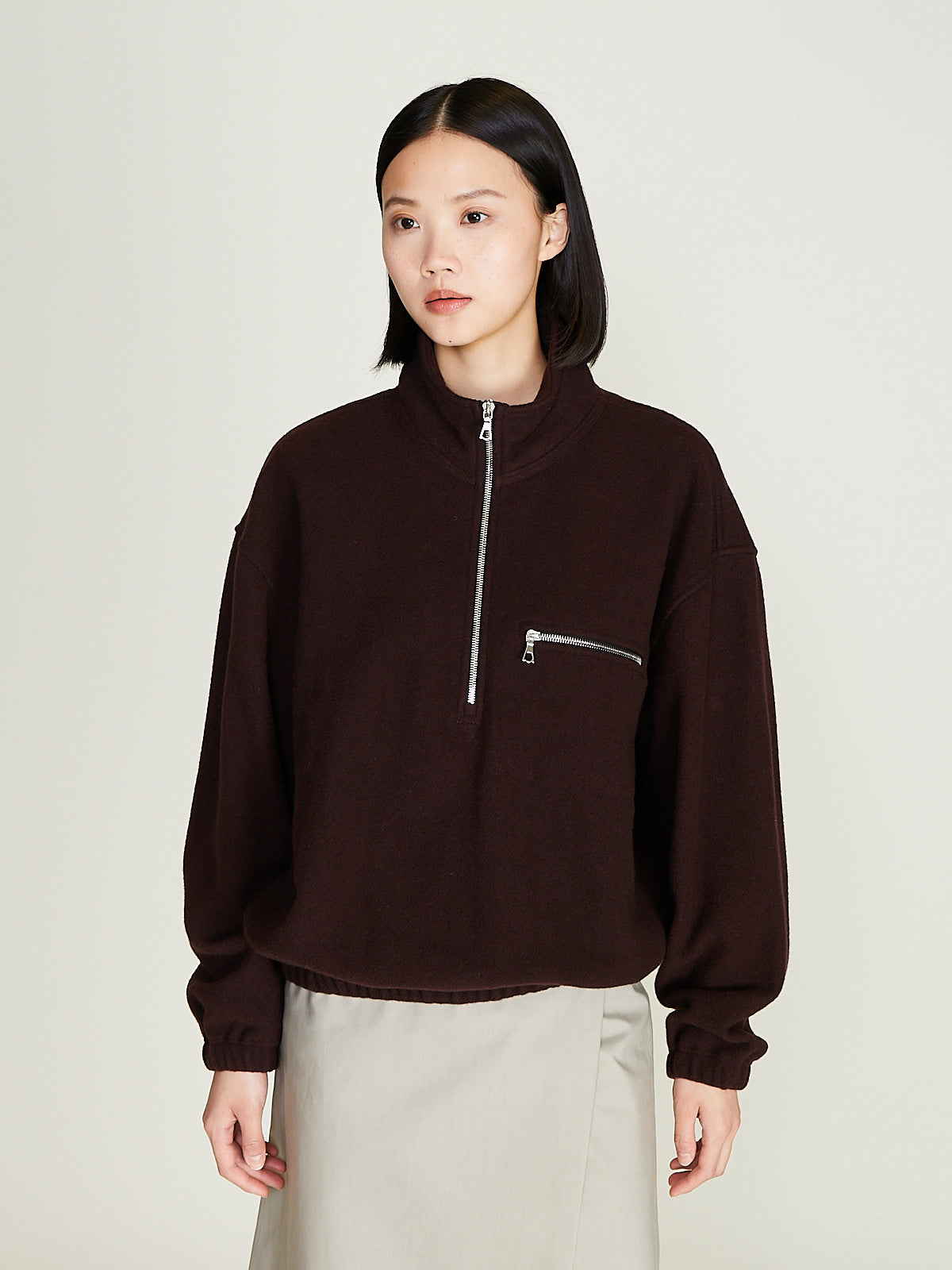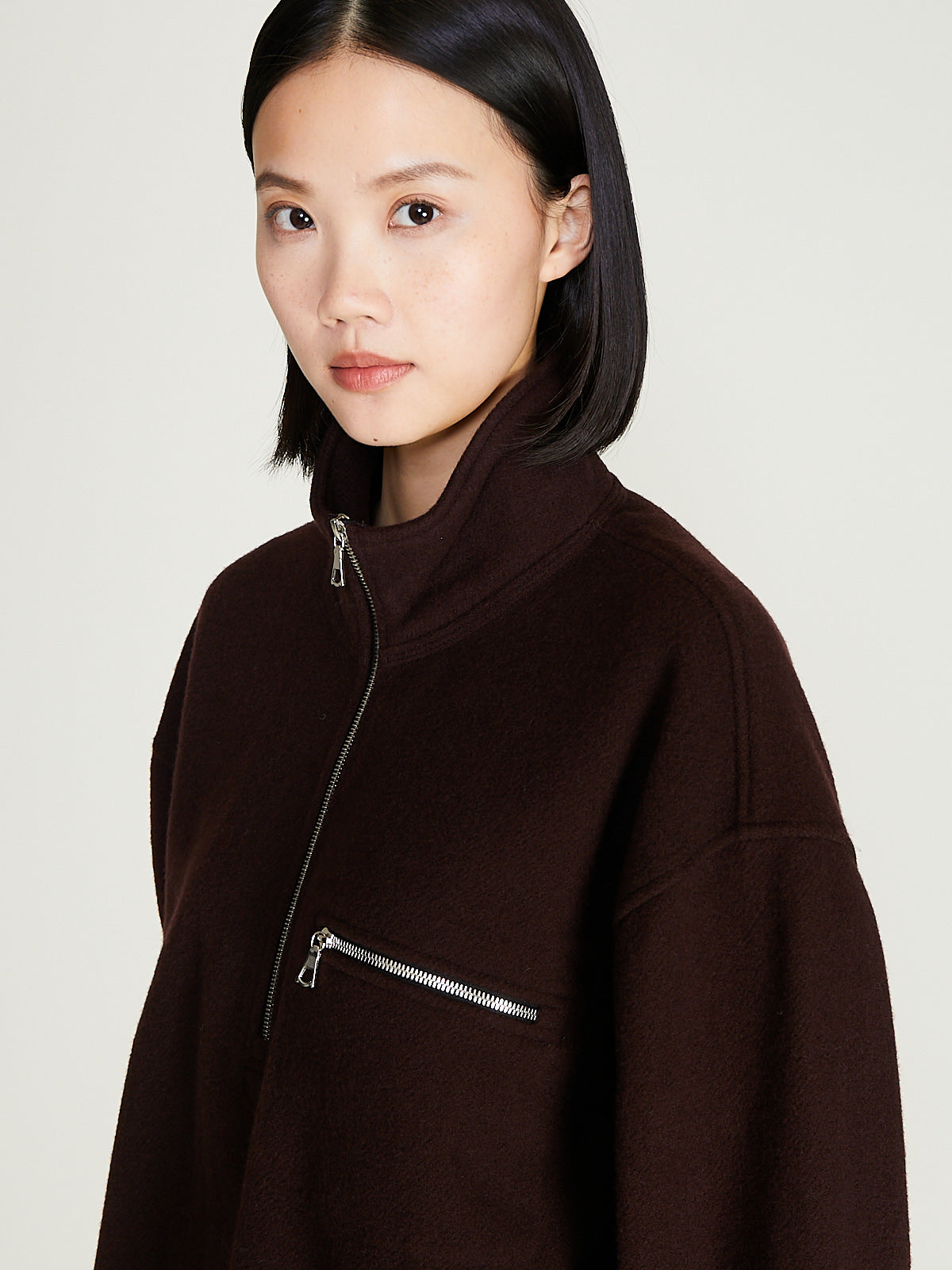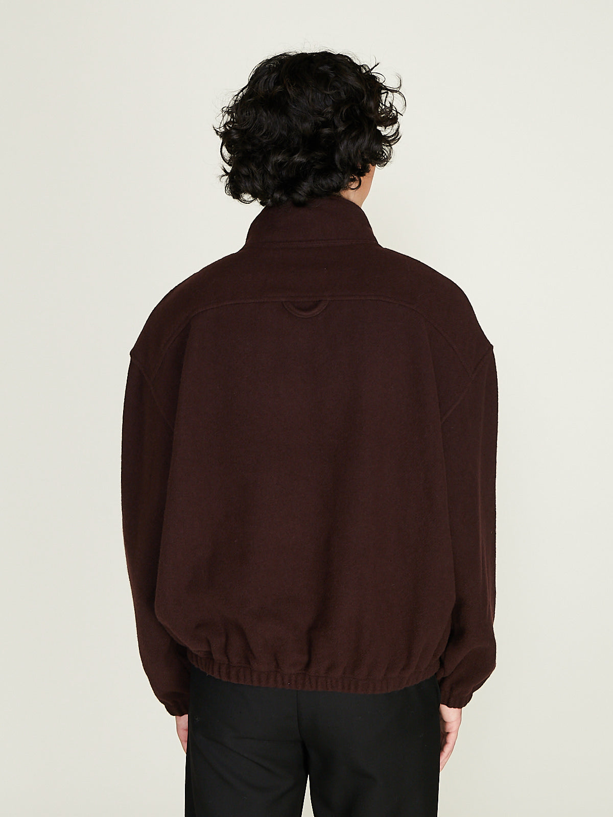 Unisex jacket in lightweight, natural and biodegradable dark brown wool fleece-pile. Stand collar, a partial front zip fastening and long sleeves with a dropped shoulder with elasticated cuffs. Chest pocket with a zip fastening. Back yoke with a loop detail. Elasticated bottom hem. Regular fit. Unlined.