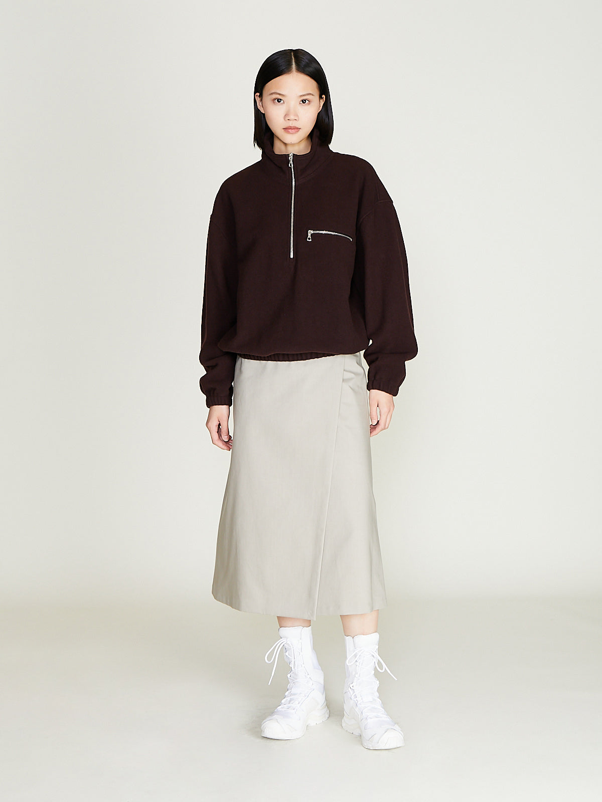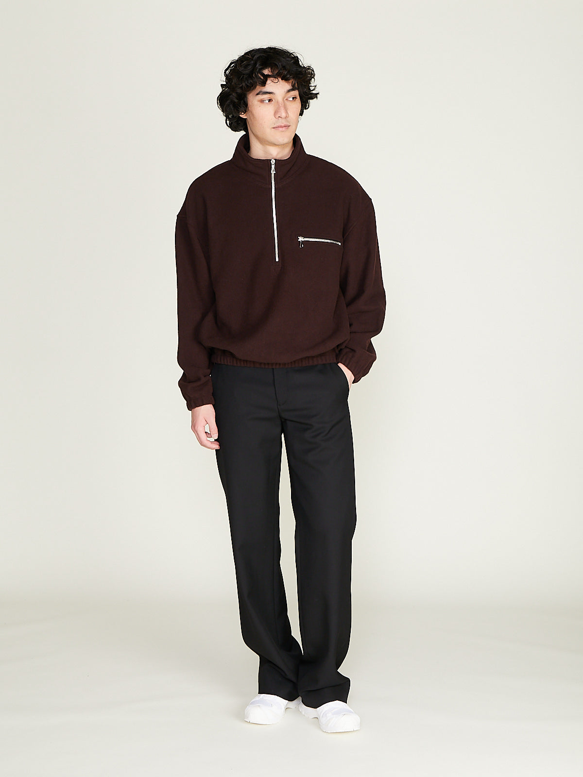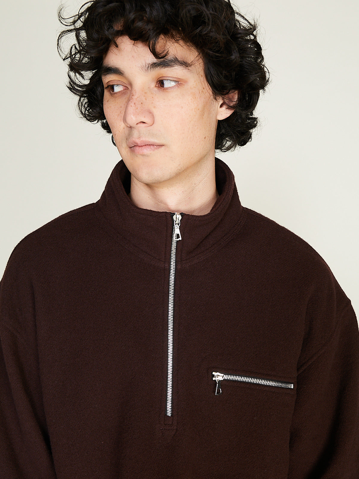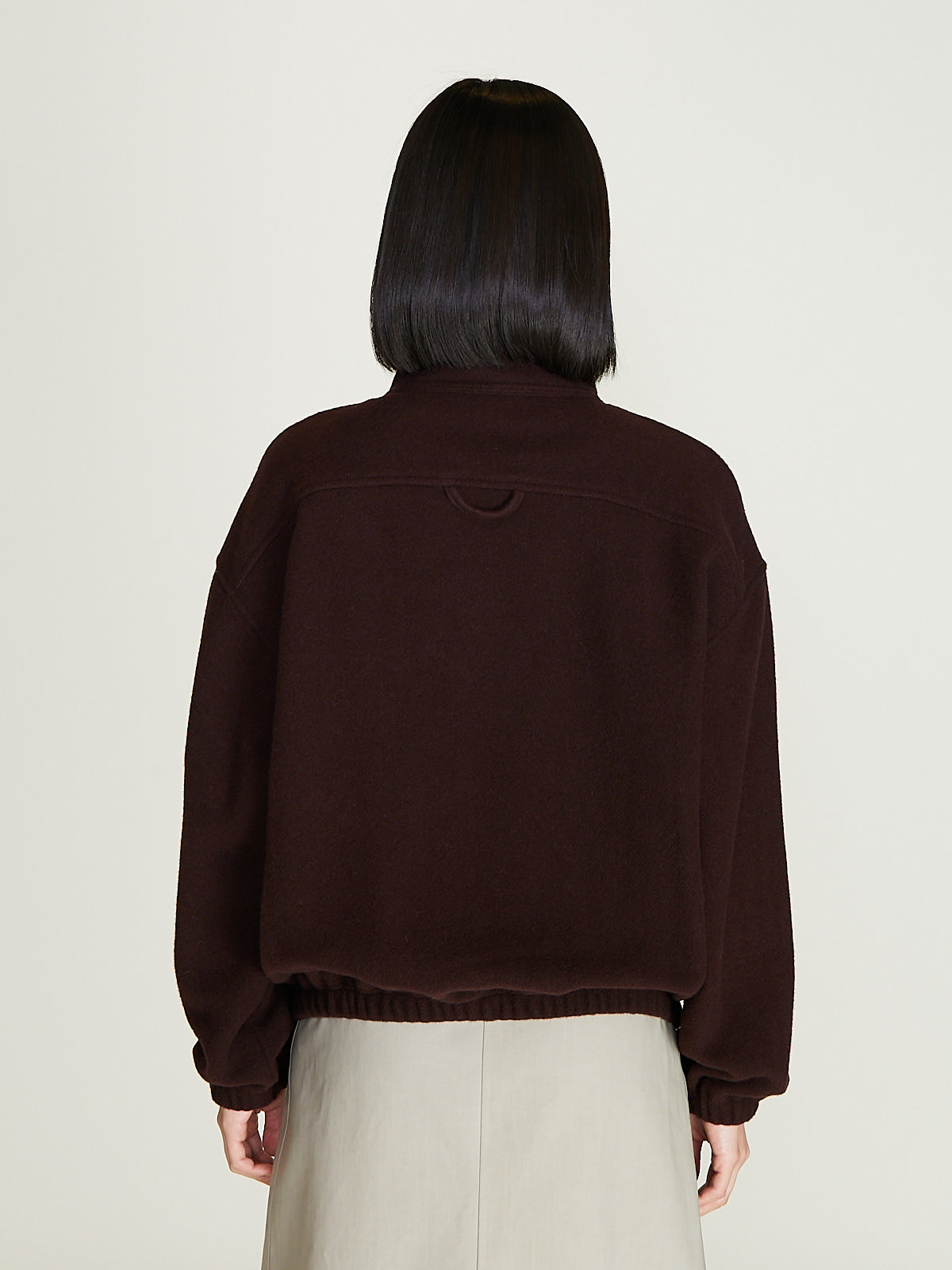 Unisex jacket in lightweight, natural and biodegradable dark brown wool fleece-pile. Stand collar, a partial front zip fastening and long sleeves with a dropped shoulder with elasticated cuffs. Chest pocket with a zip fastening. Back yoke with a loop detail. Elasticated bottom hem. Regular fit. Unlined.
