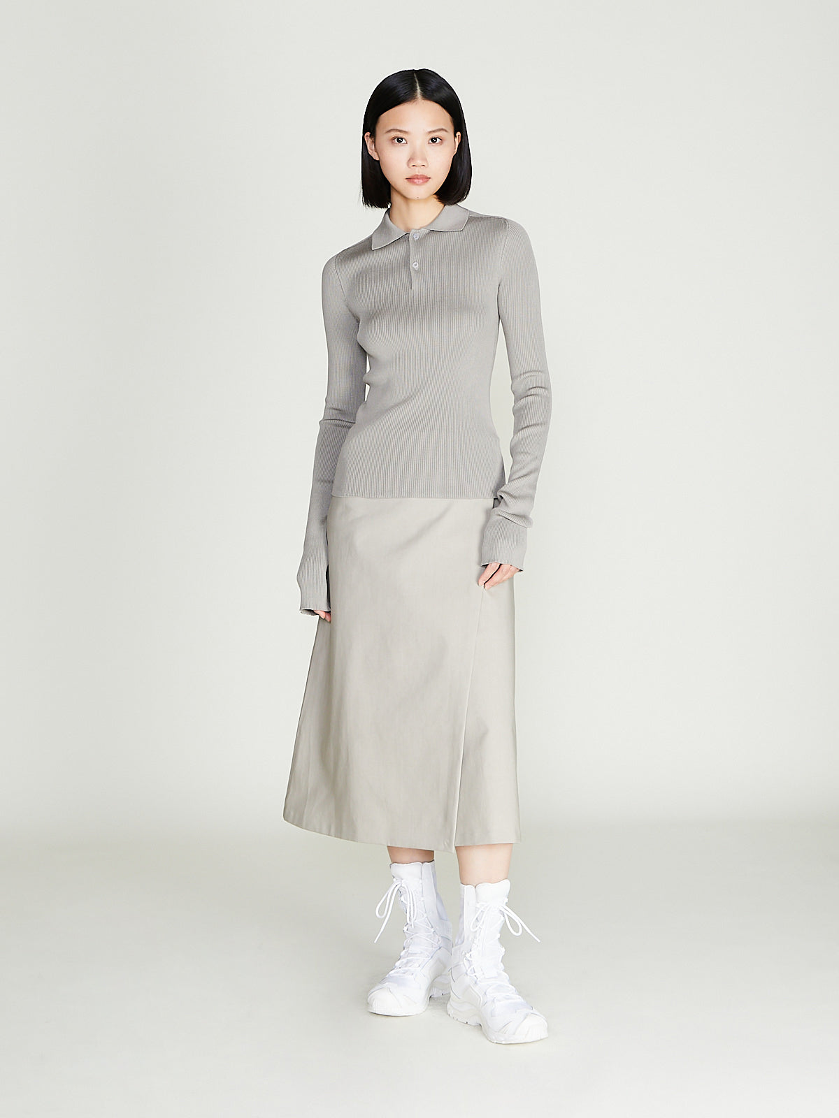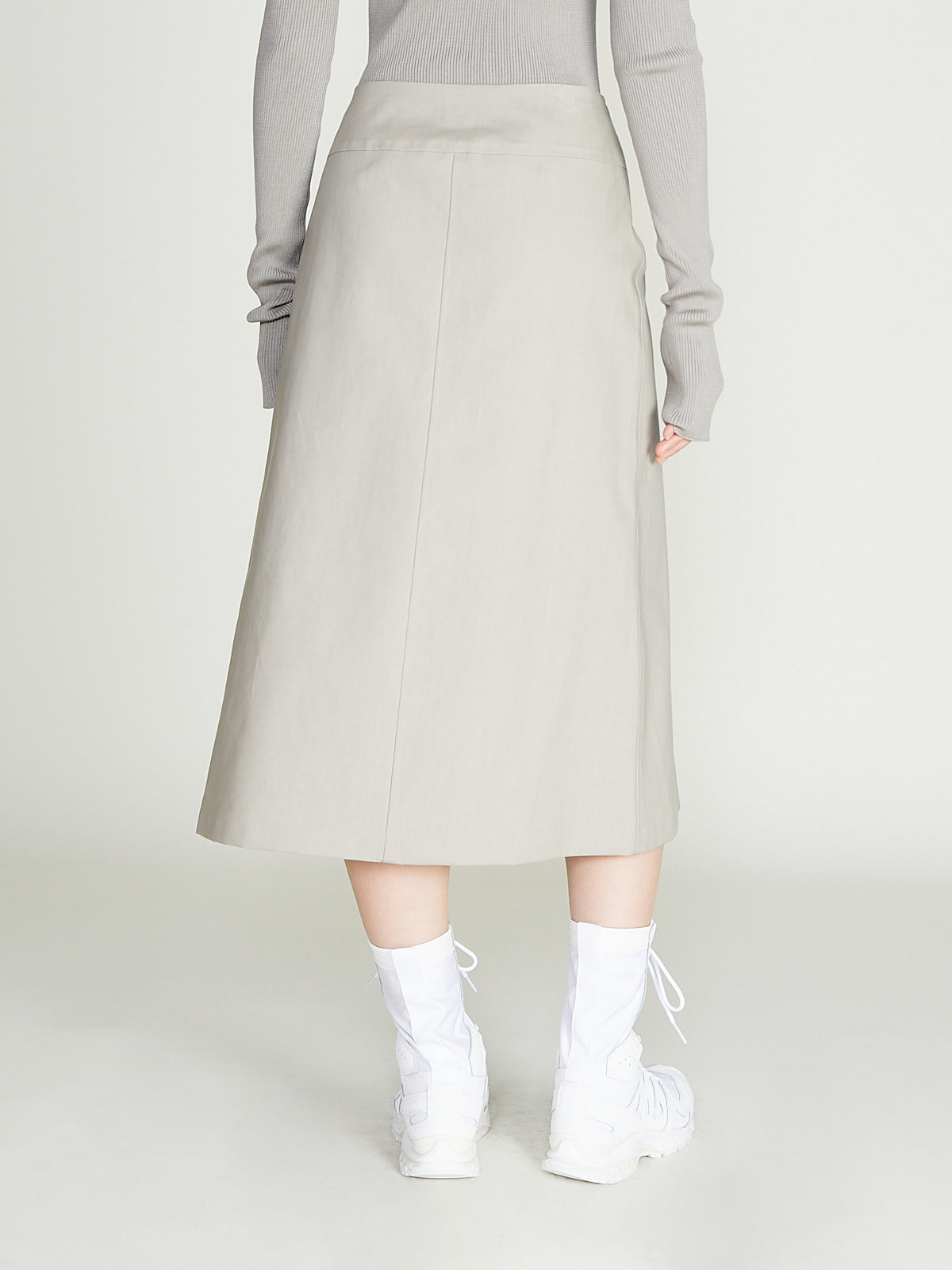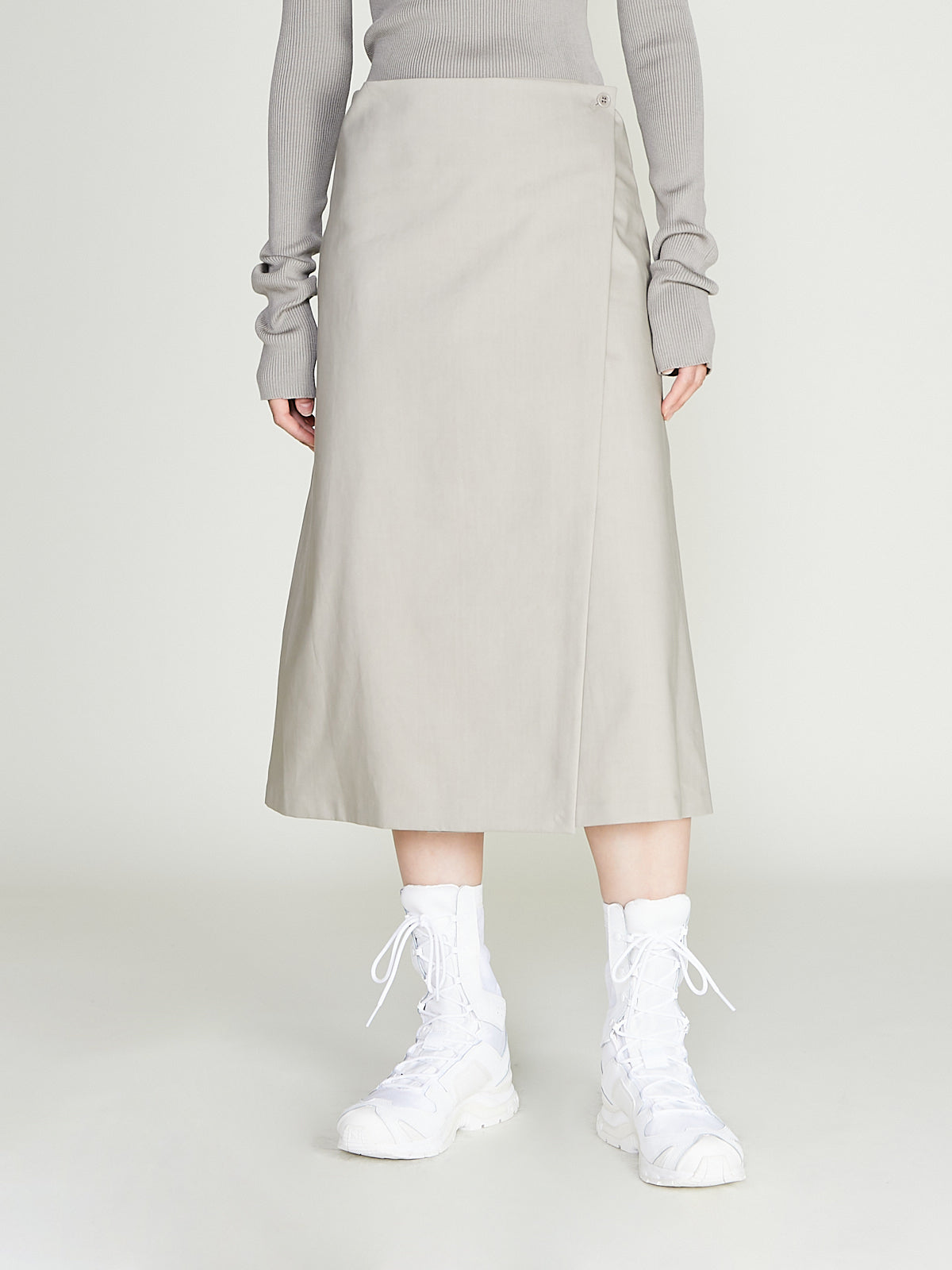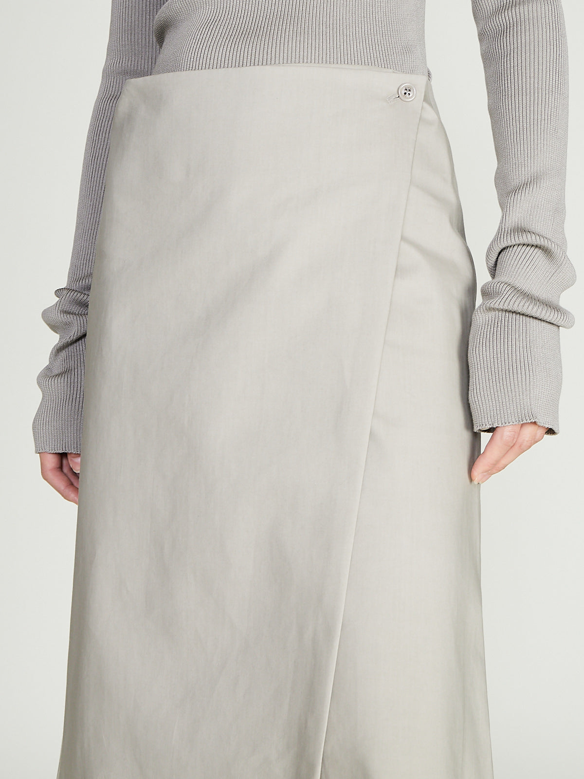 Skirt in grey bonded cotton. Wrap-style with a button fastening at the side of the waist. A-line silhouette. Cuts below-the-knee.