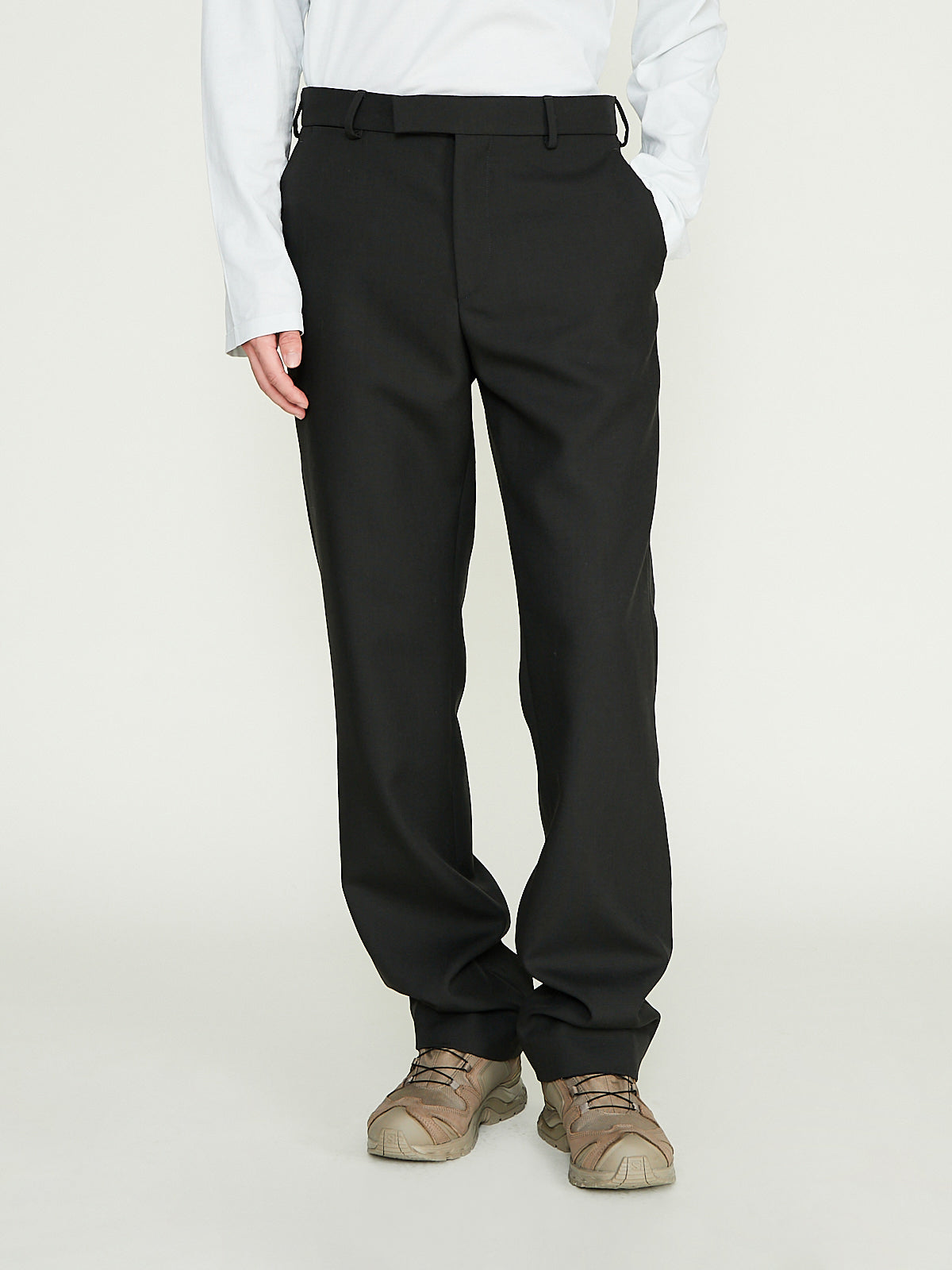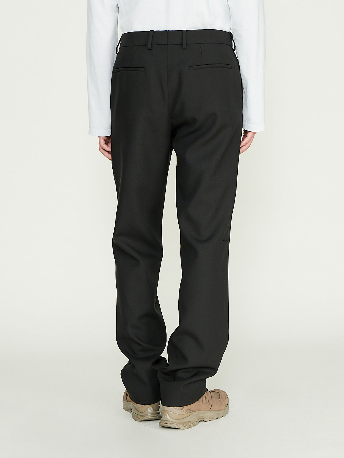 Unisex tailored trouser in dak brown virgin wool. Off-centre hook fastening, zip fly and belt loops. Slash pockets on the front and jetted pockets on the back. Straight legs.